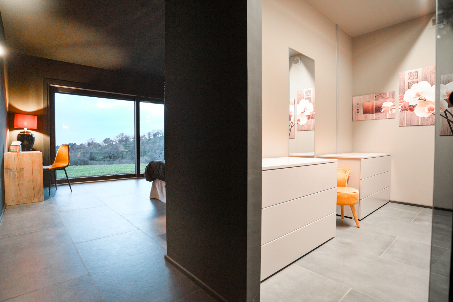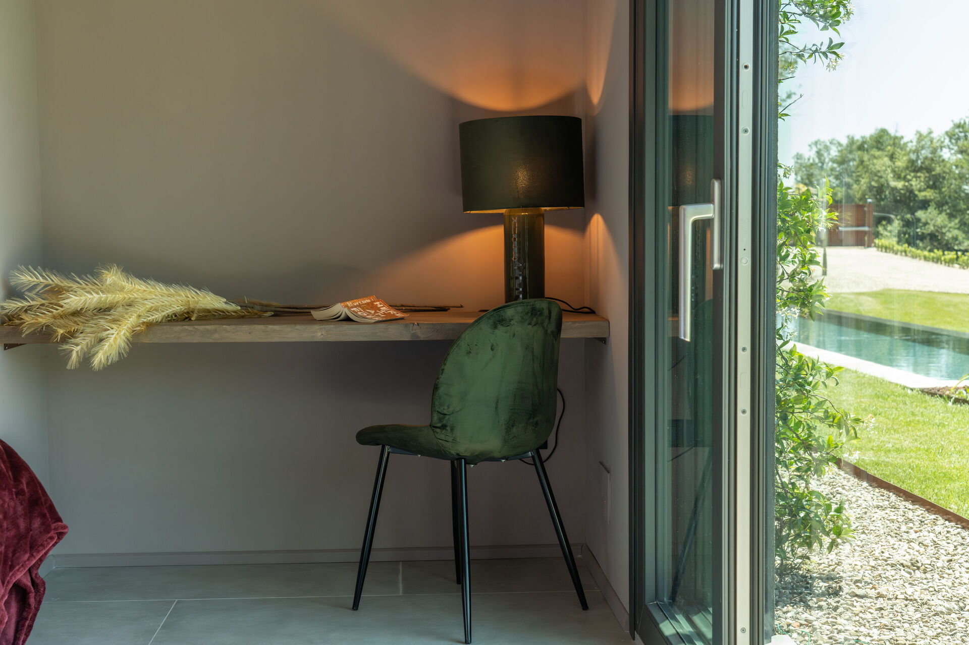 Slaapkamer met badkamer 1: tweepersoonsbed, WIFI internet, airconditioning, fauteuil, bureau, wastafel, toilet , bidet, douche, haardroger, wasdroger, wasmachine, uitgang naar de tuin.