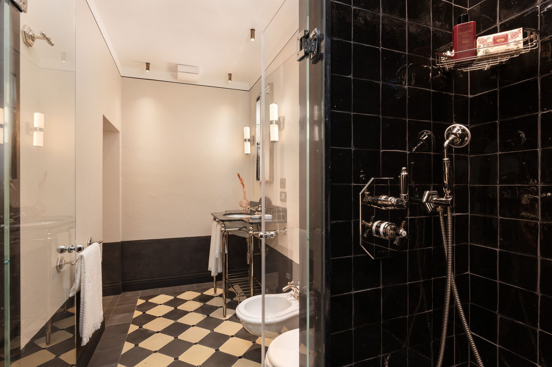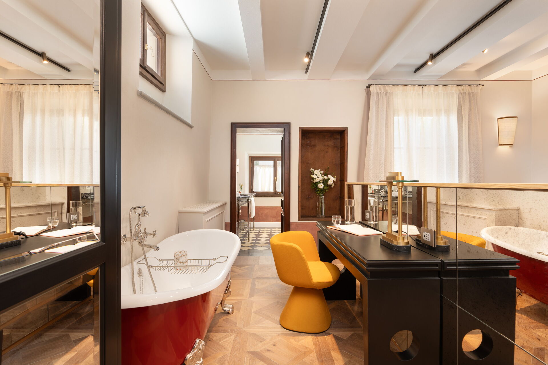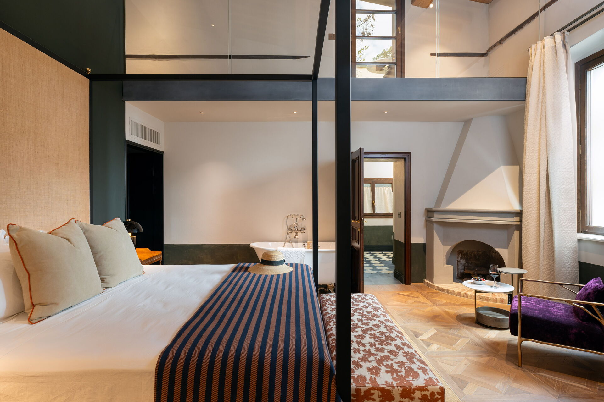 Slaapkamer met badkamer 1: king size bed (breedte: 180m, lengte: 200m), WIFI internet, airconditioning, wastafel, toilet , bidet, bad, douche, haardroger, uitgang naar het terras, vide.