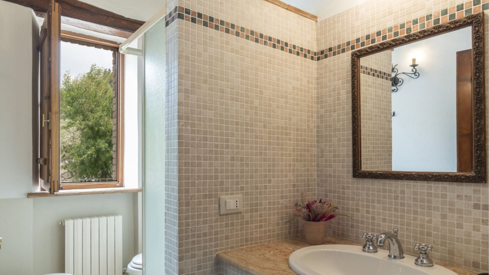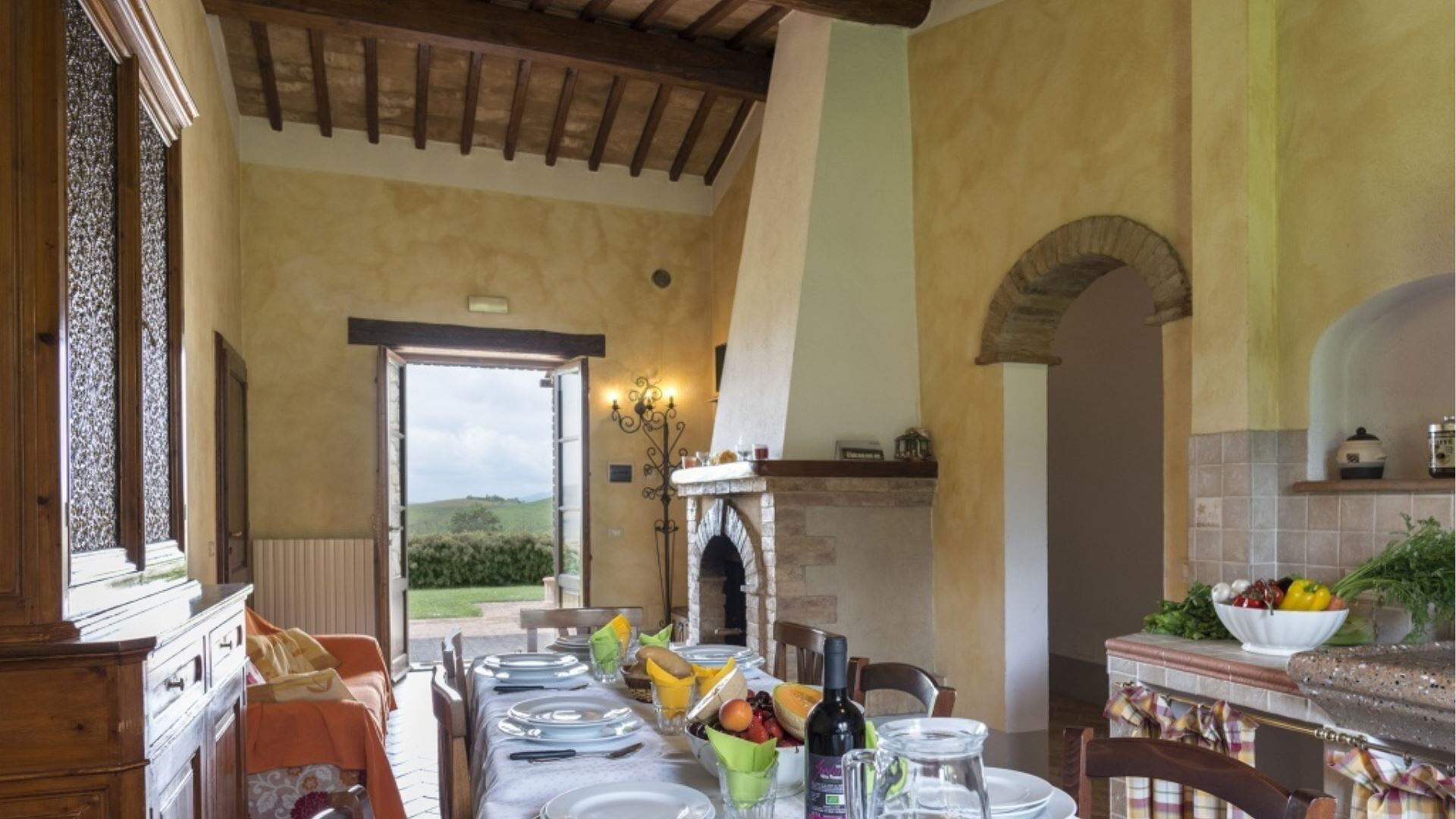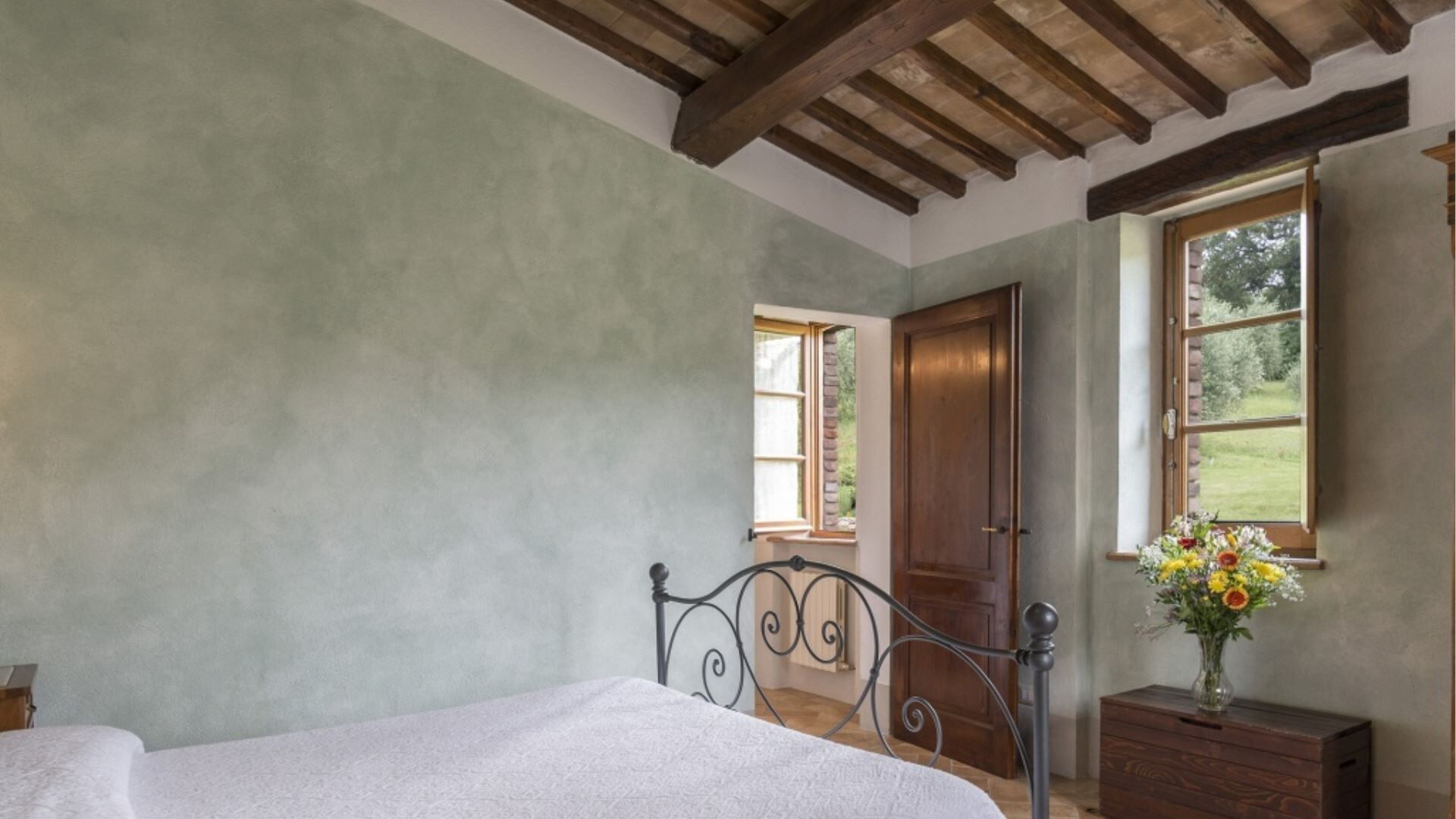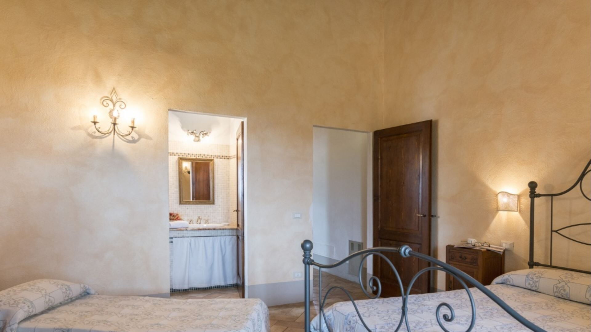 De accommodatie van Podere Aurora beslaat één verdieping en bestaat uit twee afzonderlijke appartementen die samen slaapgelegenheid bieden voor 8 gasten. De indeling omvat in totaal 4 slaapkamers en 4 badkamers, wat comfortabele accommodatie garandeert voor de maximale bezetting. Het appartement Castagno beschikt over een woonkamer met een geïntegreerde kitchenette en open haard, aangevuld met 2 tweepersoonsslaapkamers, elk met een eigen en suite badkamer. Het appartement Faggio biedt een ruime open configuratie waarin de keuken en eetkamer met open haard zijn gecombineerd, van waaruit een kleine hal leidt naar de slaapvertrekken. Dit appartement bevat 2 tweepersoonsslaapkamers, één met een en suite badkamer met douche en de andere met een aparte badkamer met douche. De en suite slaapkamer in Faggio beschikt tevens over een fauteuil-bed en directe toegang naar buiten. In beide appartementen profiteren de lichte kamers van meerdere toegangspunten naar de buitenruimtes, en zijn er plafondventilatoren geïnstalleerd in de slaapkamers om comfortabele luchtcirculatie te garanderen.