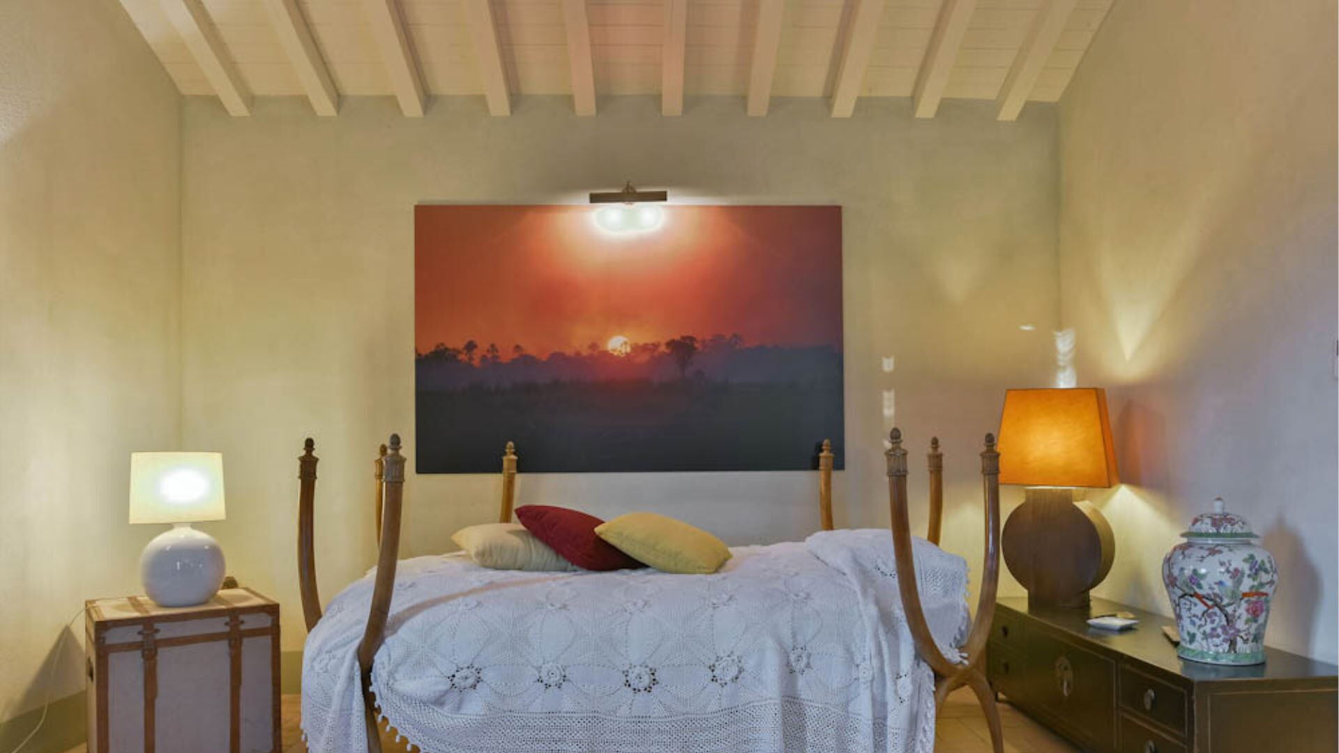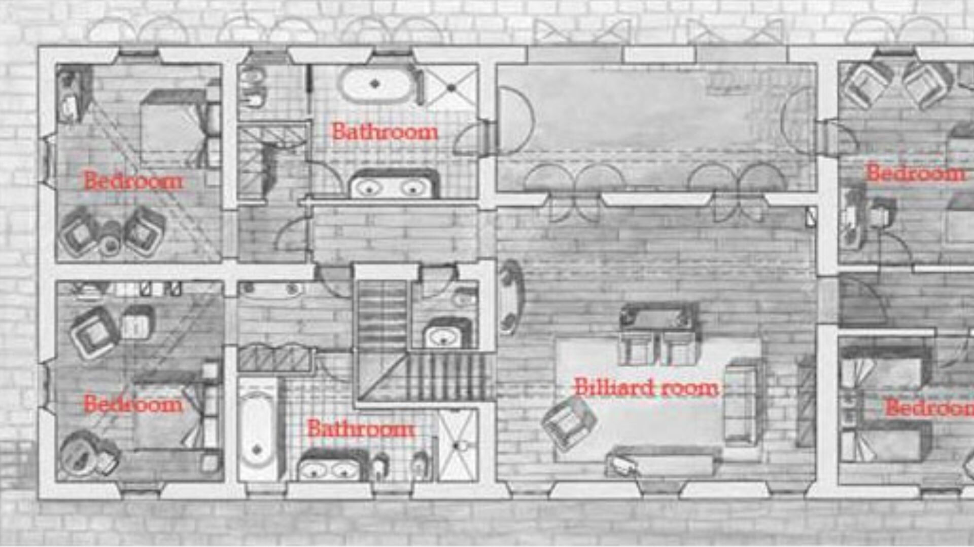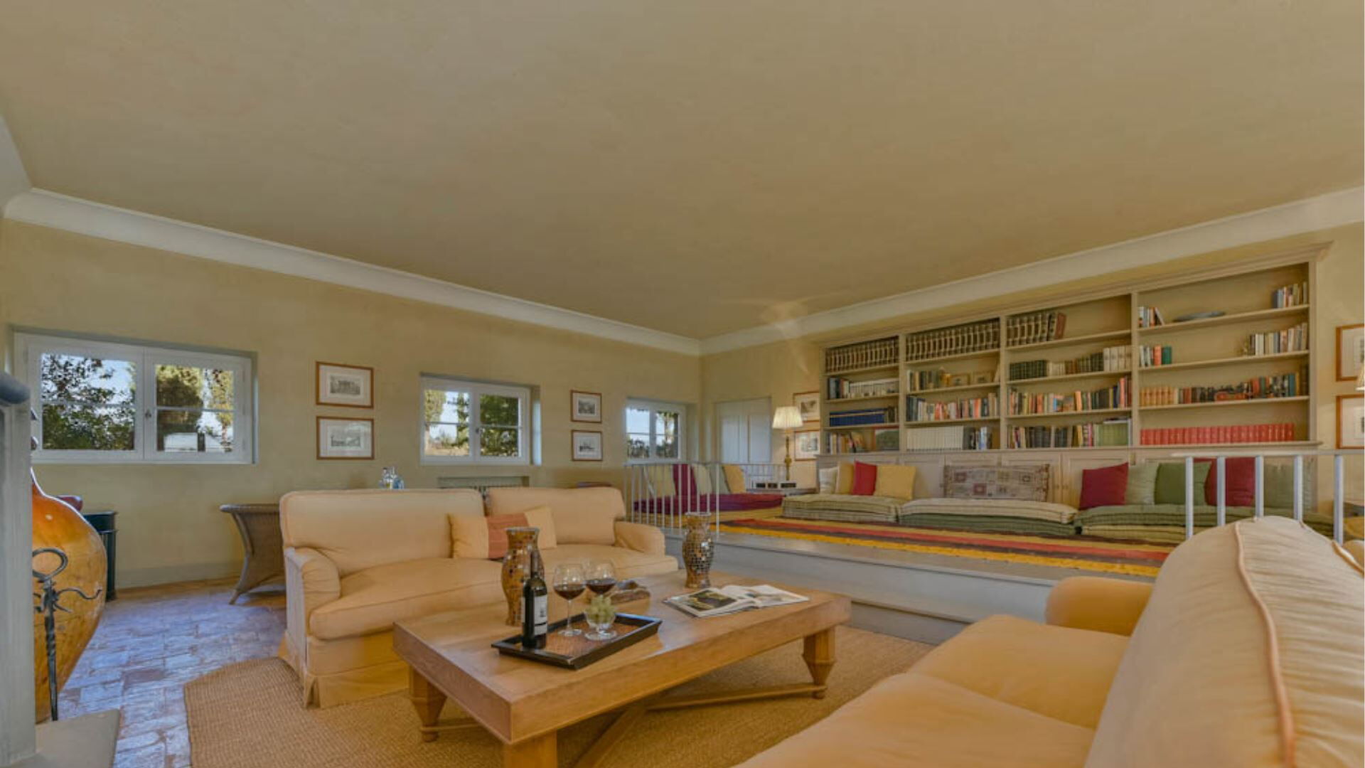 Het hoofdgebouw beslaat twee verdiepingen en biedt uitzonderlijke ruimte voor comfortabel wonen. De begane grond biedt een televisiekamer, een uitgebreide woonkamer met een open haard, een computer- en faxkantoor, een eetkamer met een eigen open haard, een volledig uitgeruste keuken, een wasruimte en een opslagruimte. De eerste verdieping is gewijd aan de slaapvertrekken, bestaande uit twee tweepersoonsslaapkamers elk vergezeld van een eigen badkamer en garderobekast, twee extra tweepersoonskamers met ensuite badkamers, een slaapkamer ingericht met een kingsize bed, en een tweepersoonskamer met twee aparte bedden, waarbij deze laatste twee kamers een badkamer delen die zowel een douche als bad omvat. Het aparte bijgebouw biedt een slaapkamer, een badkamer met douche, en een woonkamer met een eenpersoons slaapbank samen met een kitchenette. Deze configuratie biedt plaats aan maximaal 14 gasten verdeeld over 7 slaapkamers met 7 badkamers verspreid over het gehele pand.