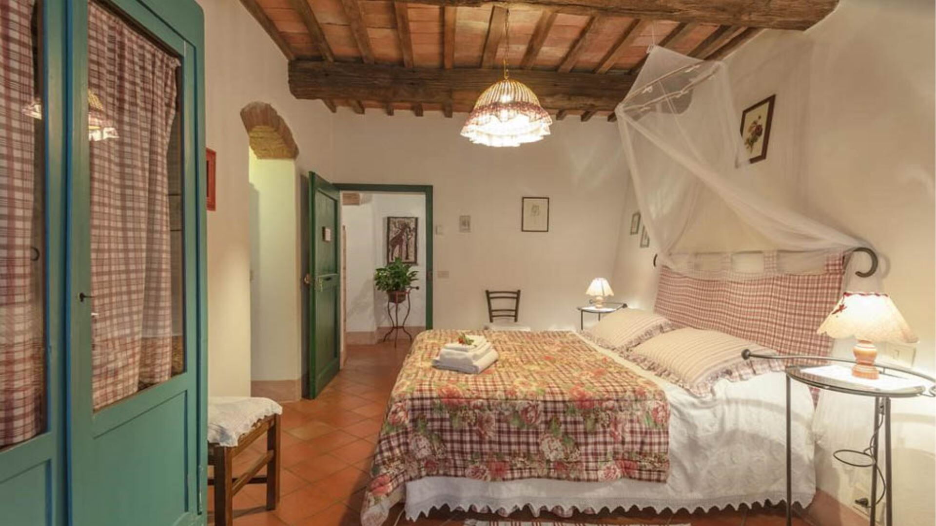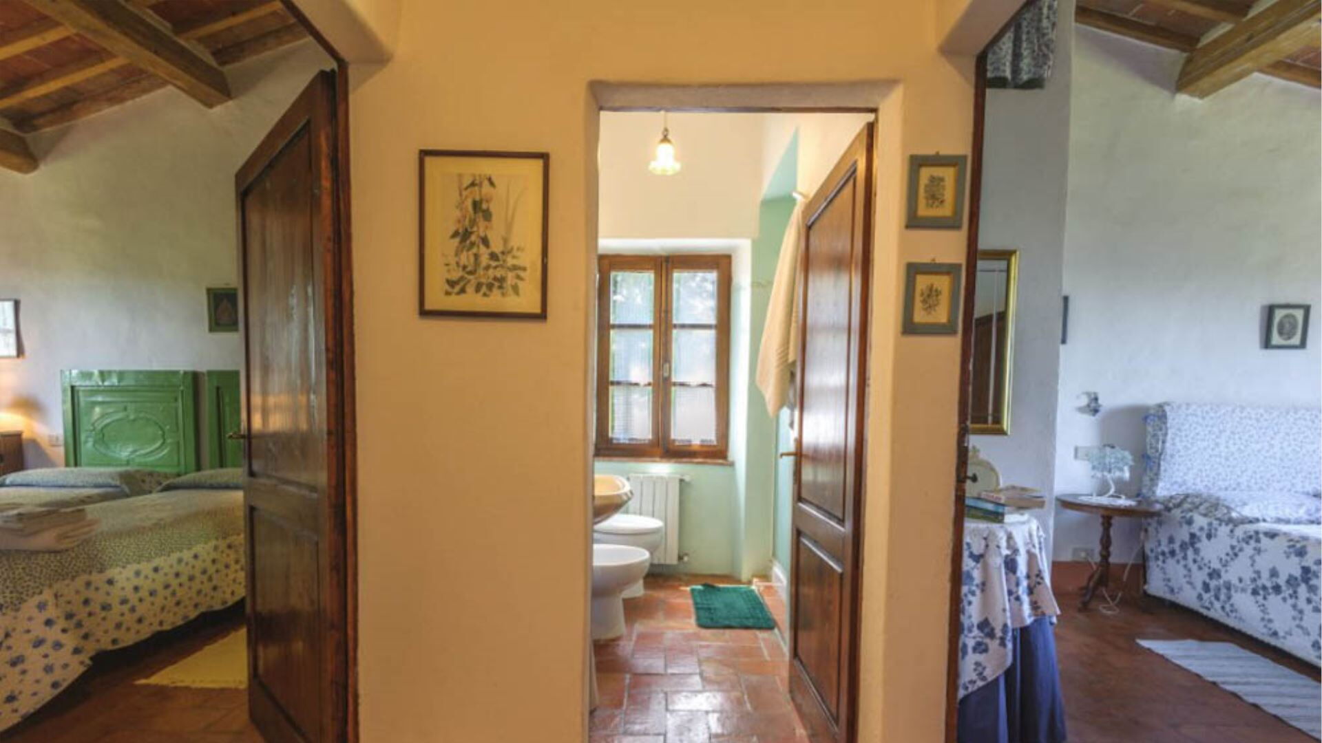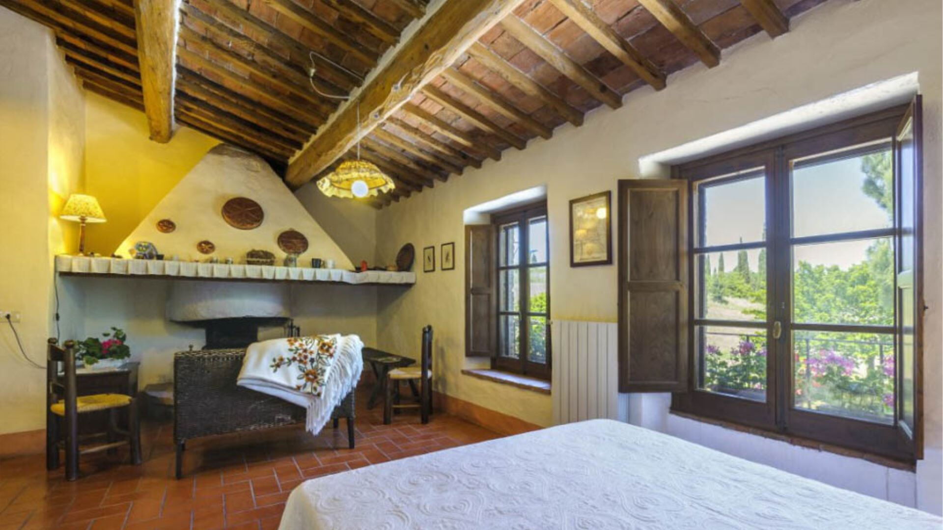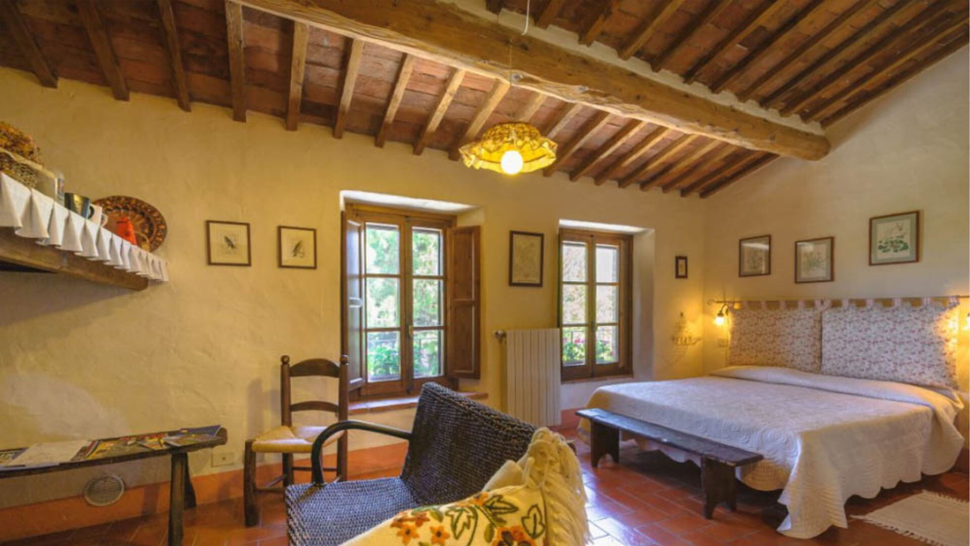 Deze onafhankelijke villa biedt plaats aan maximaal 21 gasten verdeeld over 10 slaapkamers en 8 badkamers. De accommodatie bestaat uit 6 individuele kamers en 2 appartementen, allemaal uitgerust met eigen badkamers met douches. Op de begane grond vindt u de Archetto kamer, een intieme en romantische ruimte met een tweepersoonsbed. De Yellow Room, licht en vrolijk, is ingericht met Provençaalse stoffen en een tweepersoonsbed, en komt direct uit op het gazon. De Green room en Rosa room, beide uitgerust met tweepersoonsbedden, komen uit op pergola's voor de speelplaats. De Triple Room, groot en ruim, is gebouwd in de oude kelder van de boerderij en biedt plaats aan 3 gasten met een tweepersoonsbed en een slaapbank. Op de bovenste verdieping beschikt de Il Focolare kamer over een tweepersoonsbed naast een grote open haard en omvat een kleine kitchenette. Het Apartment Le Persiane bevindt zich op de eerste verdieping, bereikbaar via een stenen trap, en biedt plaats aan 4 personen met een grote keuken, een lichte woonkamer, twee tweepersoonsslaapkamers en een badkamer. Het appartement Il Granaio, ook op de eerste verdieping en bereikbaar via een indrukwekkende stenen trap, beslaat ongeveer 80 vierkante meter voor 4 gasten en bestaat uit een grote keuken en woonkamer, een slaapkamer met twee bedden, een tweepersoonsslaapkamer en een badkamer. Een gemeenschappelijke ruimte en keuken zijn beschikbaar waar alle gasten samen kunnen komen om gezamenlijk maaltijden te bereiden en te nuttigen.