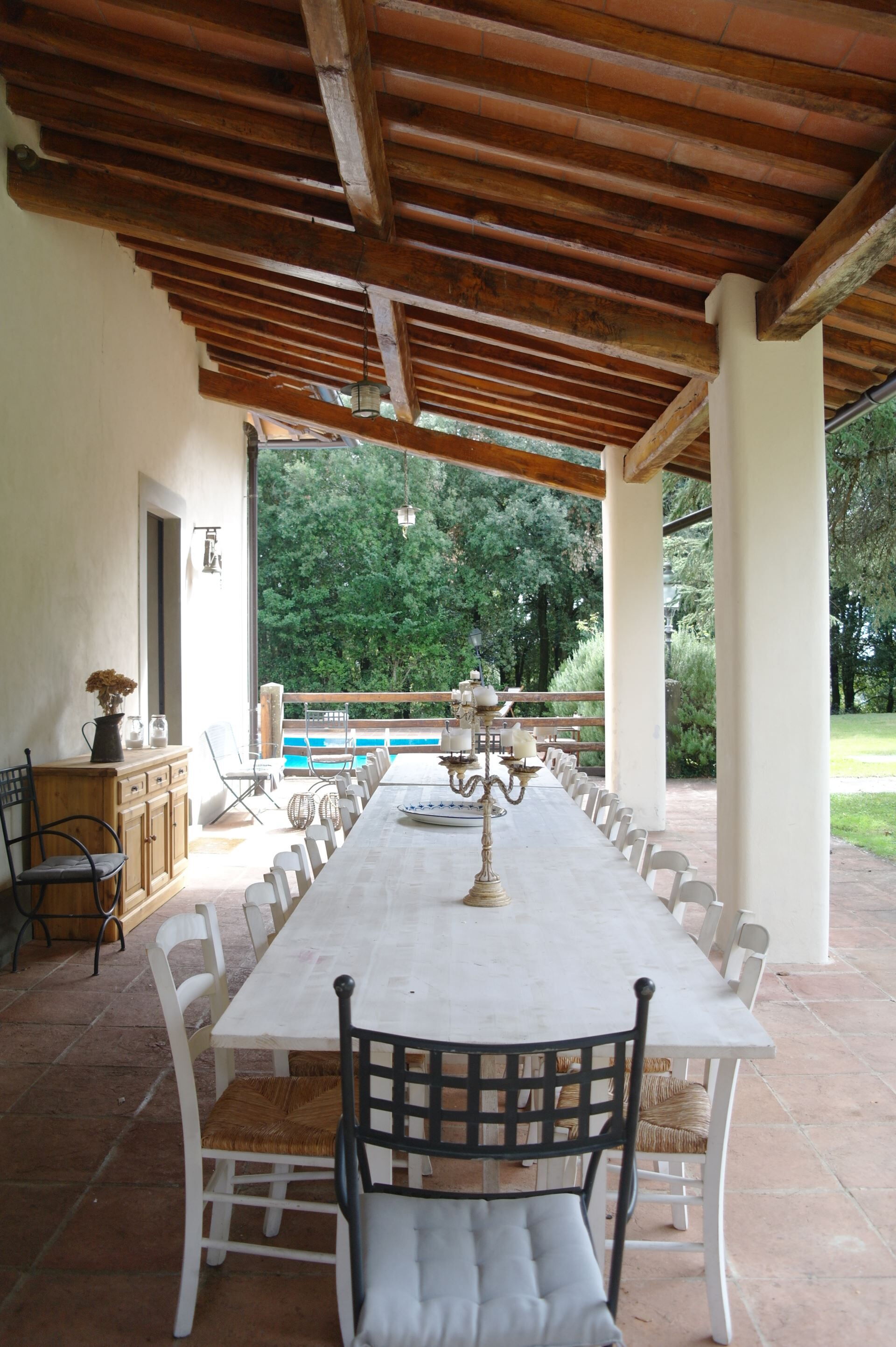 Het landgoed is omgeven door een uitgestrekt privéterrein van 9 hectare met prachtig onderhouden tuinen en natuurlijk bos dat absolute privacy en sereniteit garandeert. Het magnifieke overloopzwembad, met afmetingen van 8,5 x 15 meter en een diepte variërend van 1,20 tot 4,meter, is seizoensgebonden geopend van 01.05.26 tot 15.10.26, afhankelijk van de boekingsstatus en weersomstandigheden. Het zwembadgebied is zorgvuldig uitgerust met comfortabele ligstoelen en ligbedden waar u kunt ontspannen terwijl u geniet van het adembenemende Toscaanse landschap. Het hart van het buitenleven is de prachtige pergola die zich uitstrekt vanaf de villa en een betoverende ruimte creëert voor ontbijt in de buitenlucht, diners onder de sterren, barbecuebijeenkomsten, dansen en feesten. Deze overdekte buitenruimte is ingericht met elegant tuinmeubilair en sluit direct aan op zowel de keuken als de woonkamer, waardoor binnen- en buitenleven naadloos samensmelten. De bovenverdieping van de hoofdvilla beschikt over een solariumterras compleet met een buitendouche, dat een extra ruimte biedt om te genieten van de Italiaanse zon en het panoramische uitzicht over het omliggende platteland.