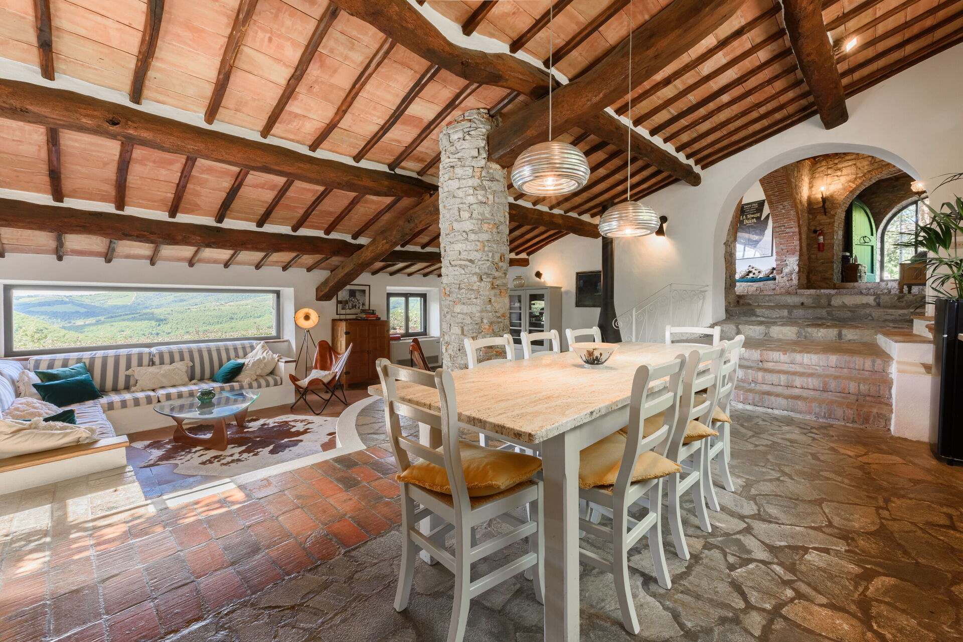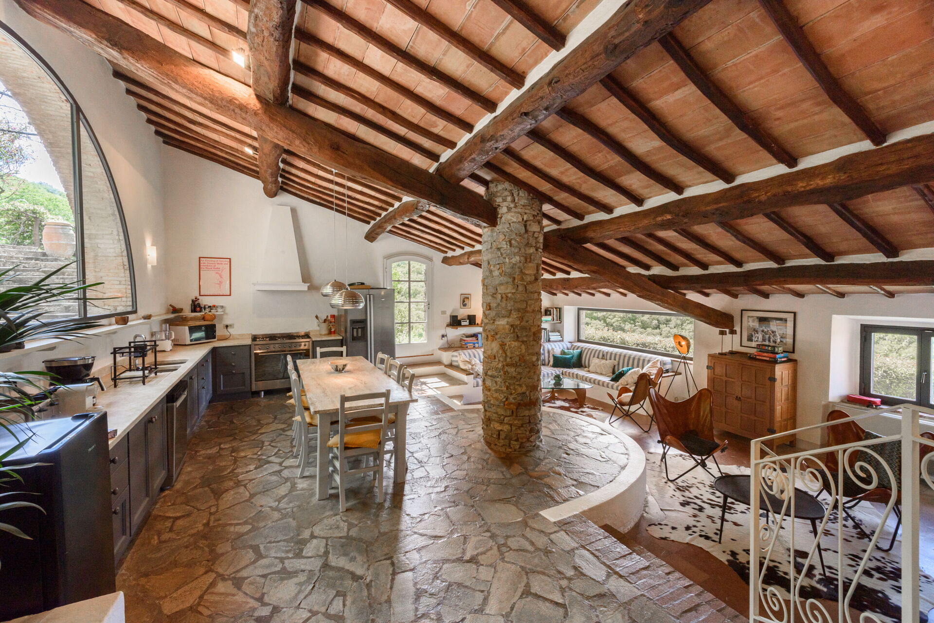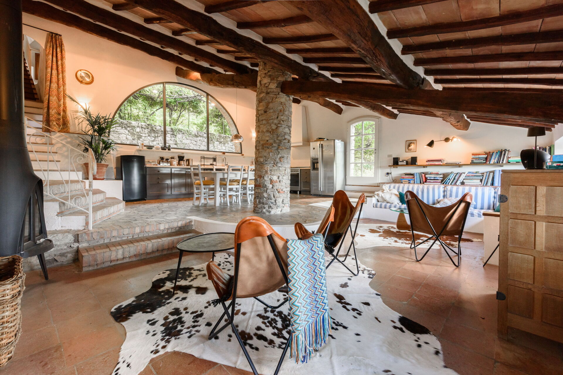 Keuken – woonkamer: eettafel (personen: 8), vaatwasser, ijskast, diepvriezer, magnetron, kookplaat, oven, broodrooster, italiaans koffiezetapparaat, bank, WIFI internet, uitgang naar de tuin, uitgang naar het terras.