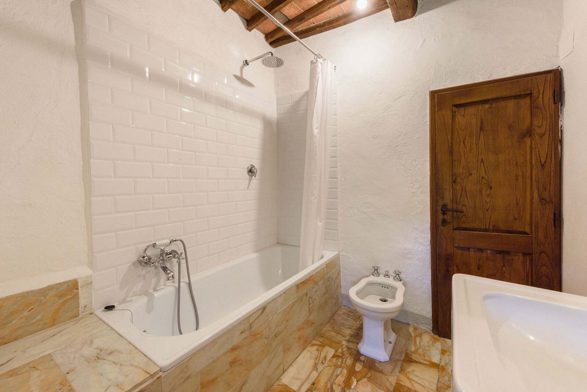 Badkamer 1: wastafel, toilet , bidet, bad, douche.