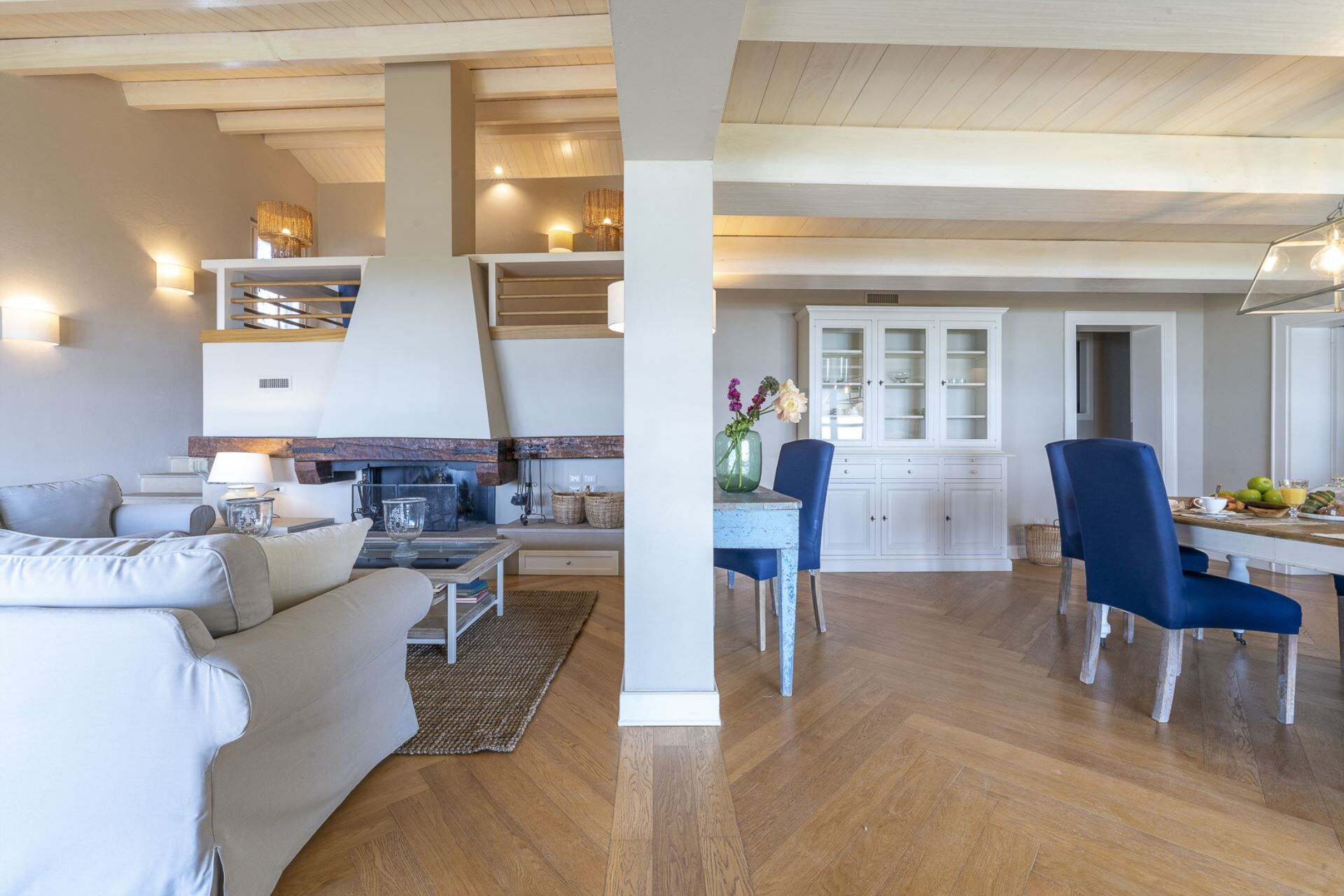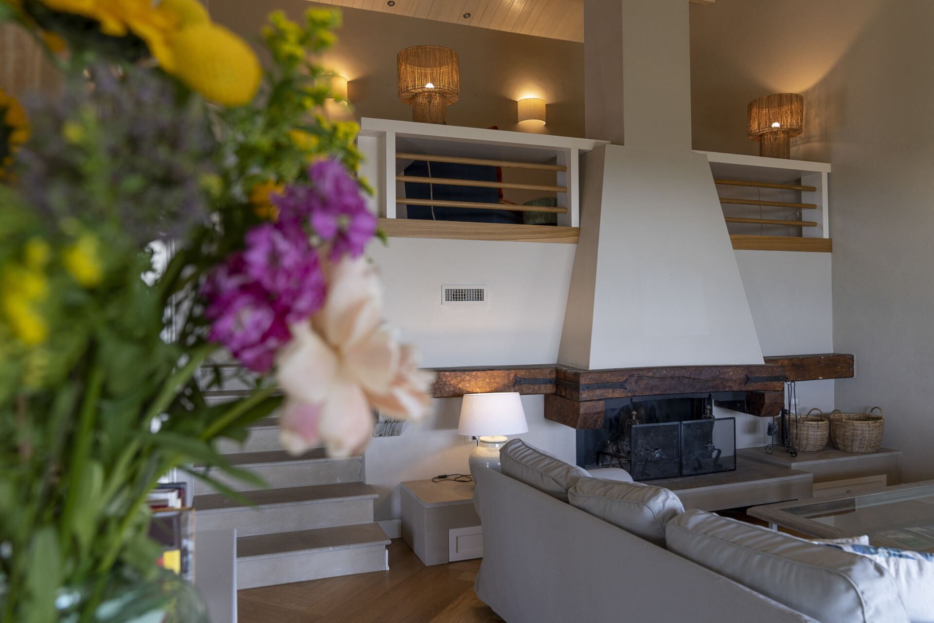 Woonkamer: bank, open haard, WIFI internet, airconditioning, satelliet tv, tv, hor, uitgang naar de veranda.