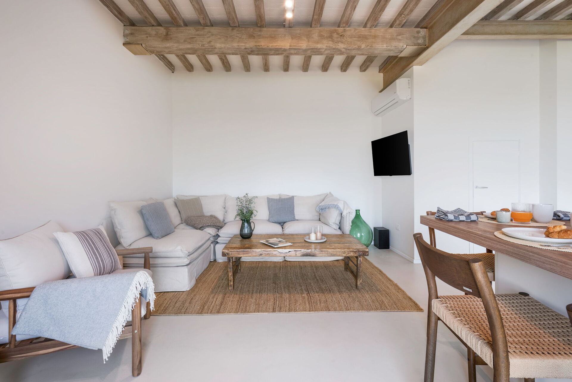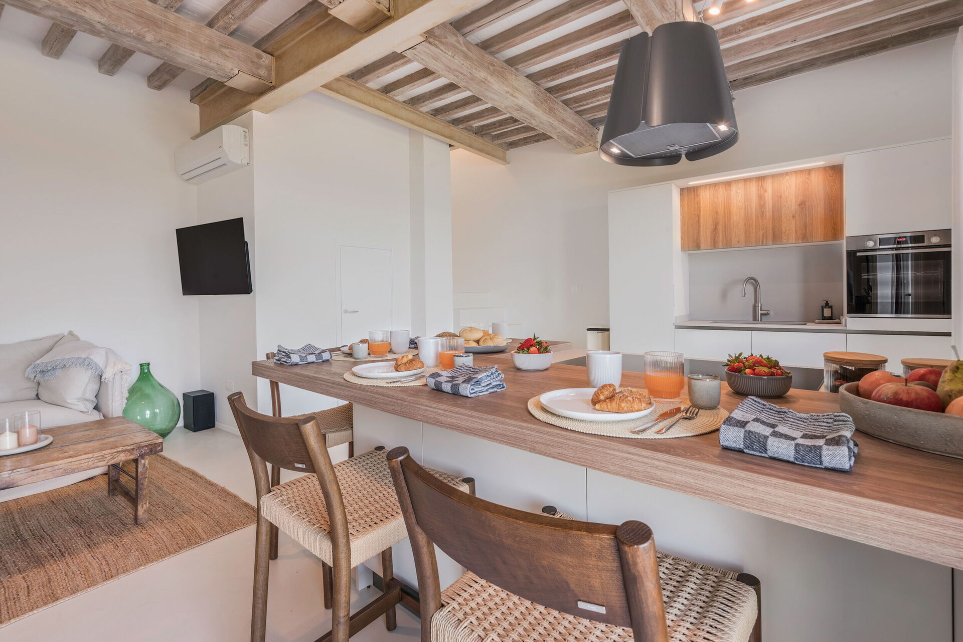 Keuken – woonkamer: goed uitgeruste keuken, eettafel, vaatwasser, ijskast, diepvriezer, magnetron, kookplaat, oven, italiaans koffiezetapparaat, WIFI internet, airconditioning, tv, uitgang naar de tuin.