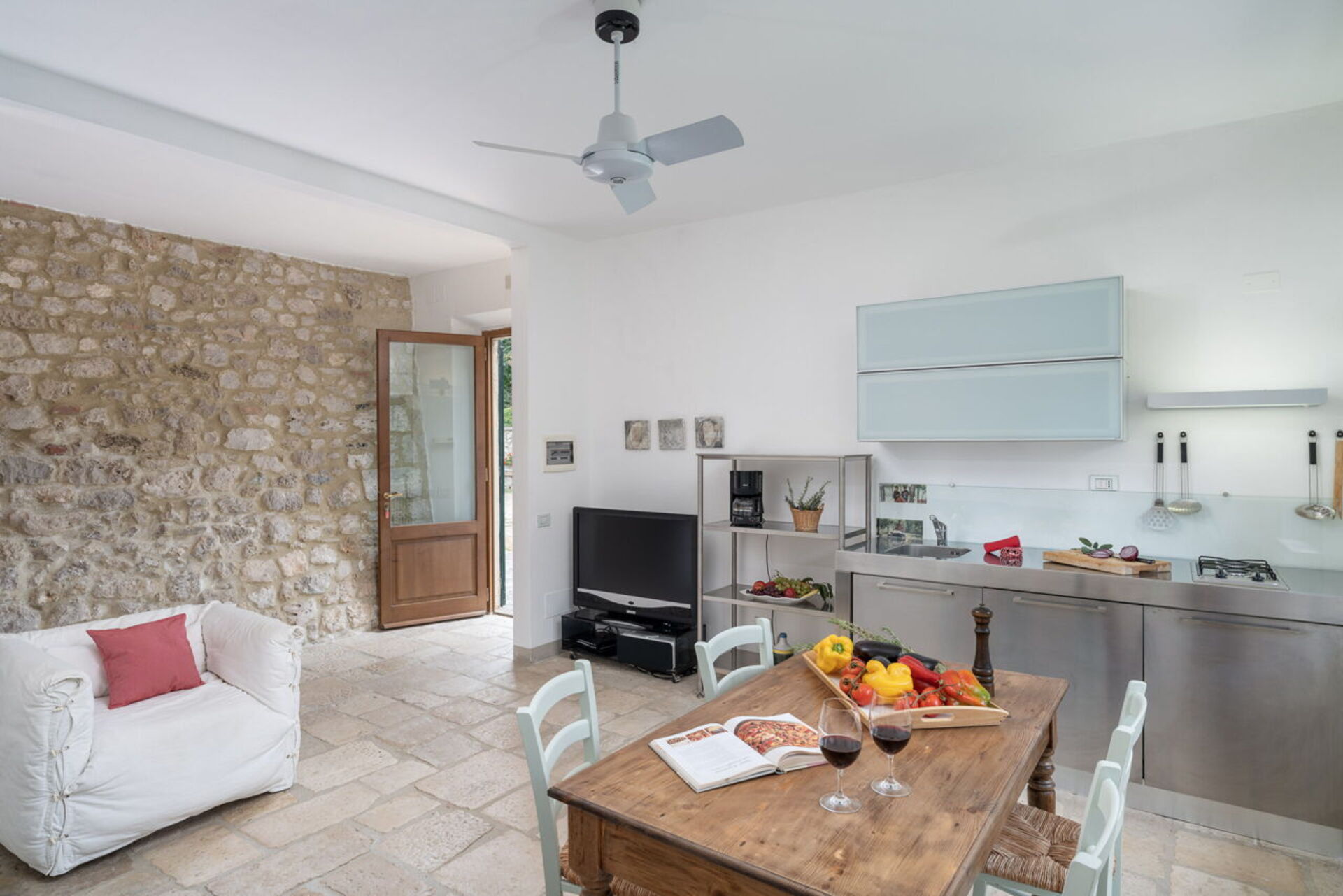 Keuken – woonkamer 2: eettafel, ijskast, kookplaat, italiaans koffiezetapparaat, bank (personen: 2), twee fauteuils, tweepersoonsbed, WIFI internet, ventilator, uitgang naar de tuin.