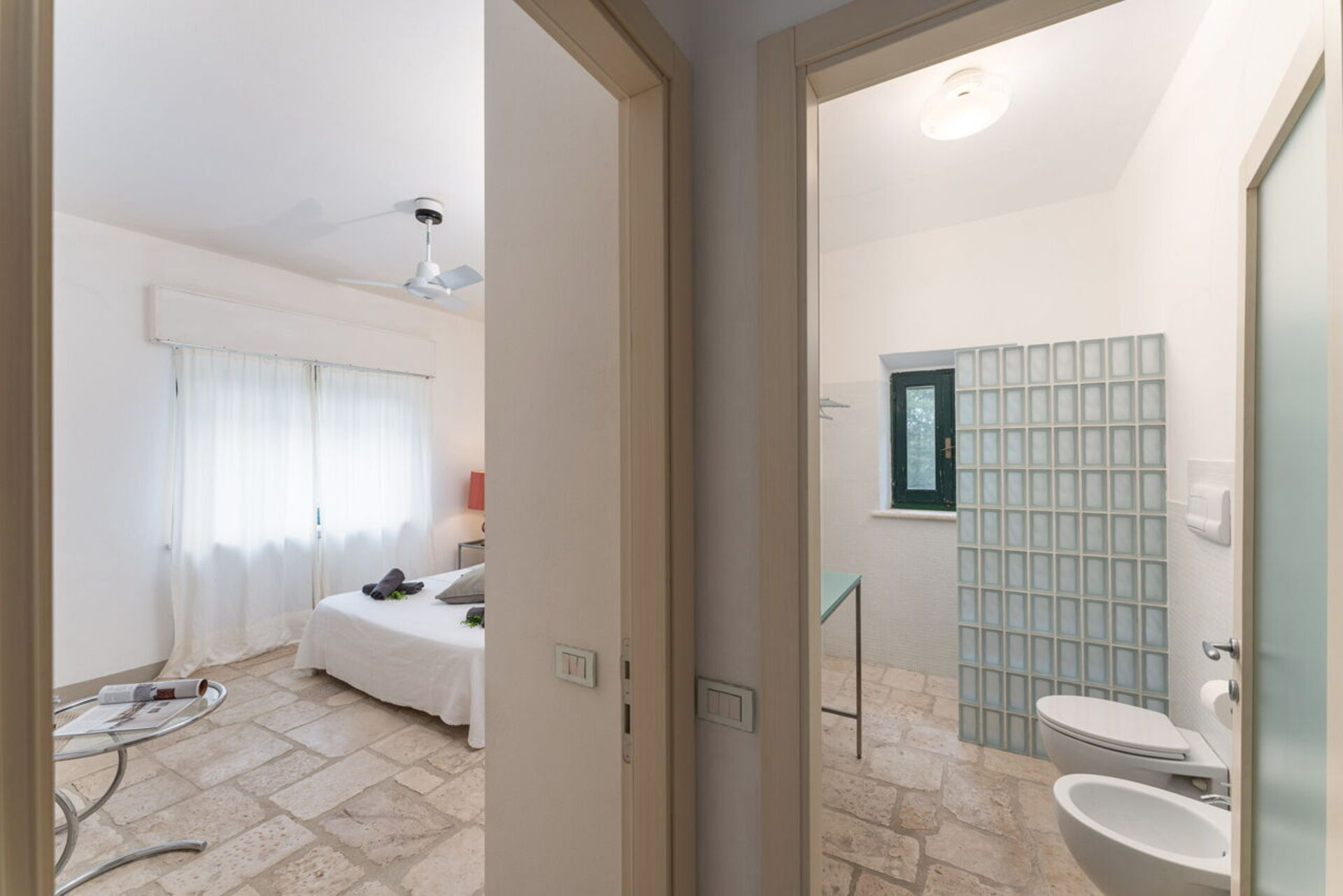 Slaapkamer met badkamer 2: tweepersoonsbed, WIFI internet, ventilator, wastafel, toilet , bidet, douche, haardroger, uitgang naar de tuin, doorloopkamer.