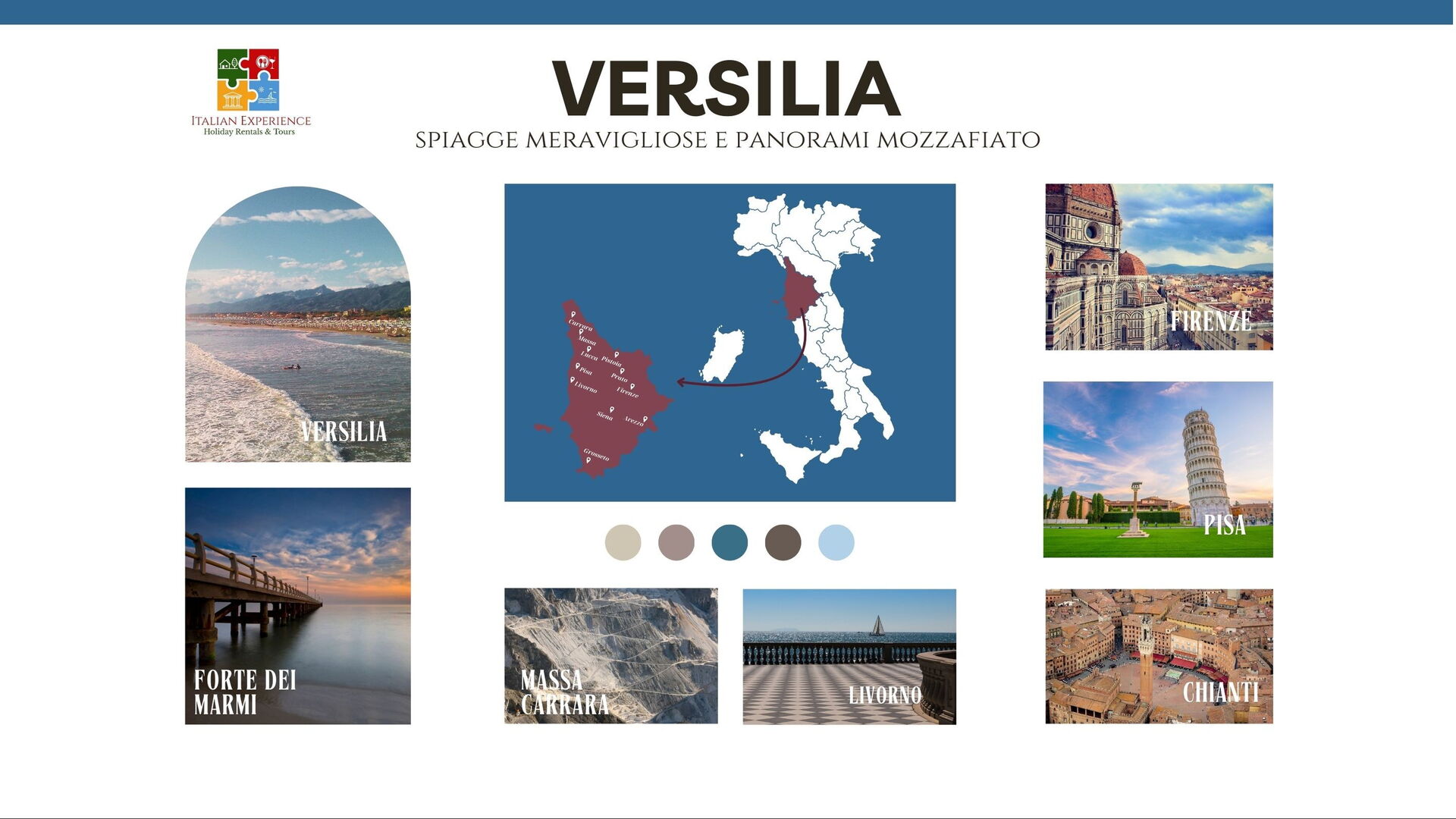 Een aantal andere belangrijke toeristische bestemmingen zijn: Florence 106 km, Viareggio 8 km, Forte Dei Marmi 8 km, Rome 384 km, Venetië 337 km en Milaan 256 km.