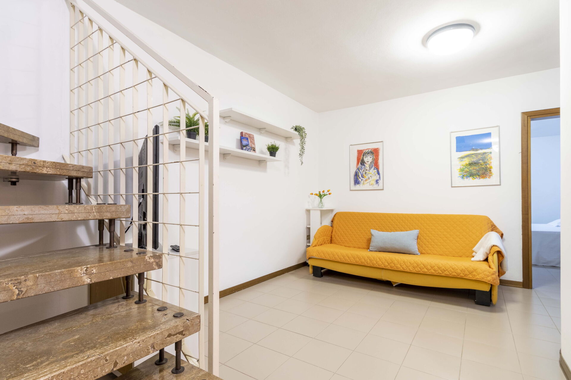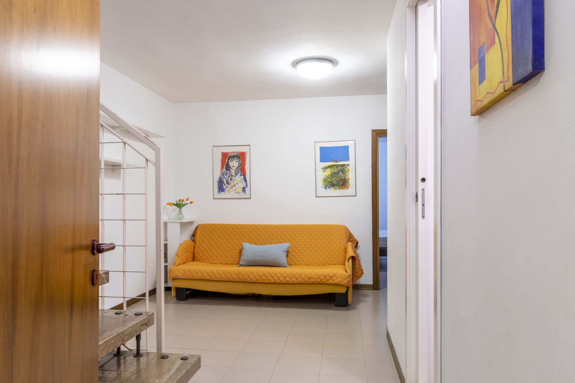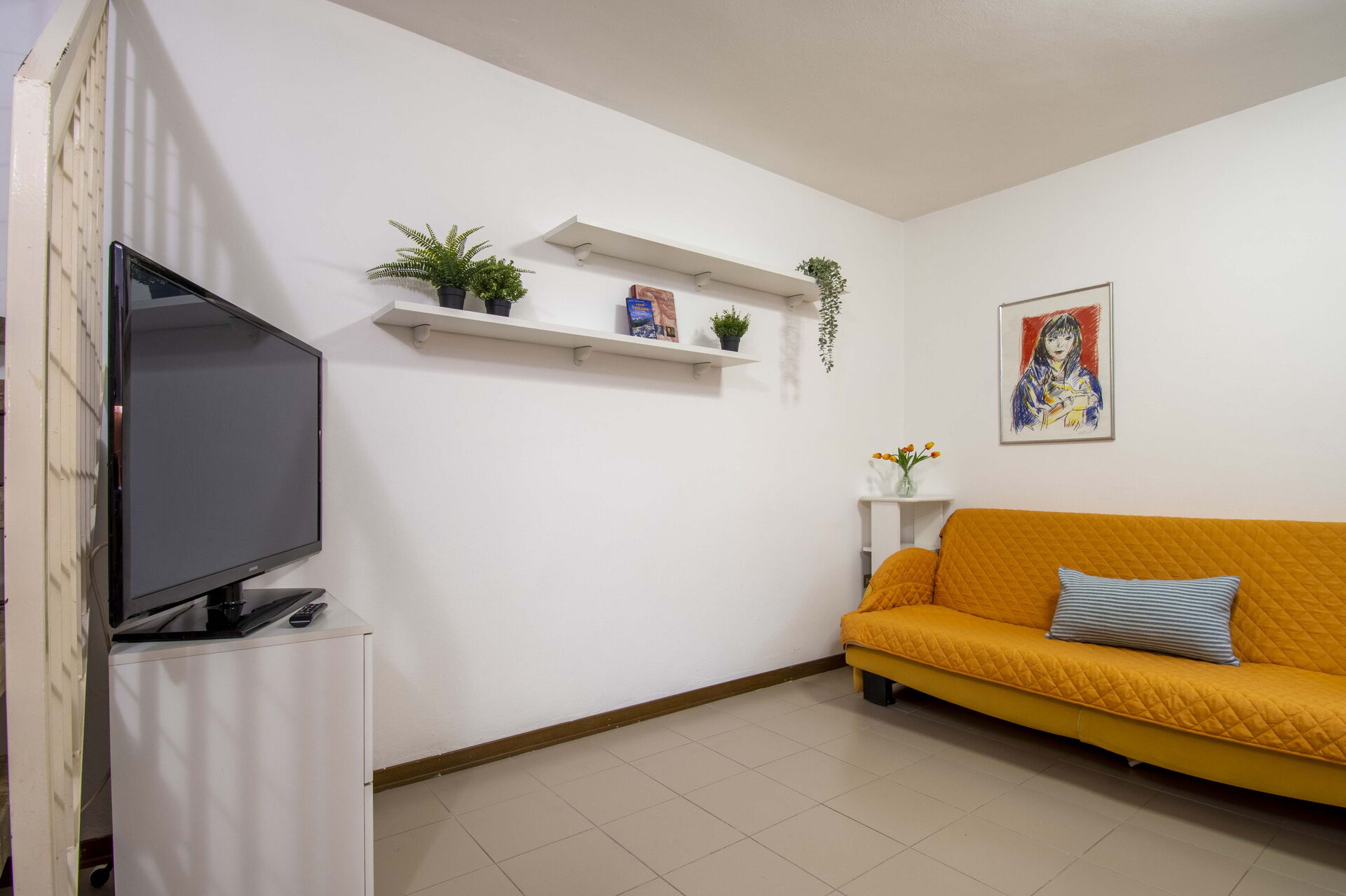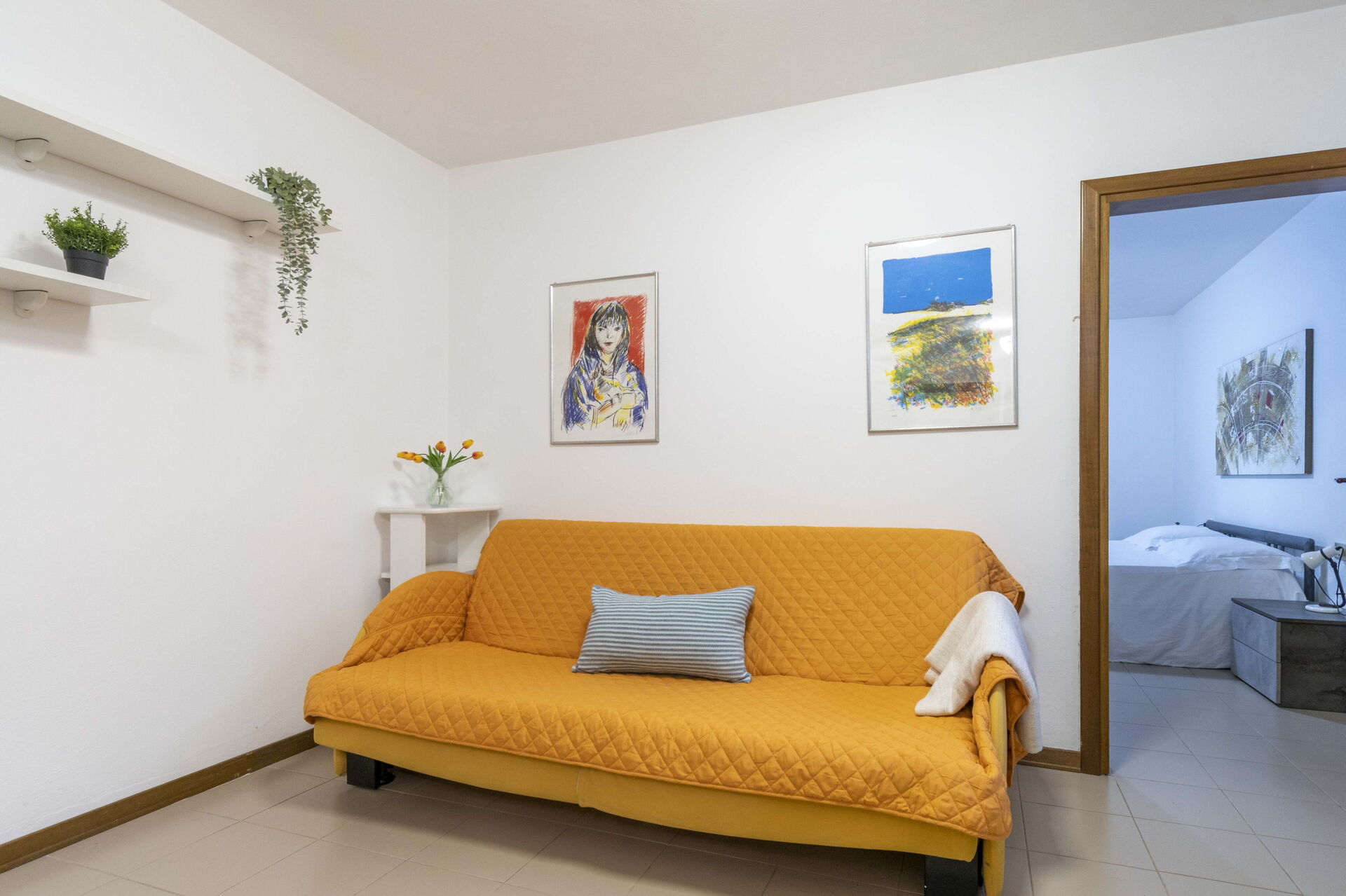 Woonkamer: smal tweepersoonsbed.