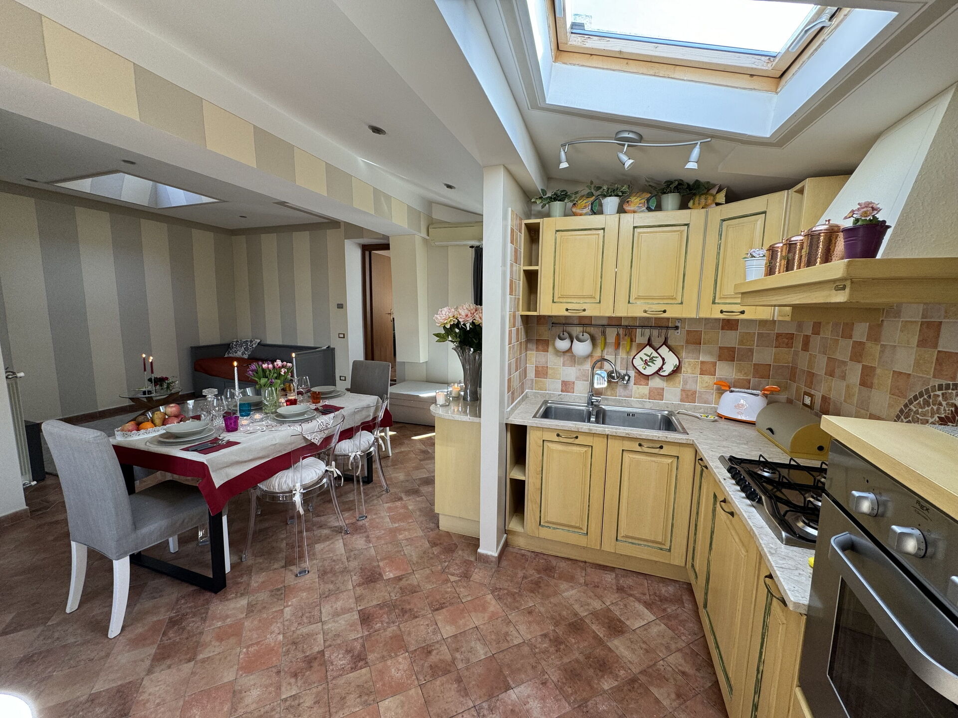 Keuken: goed uitgeruste keuken, eettafel (personen: 6), vaatwasser, ijskast, diepvriezer, kookplaat, oven, broodrooster, strijkijzer, italiaans koffiezetapparaat, koffiezetapparaat, WIFI internet, airconditioning, hor, tv.