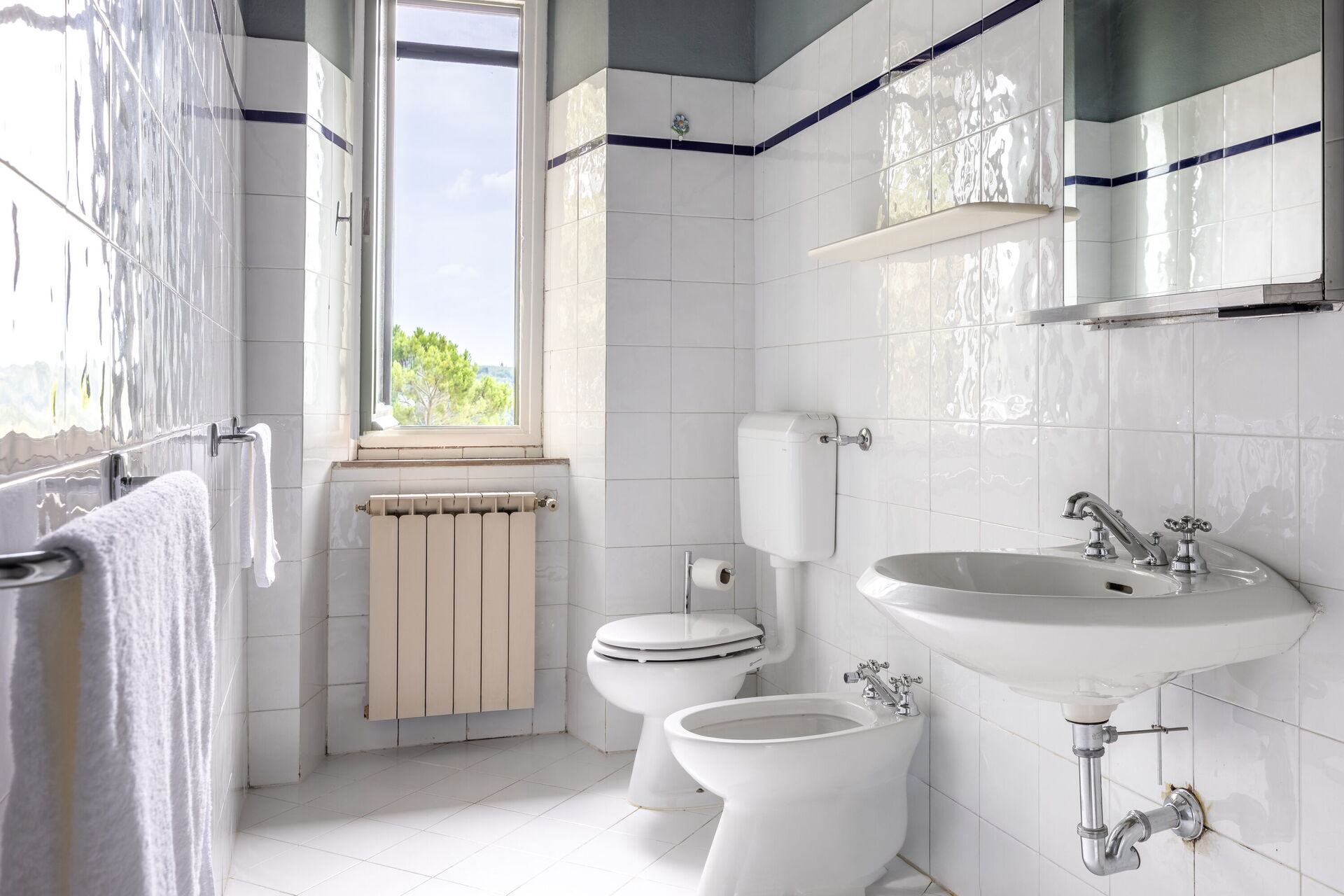 Badkamer: wastafel, toilet , bidet, douche, internet.