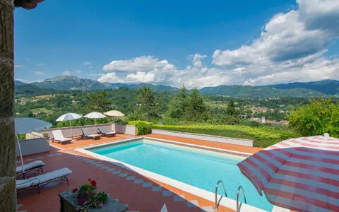 Gezellig, rustieke appartementencomplex "La Terrazza Rosata", 475 m boven zeeniveau, van 2 verdiepingen, vrijstaand, bouwjaar 1890, gerenoveerd in 2012, omgeven door bomen. In de plaats, 2 km van het centrum van Castelnuovo Garfagnana, rustige, zonnige ligging, 150 m van het meer, te midden van groen. Voor alleengebruik: wilde tuin 250 m2 (omheind), openluchtzwembad (11 x 6 m, 140 - 140 cm diepte, seizoensgebonden beschikbaarheid: 15.Mei. - 30.Sep.). Douche/WC bij het zwembad, tuinmeubelen. In het huis: wasmachine. Parkeerplaats (voor 3 auto's) bij het huis. Levensmiddelenwinkel 2.5 km, supermarkt 2.5 km, restaurant 2.5 km, bushalte 100 m, treinstation 2.5 km. Attracties in de buurt: Rafting Bagni di Lucca 20 km, Versilia 48 km, Lucca 45 km, Torre di Pisa 65 km, Sentiero Fortezza delle Verrucole 7 km. Auto noodzakelijk. Baby uitrusting op aanvraag (incl.).