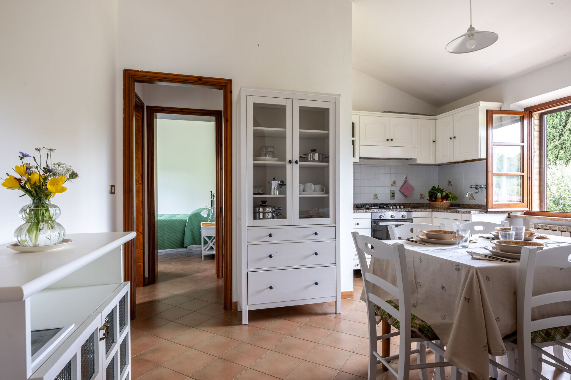 Zodra u aankomt vindt u een mooie, schone en goed onderhouden woning ideaal voor een rustige vakantie in Toscane. Hoe u de dagen ook doorbrengt - musea bezoek, winkelen, met excursies of rijdende door het prachtige landschap, zodra u thuis komt kunt u uitrusten samen met familie en vrienden voor een perfecte afsluiting van nog weer een dag in Toscane. Dineren met vrienden en familie is een grote onderdeel van de Toscaanse cultuur. Maak gebruik van de goed uitgeruste keuken om maaltijden te bereiden met lokale producten terwijl u op vakantie bent. De keuken biedt o.a. een koffiezetapparaat, magnetron oven, broodrooster, fornuis en ijskast, en natuurlijk ook voldoende servies en bestek voor minstens vier personen.