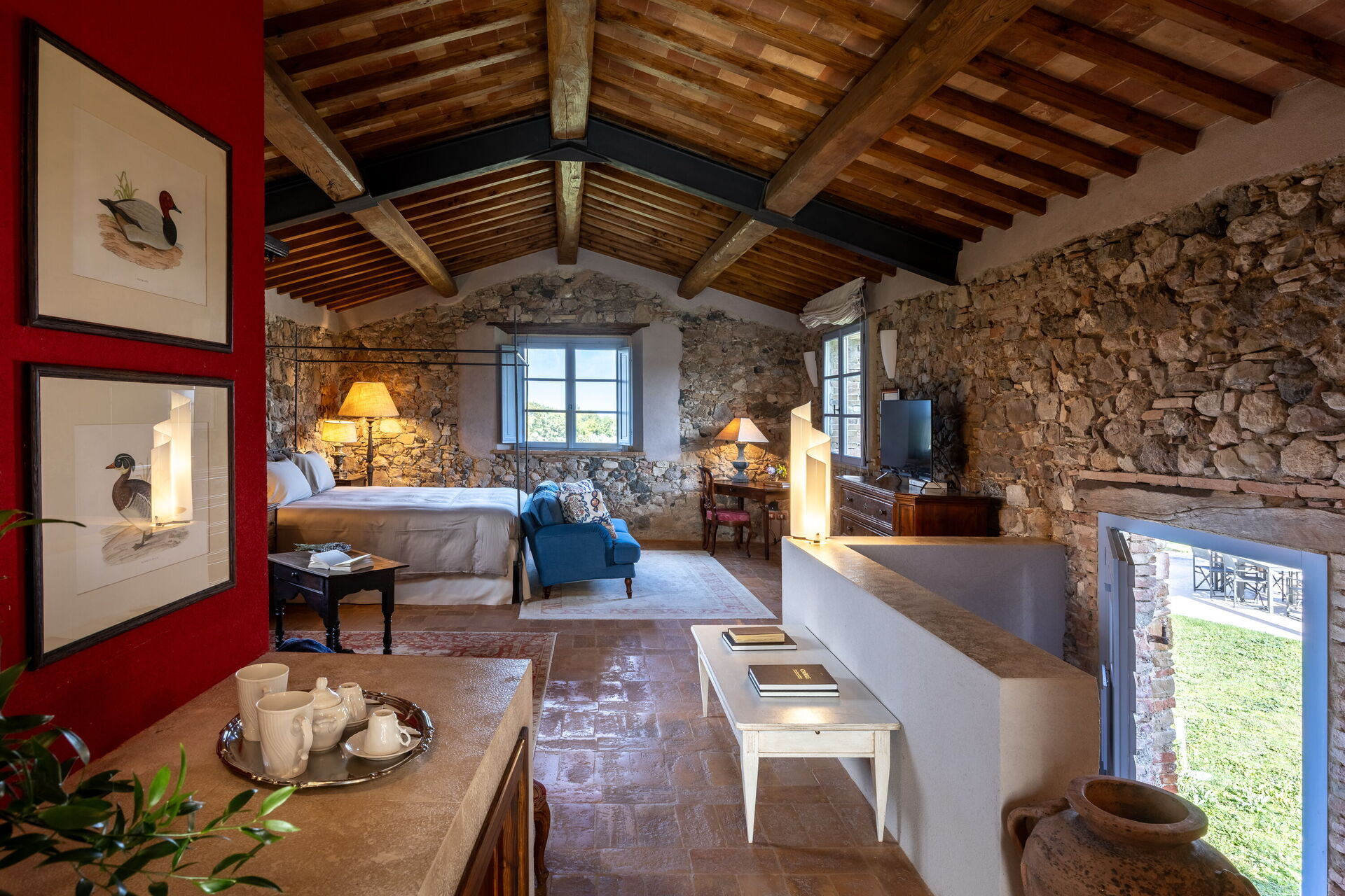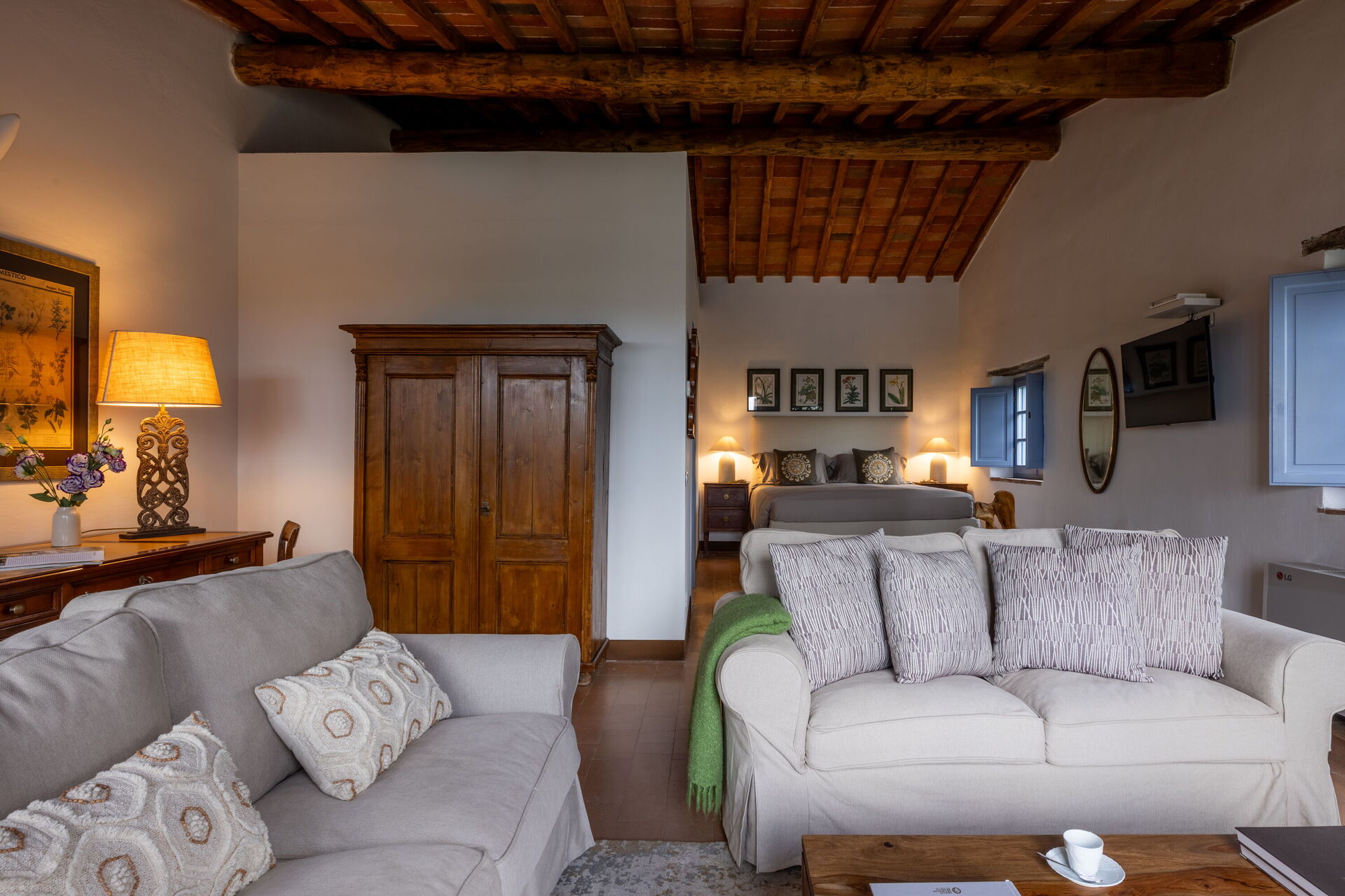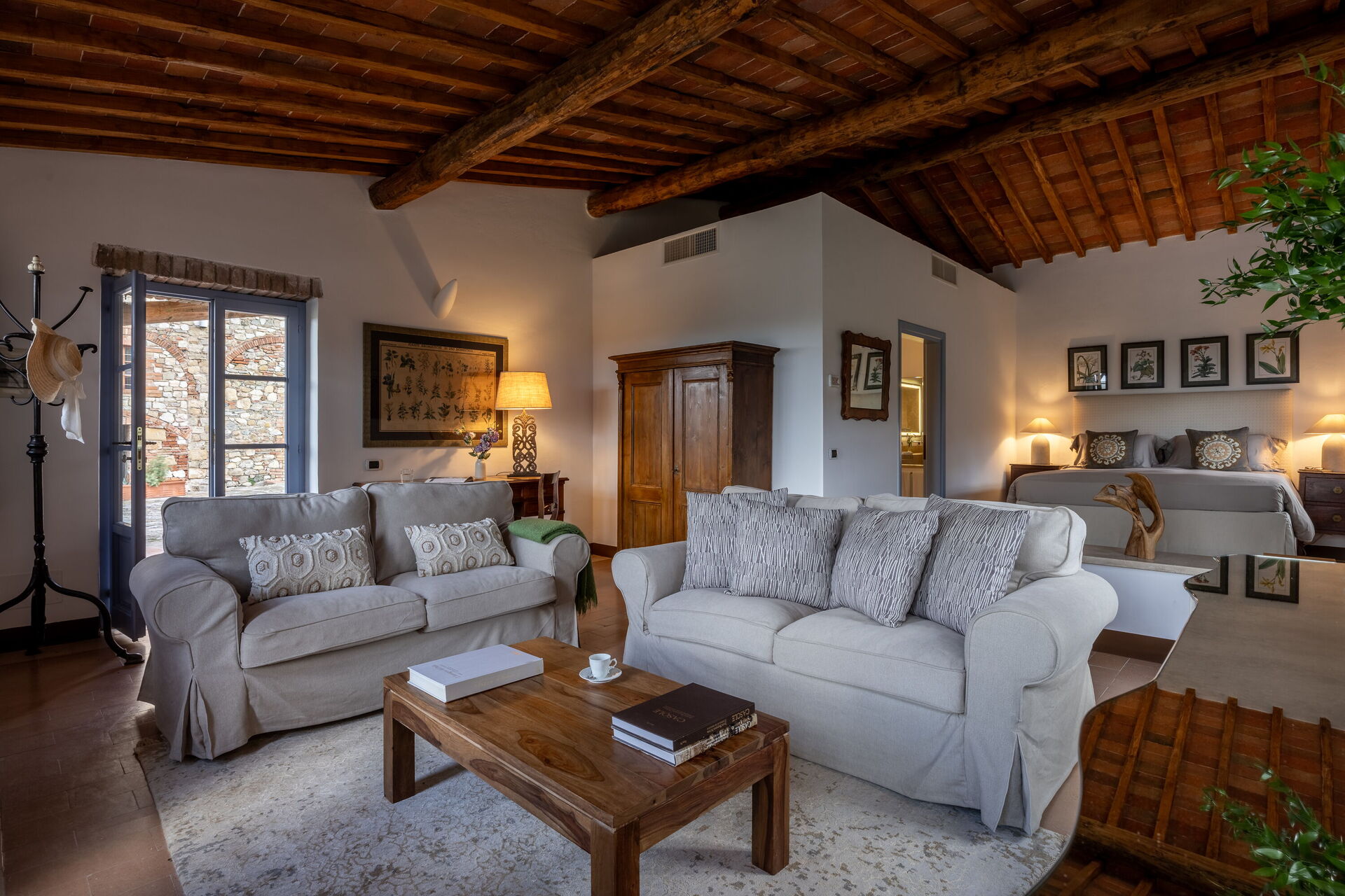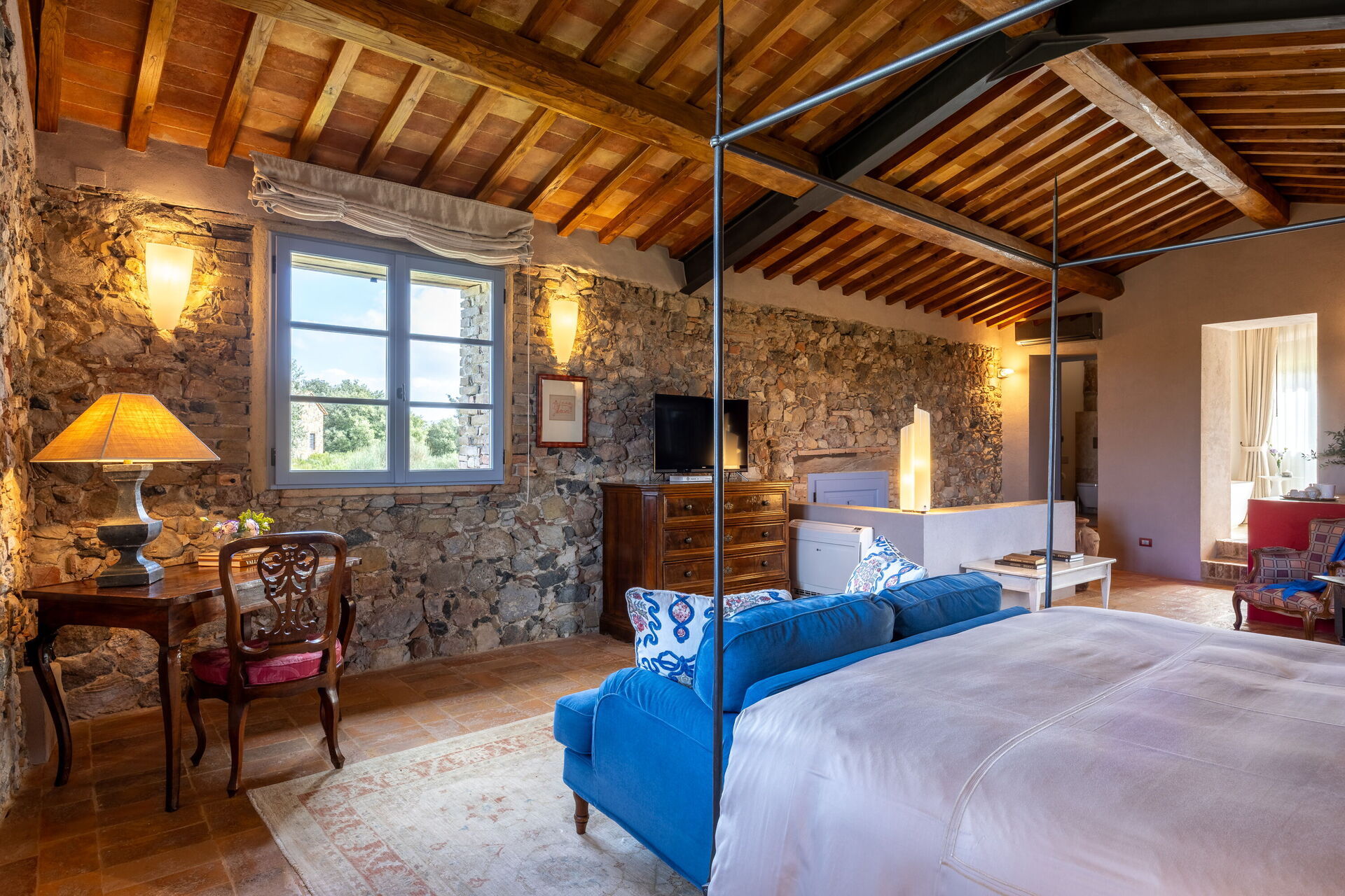 Slaapkamer met badkamer 1: tweepersoonsbed, WIFI internet, airconditioning, tv, twee banken, wastafel, toilet , bidet, douche, uitgang naar de tuin.