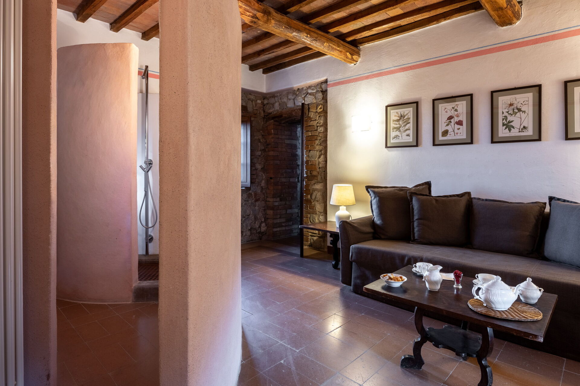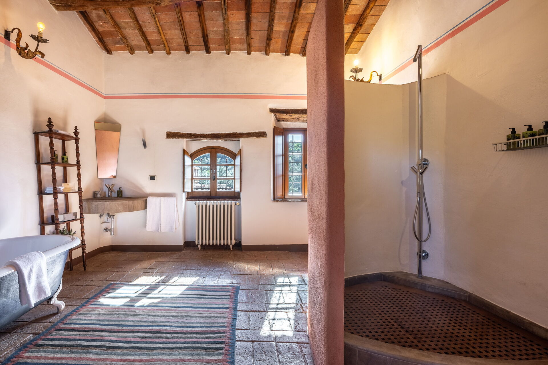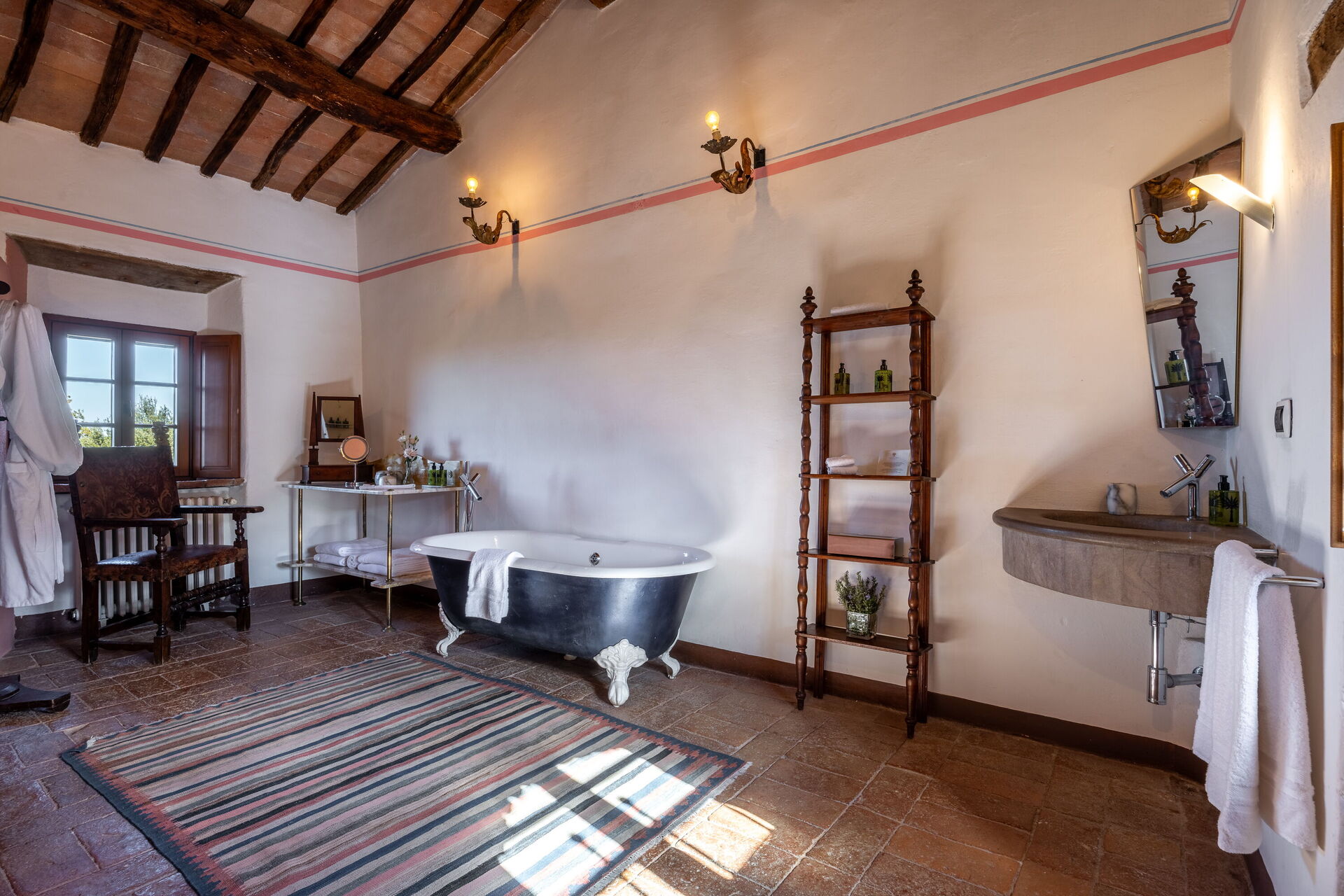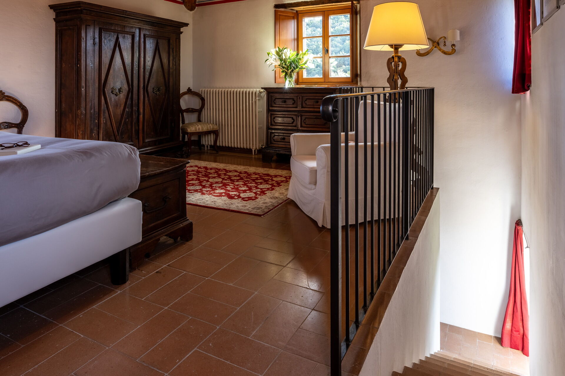 Slaapkamer met badkamer 1: tweepersoonsbed, WIFI internet, airconditioning, tv, twee banken, wastafel, toilet , bidet, douche, uitgang naar de tuin.