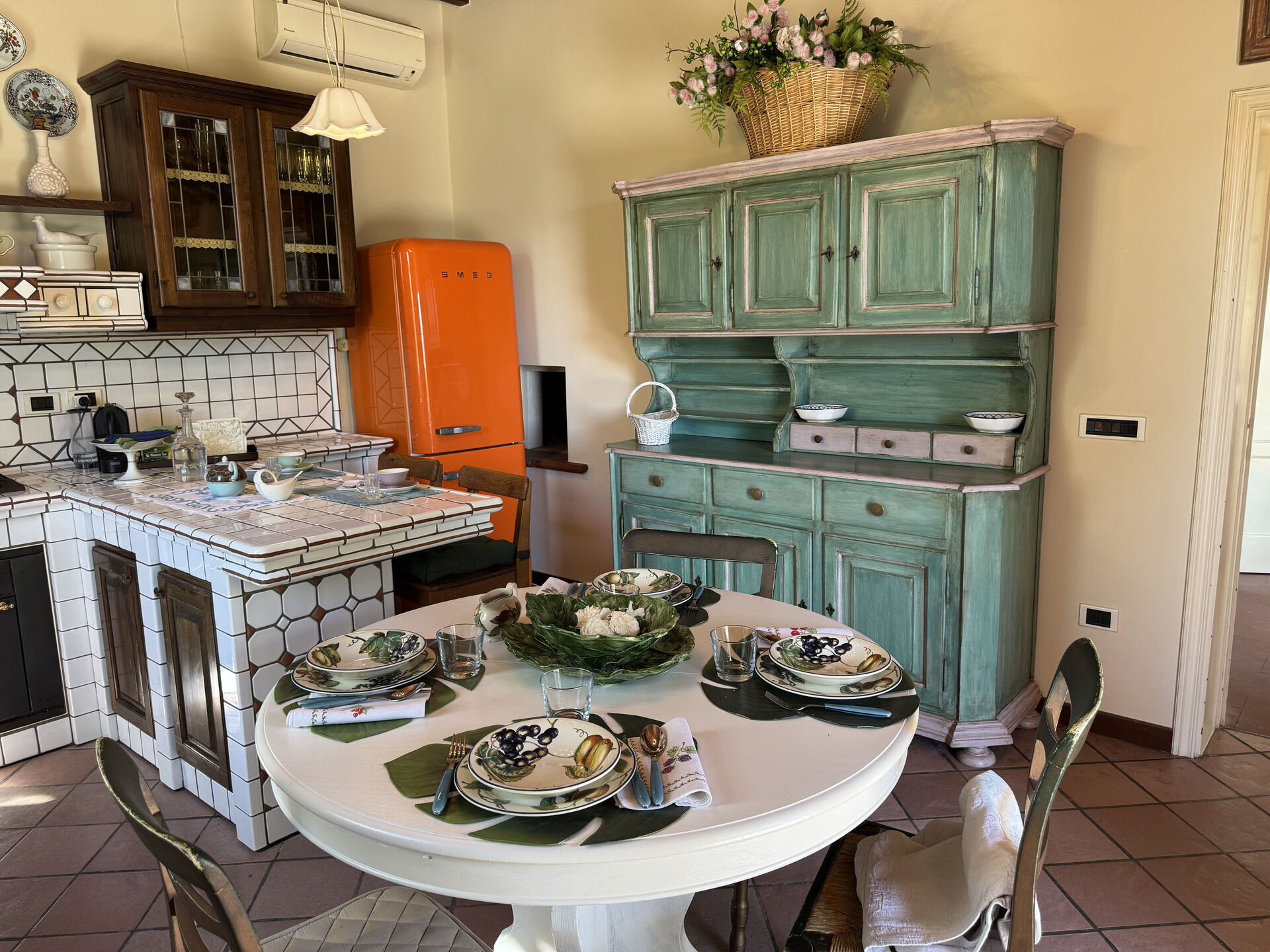 Keuken: goed uitgeruste keuken, vaatwasser, ijskast, diepvriezer, magnetron, oven, broodrooster, italiaans koffiezetapparaat, co2 detector, uitgang naar de tuin.
