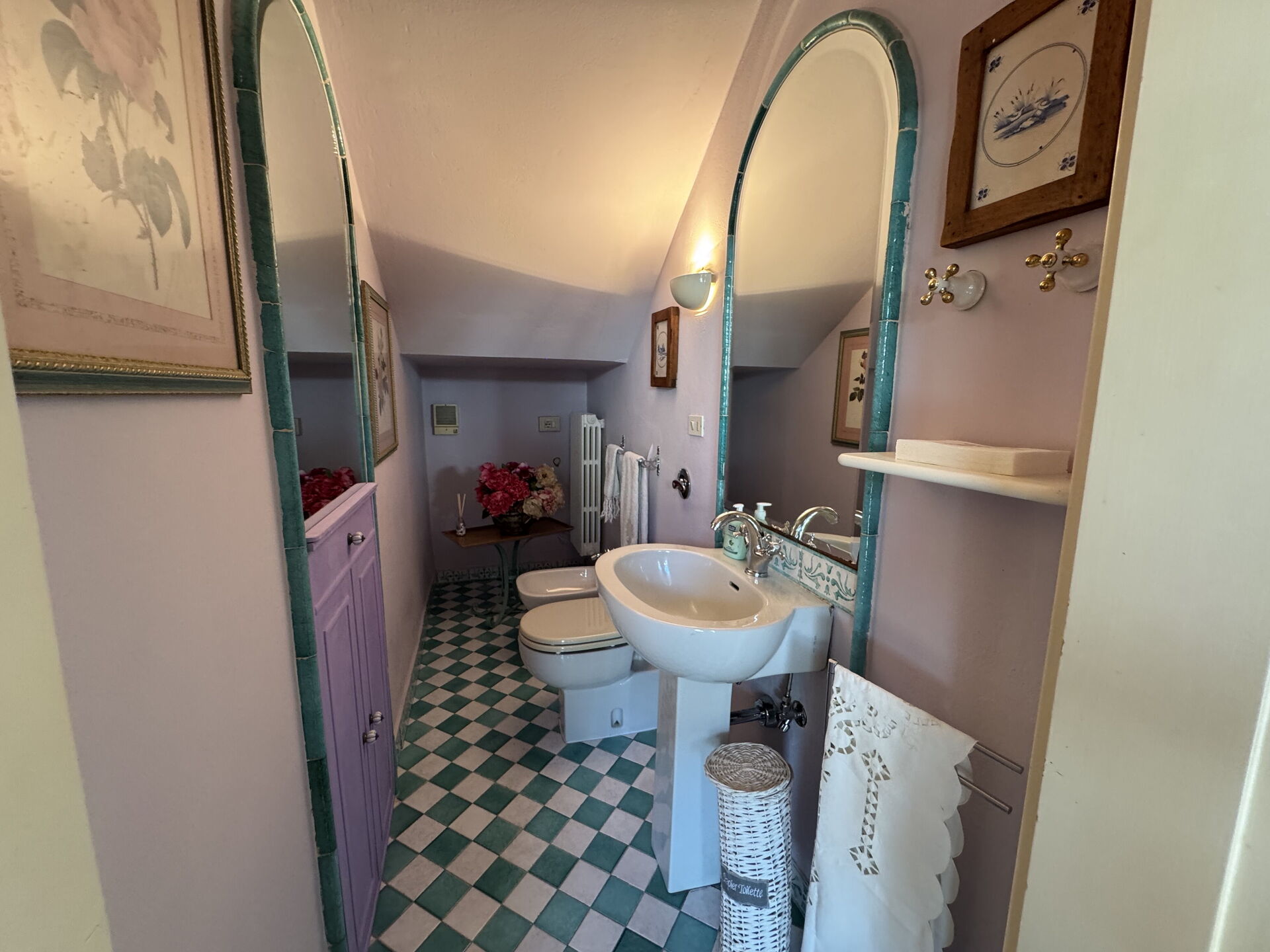 Badkamer: wastafel, toilet , bidet, douche.