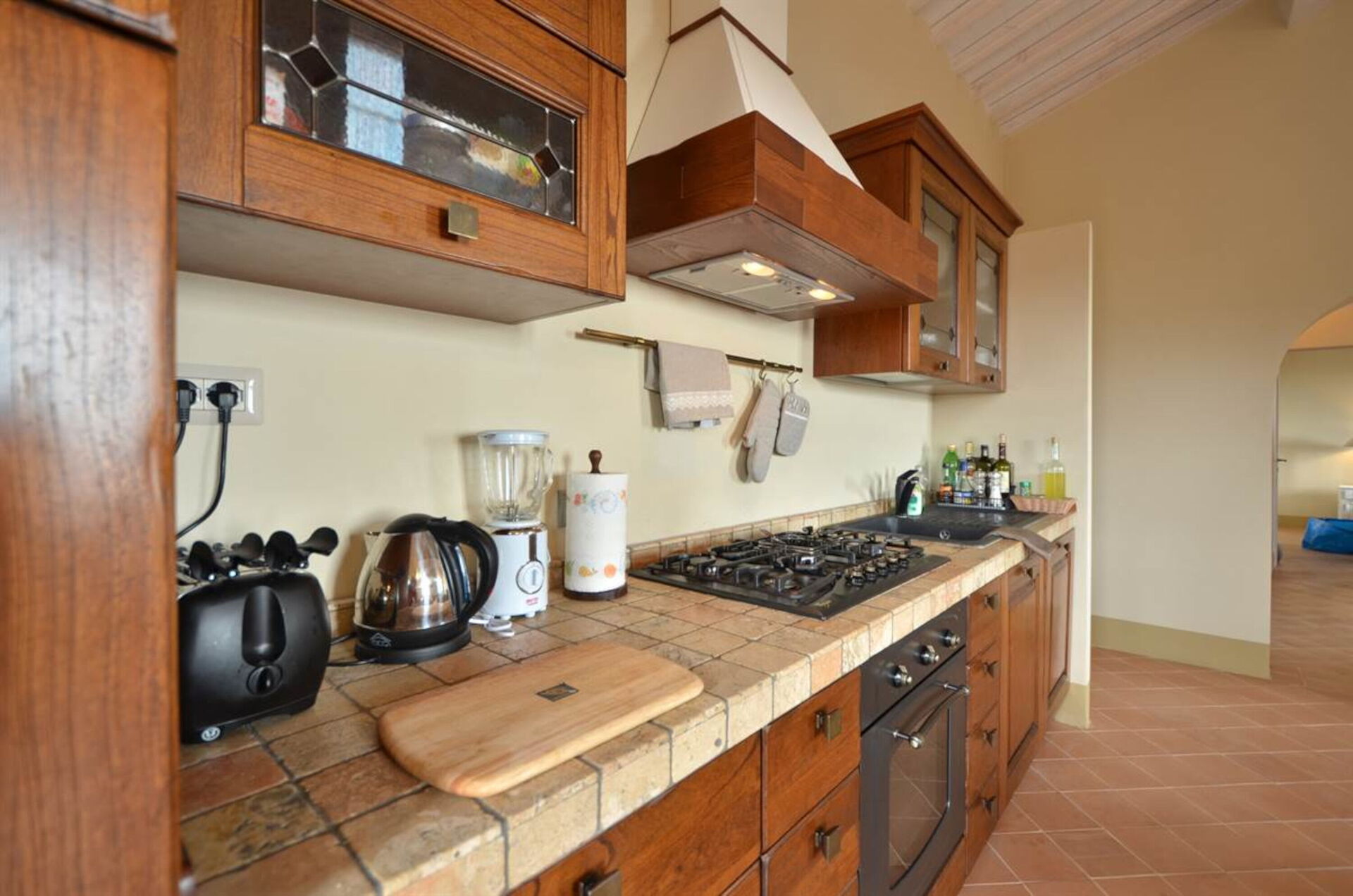 Keuken – woonkamer (36 m2): goed uitgeruste keuken, eettafel, vaatwasser, ijskast, diepvriezer, magnetron, kookplaat, oven, broodrooster, strijkijzer, italiaans koffiezetapparaat, koffiezetapparaat, twee banken, open haard, WIFI internet, airconditioning, satelliet tv, tv, rookmelder, co2 detector, uitgang naar het terras.