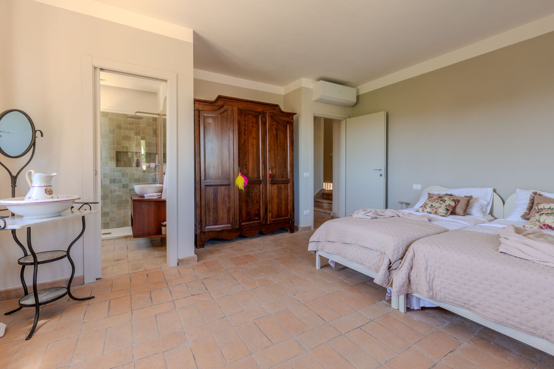 Slaapkamer met badkamer: twee eenpersoonsbedden, WIFI internet, internet, airconditioning, wastafel, toilet , bidet, douche, haardroger.