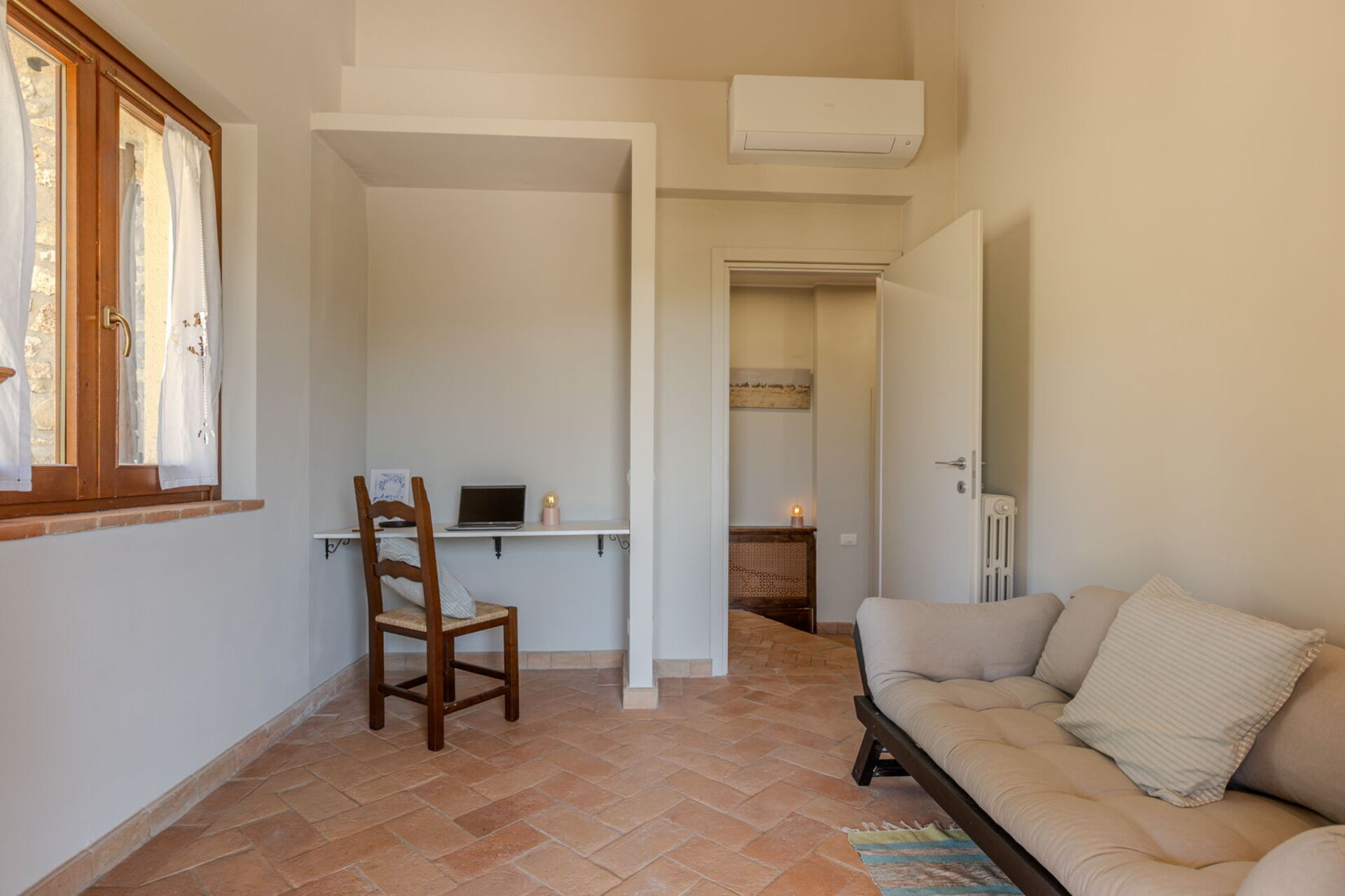 Algemene ruimte: WIFI internet, airconditioning, stoel, bank, uitgang naar het balkon, bureau.