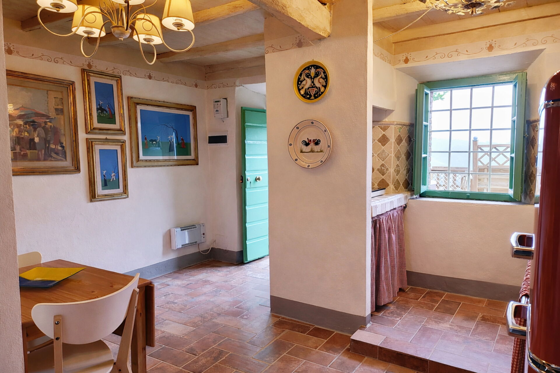 Keuken: goed uitgeruste keuken, eettafel, ijskast, diepvriezer, kookplaat, oven, broodrooster, italiaans koffiezetapparaat, wasmachine, WIFI internet, uitgang naar de tuin.