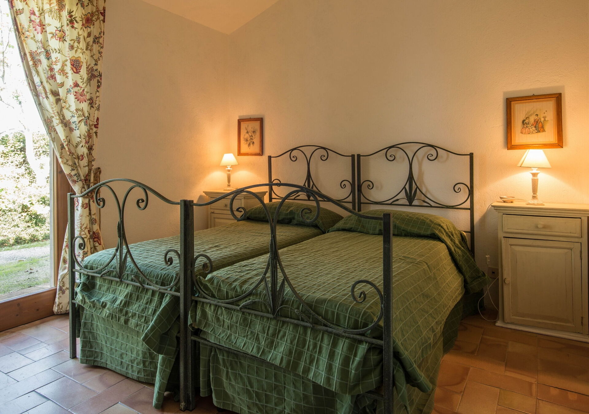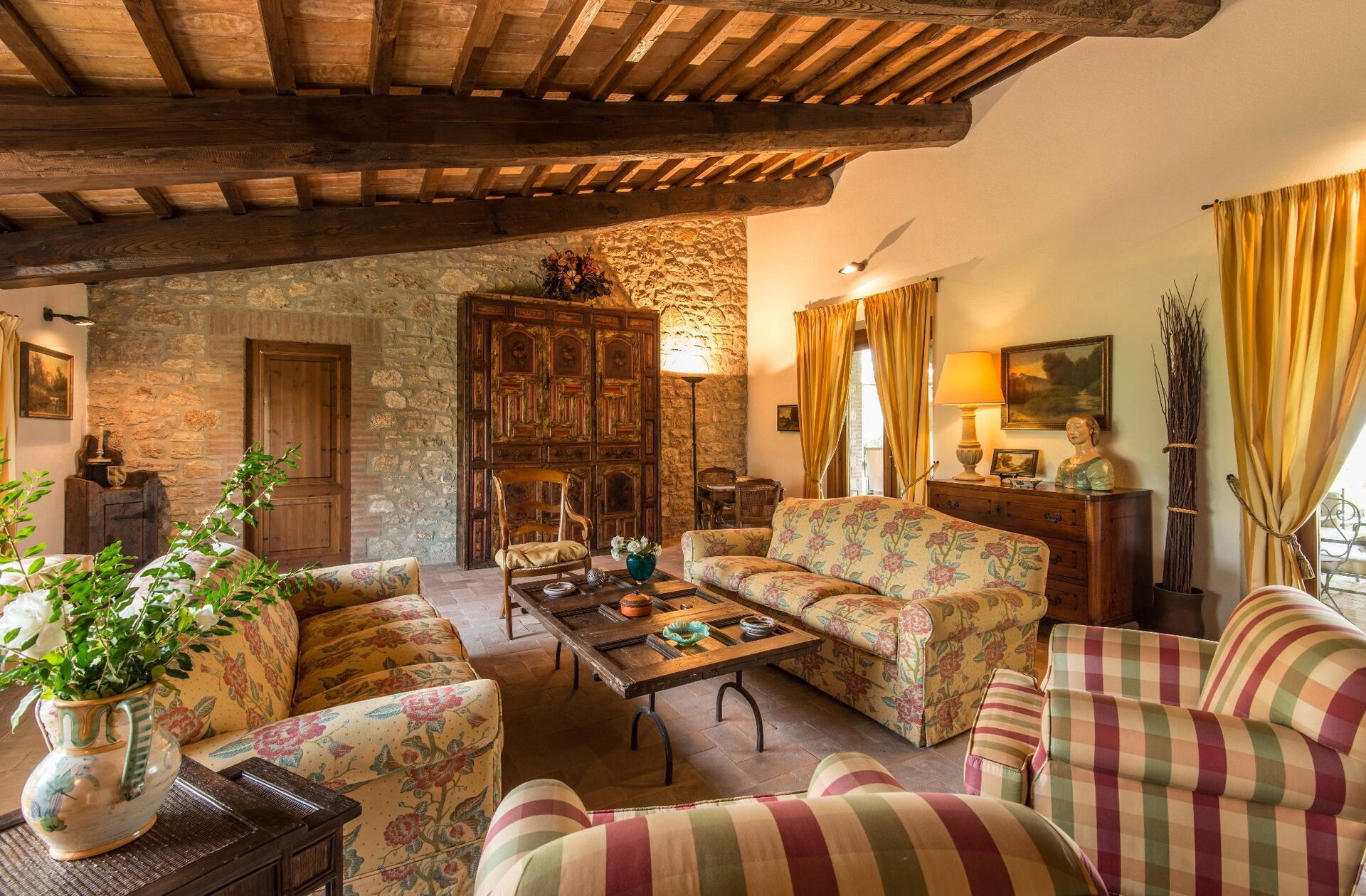 U vindt deze uitgestrekte vakantiewoning doordacht ontworpen om plaats te bieden aan maximaal 14 gasten, verdeeld over 7 slaapkamers en 7 badkamers, verspreid over het hoofdgebouw en een bijgebouw. Het hoofdgebouw heeft een entree op de begane grond die u verwelkomt in een eerste woonkamer ingericht met een comfortabele Chesterfield-bank en een paar fauteuils, met zitplaatsen voor maximaal 7 personen. Aangrenzend aan deze ruimte ontdekt u een grote woonkamer met een werkende open haard en comfortabele banken en fauteuils met zitplaatsen voor maximaal 10 of 12 personen, met dubbele deuren die uitkomen op de overdekte loggia waar u kunt ontspannen en van het uitzicht kunt genieten. Naast de woonkamer biedt een grote eetkamer met een werkende open haard plaats aan maximaal 14 personen. De begane grond omvat ook een grote keuken met een aparte eethoek, werkende open haard en een tafel voor 8 personen, met dubbele deuren die uitkomen op een eetpatio en een tweede buitenwoonkamer. Een gastenbadkamer bedient deze verdieping. De begane grond wordt gecompleteerd door een slaapkamer met airconditioning en een kingsize bed, aparte zitkamer en inloopkast, vergezeld van een ensuite badkamer met een bad met handdouche en aparte douche. De eerste verdieping biedt slaapplaatsen voor maximaal 8 personen en biedt prachtig uitzicht over de glooiende heuvels en het platteland. U vindt er een master bedroom met een kingsize bed, werkende open haard en inloopkast, met een ensuite badkamer met douche en dubbele wastafel. Drie extra slaapkamers op deze verdieping bieden flexibele slaapmogelijkheden met twee eenpersoonsbedden die samen kunnen worden geschoven tot tweepersoonsbedden. Een van deze slaapkamers heeft een inloopkast en hun ensuite badkamers hebben douches of een bad met handdouche. Het bijgebouw, beschikbaar tegen extra kosten, biedt 2 extra slaapkamers met airconditioning. Een slaapkamer met twee eenpersoonsbedden of tweepersoonsbed met bedden die samen kunnen worden geschoven heeft dubbele deuren die uitkomen op de tuin en een ensuite badkamer met douche. Een tweepersoonsslaapkamer met een queensize bed heeft een deur die uitkomt op de tuin en een ensuite badkamer met douche.