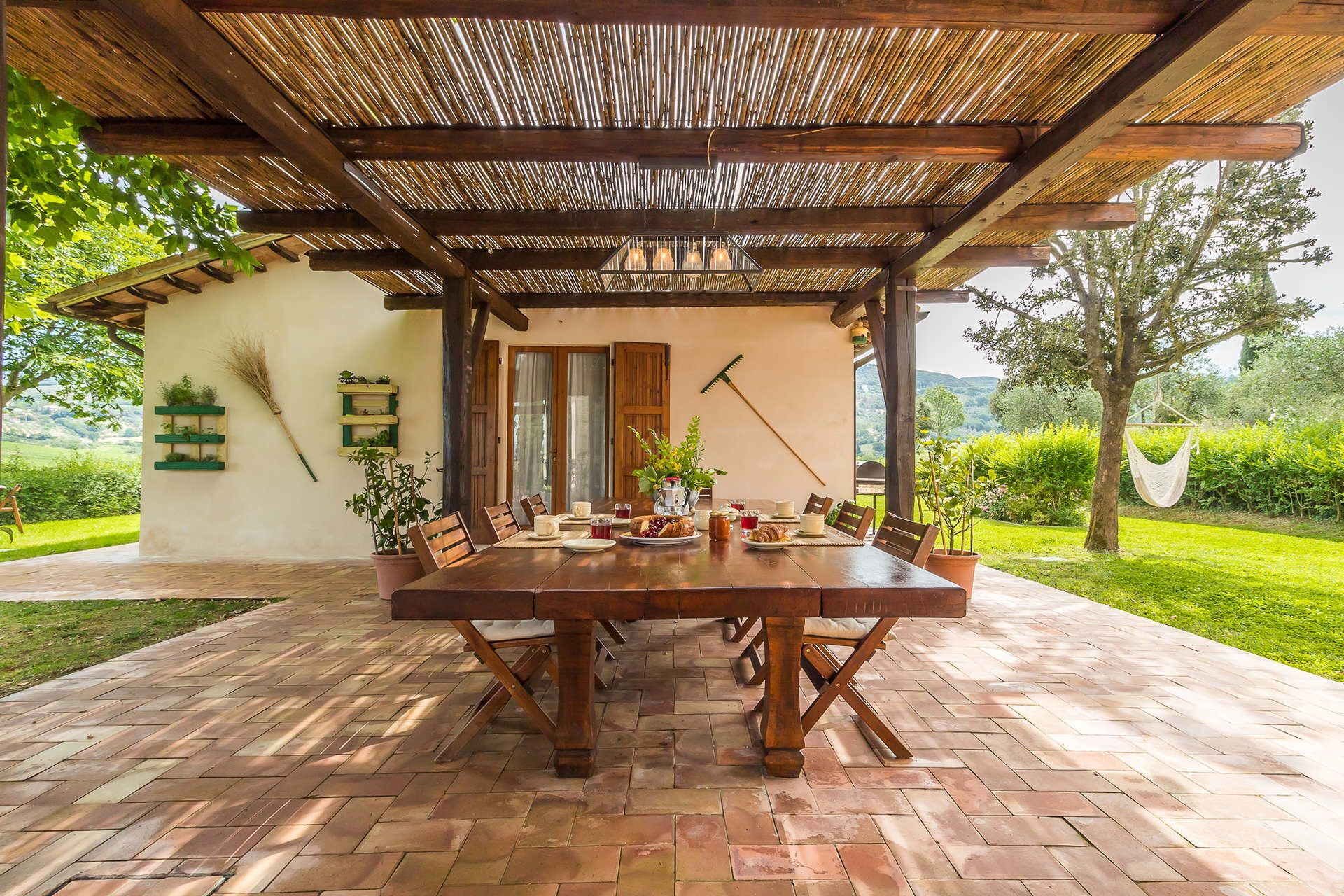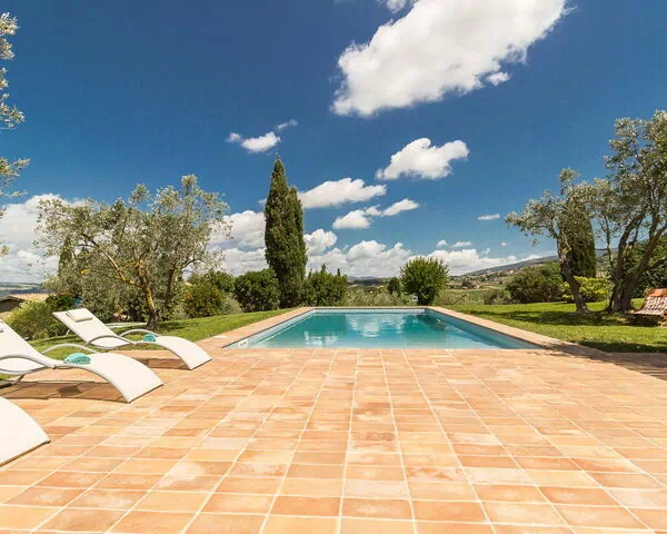 Het privézwembad meet 12 x 6 meter met een diepte van 60 tot 170 centimeter en biedt uitzicht over de omliggende heuvels; ligbedden en parasols staan ter beschikking van de gasten. De tuin is zorgvuldig onderhouden en bevat olijfgaarden en overvloedige begroeiing die het landgoed karakteriseren. 2 overdekte buitenruimten zijn voorzien van tafels, stoelen en buitenbanken, ideaal voor ontspanning of eten in de open lucht. Een barbecueplaats nodigt gasten uit om samen maaltijden in de open lucht te bereiden. De tennisbaan biedt mogelijkheden voor buitenrecreatie, terwijl de ruime loggia aan het hoofdhuis is ingericht met tuinmeubilair en een naadloze overgang schept tussen de binnenruimten en de natuurlijke omgeving.