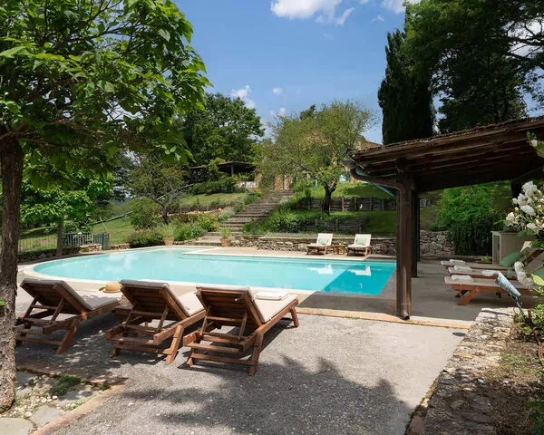 Het zwembad vormt het middelpunt van de buitenruimtes en biedt verkoeling op warme dagen, met uitzicht op de heuvels van Val d'Orcia en Val di Chiana. De uitgebreide tuin biedt voldoende ruimte voor ontspanning en buitenactiviteiten. Een tennisbaan voegt een recreatieve dimensie toe aan het verblijf. De goed onderhouden gronden creëren een harmonieuze omgeving waar gasten in volledige privacy kunnen ontspannen.