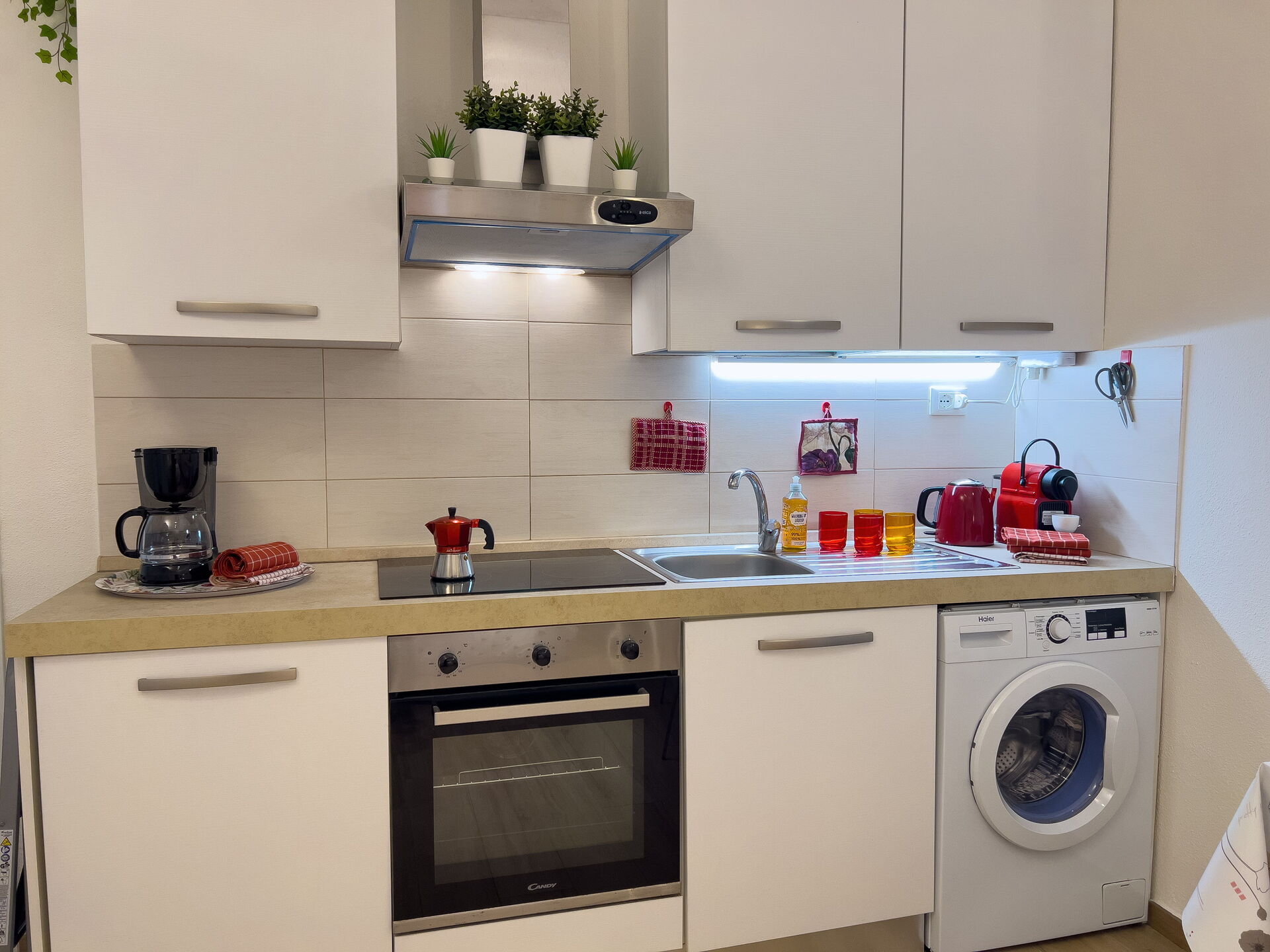 Keuken uitgerust met inductiekookplaat, oven, Nespresso-apparaat, filterkoffiezetapparaat, waterkoker; wasmachine.