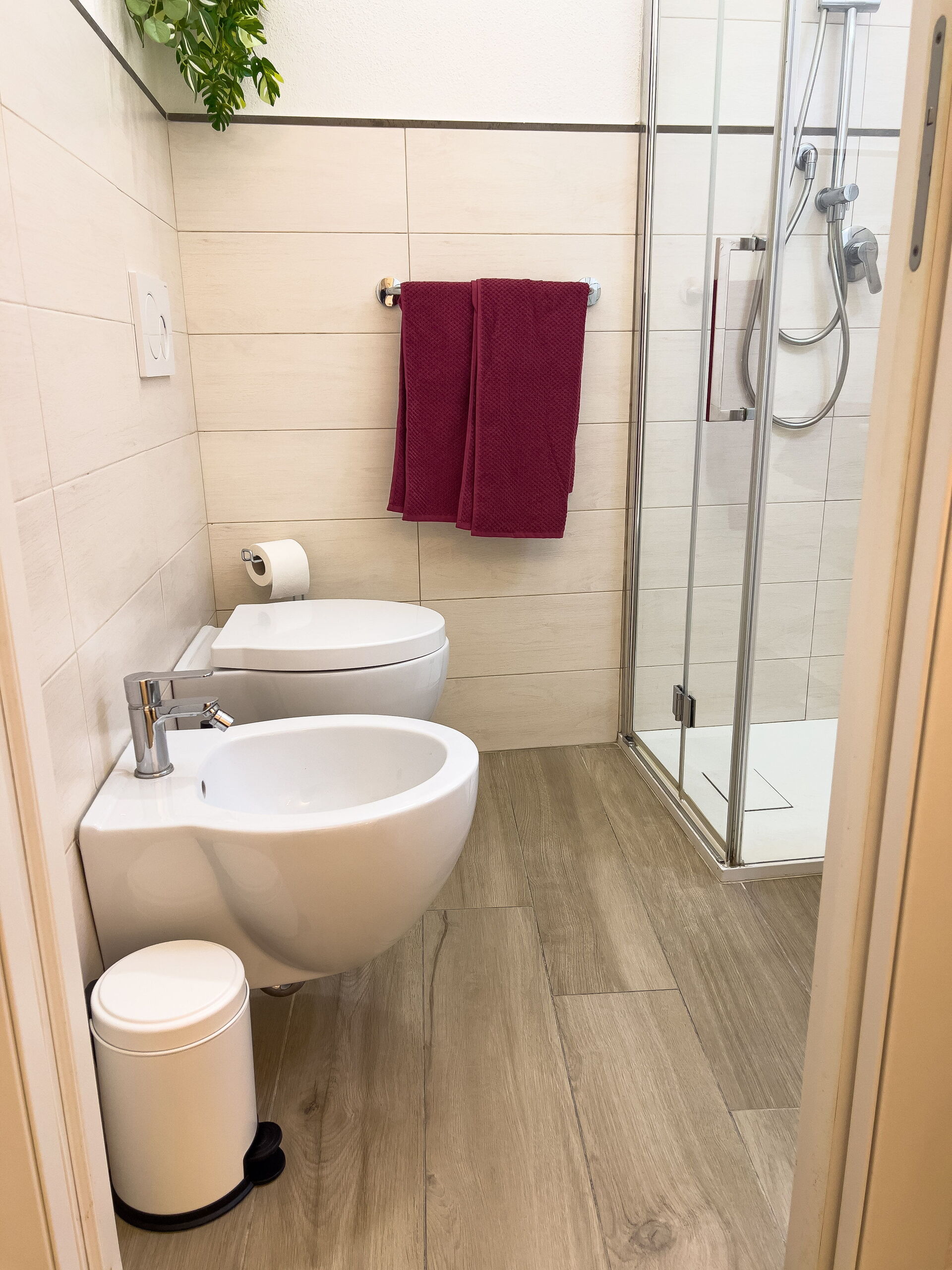Badkamer met douche, toilet, bidet, wastafel en föhn.
