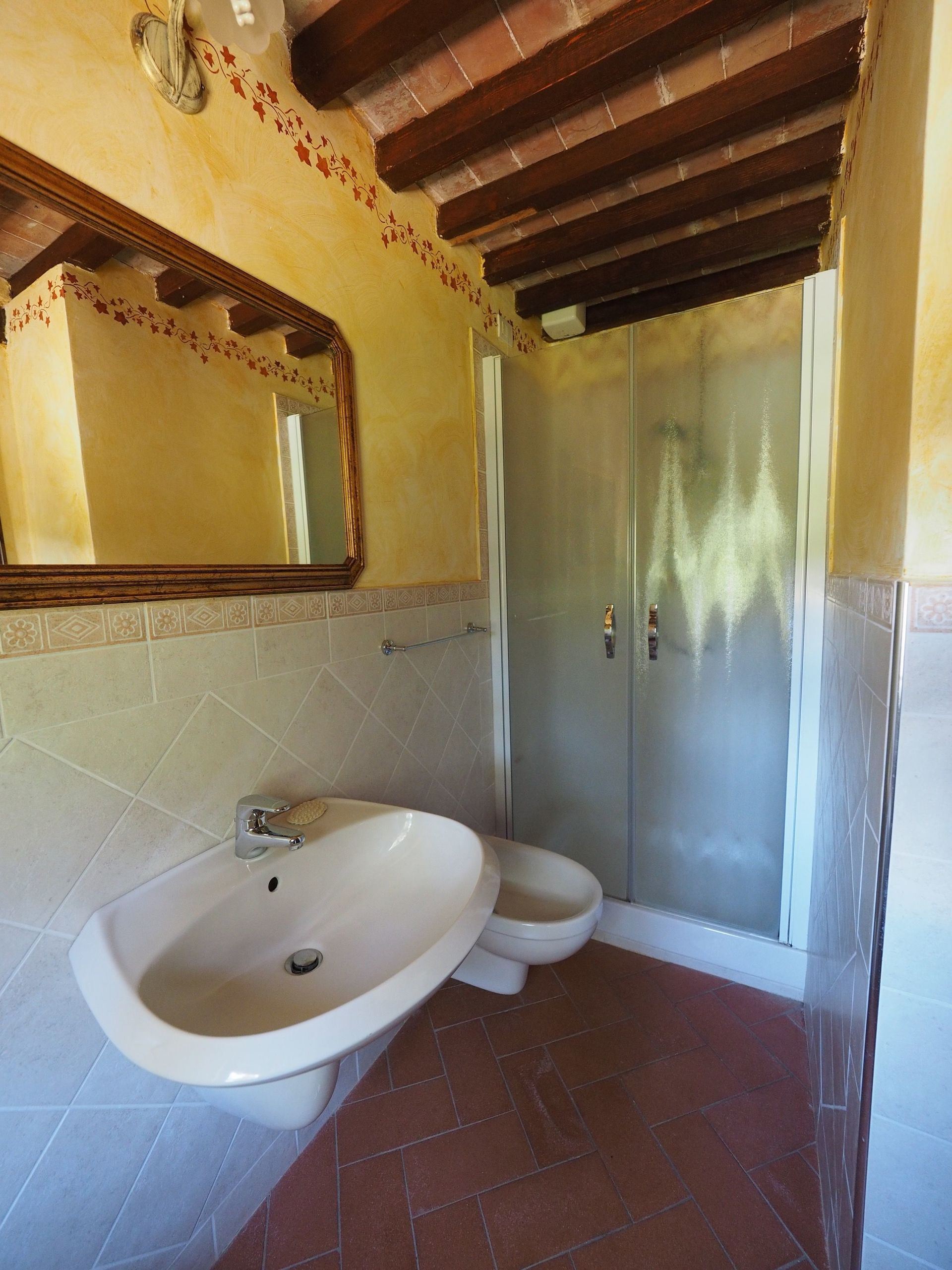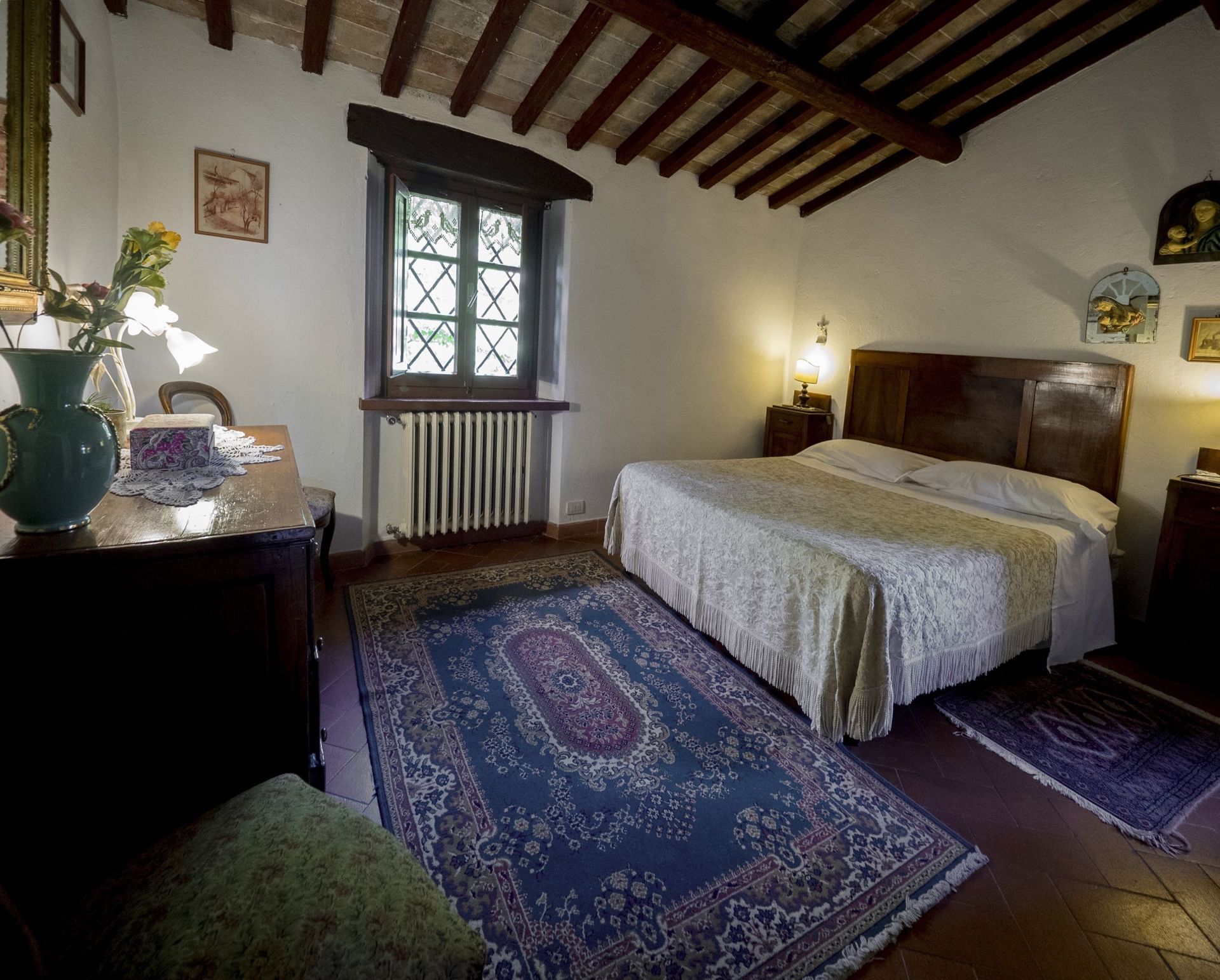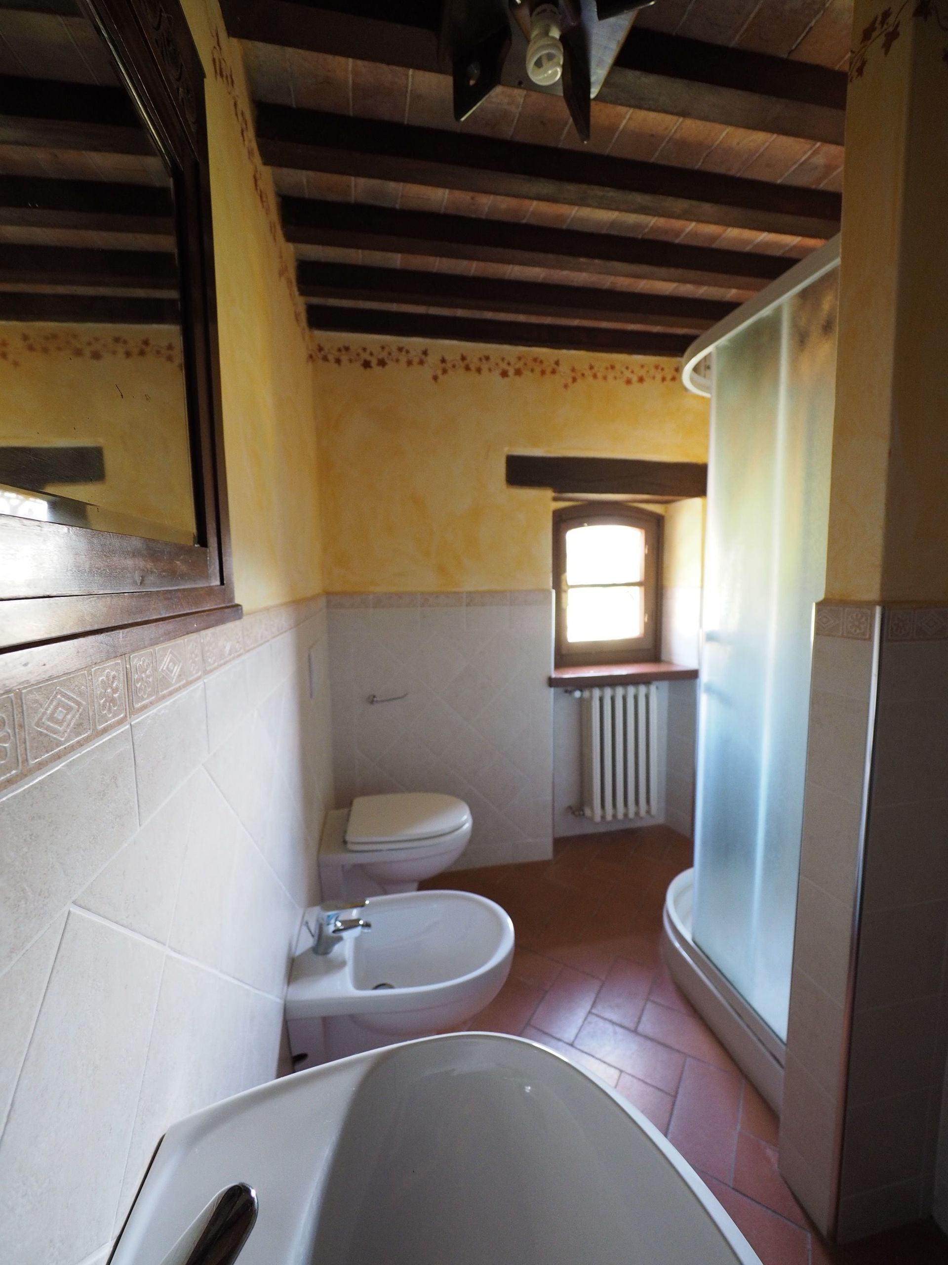 1° verdieping: grote slaapkamer met tweepersoonsbed met antieke meubels en open haard, badkamer met douche (2 wastafels) en klein balkon met mooi uitzicht, slaapkamer met 2 eenpersoonsbedden en badkamer met douche, slaapkamer met tweepersoonsbed met badkamer met douche.