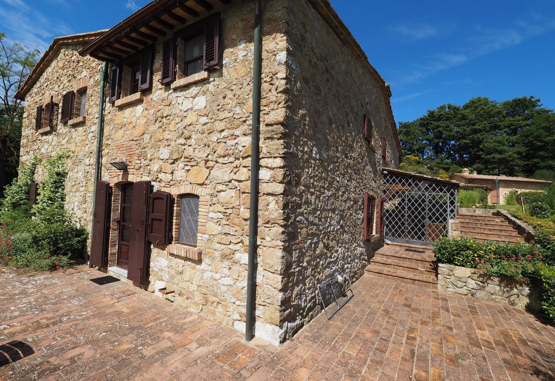 B.G.: ruime woonkamer met banken en fauteuils, mooie eetkamer, 3 treden hoger komt men in een ruime goed uitgeruste keuken (oven, diepvriezer, vaatwasser, broodrooster, koffiezetapparaat) met grote open haard ideaal voor het grillen, veranda gebruikt als bijkeuken en toegang tot een groot terras met tafel en stoelen. 2 treden hoger: toilette.