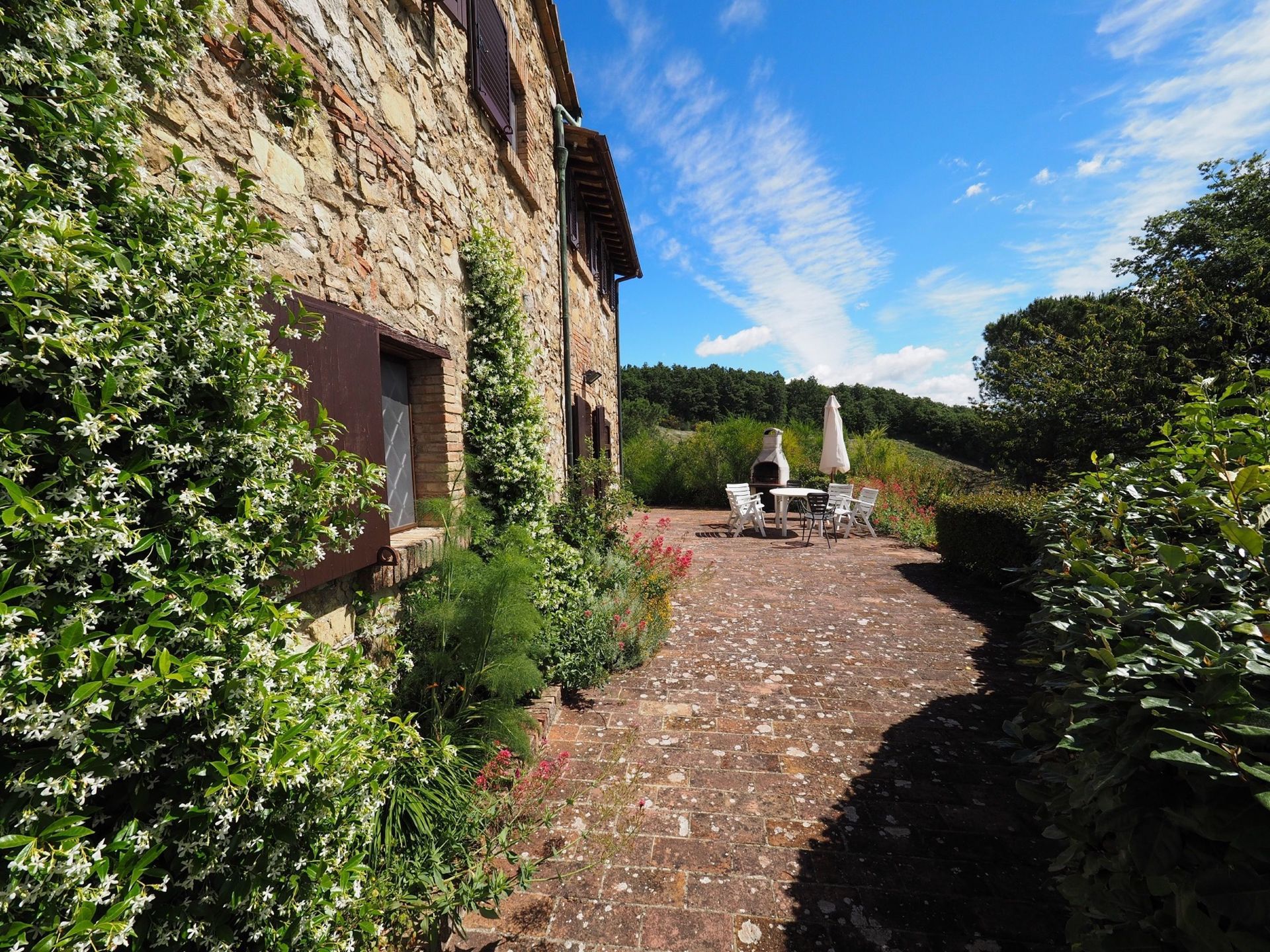 Eigen zitplaats buiten met barbecue.