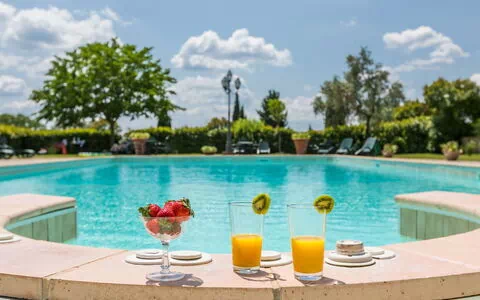 Het zwembad meet 18 x 8 meter met een diepte van 100 tot 150 cm en is beschikbaar van 4 mei tot 28 september; het wordt gedeeld door gasten van het complex. Een buitendouche bevindt zich in de buurt van het zwembad. De tuinen zijn voorzien van gedeeld tuinmeubilair dat comfortabele ruimtes biedt om te ontspannen en uit te kijken over het panoramische plattelandslandschap. Een gedeelde barbecueplaats is aanwezig voor buitendinen. De uitgestrekte gronden van het landgoed, die zich uitstrekken over 100 hectare, bieden voldoende ruimte voor ontspannende wandelingen en een authentieke verbinding met de werkende boerderij.