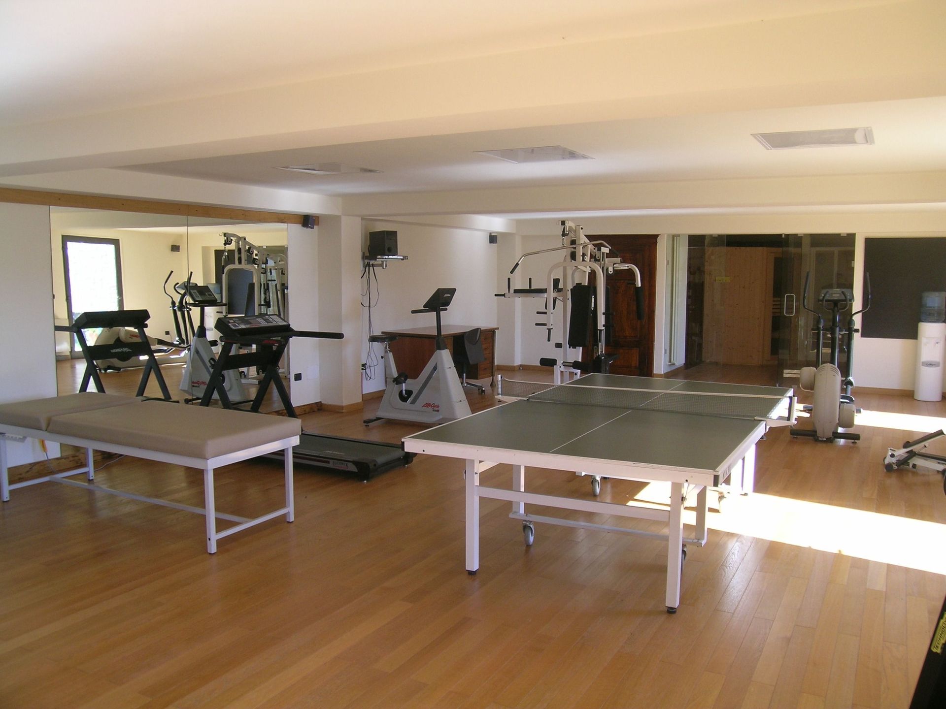 Benedenverdieping: lichte en goed uitgeruste fitnessruimte met douche en sauna.