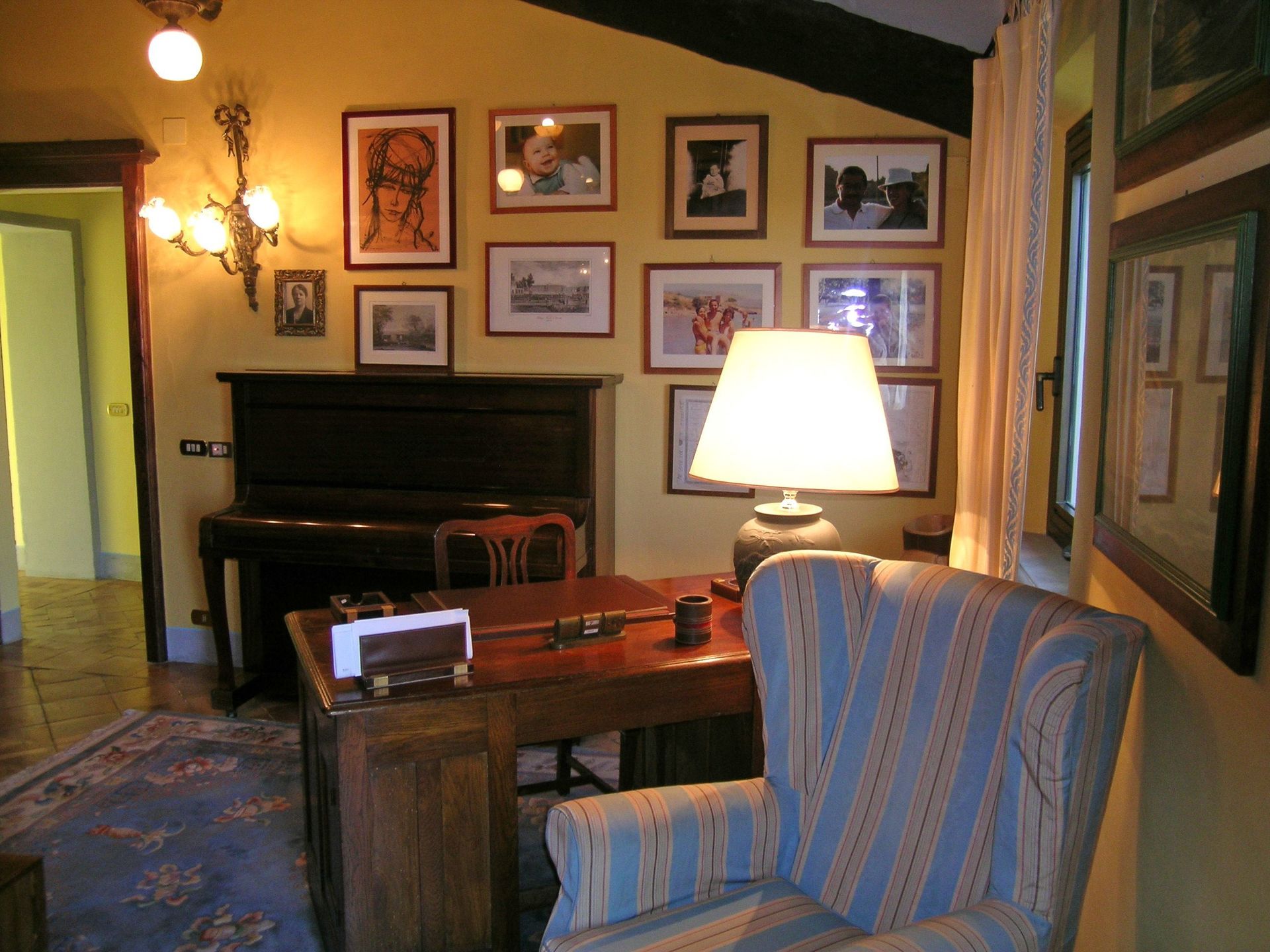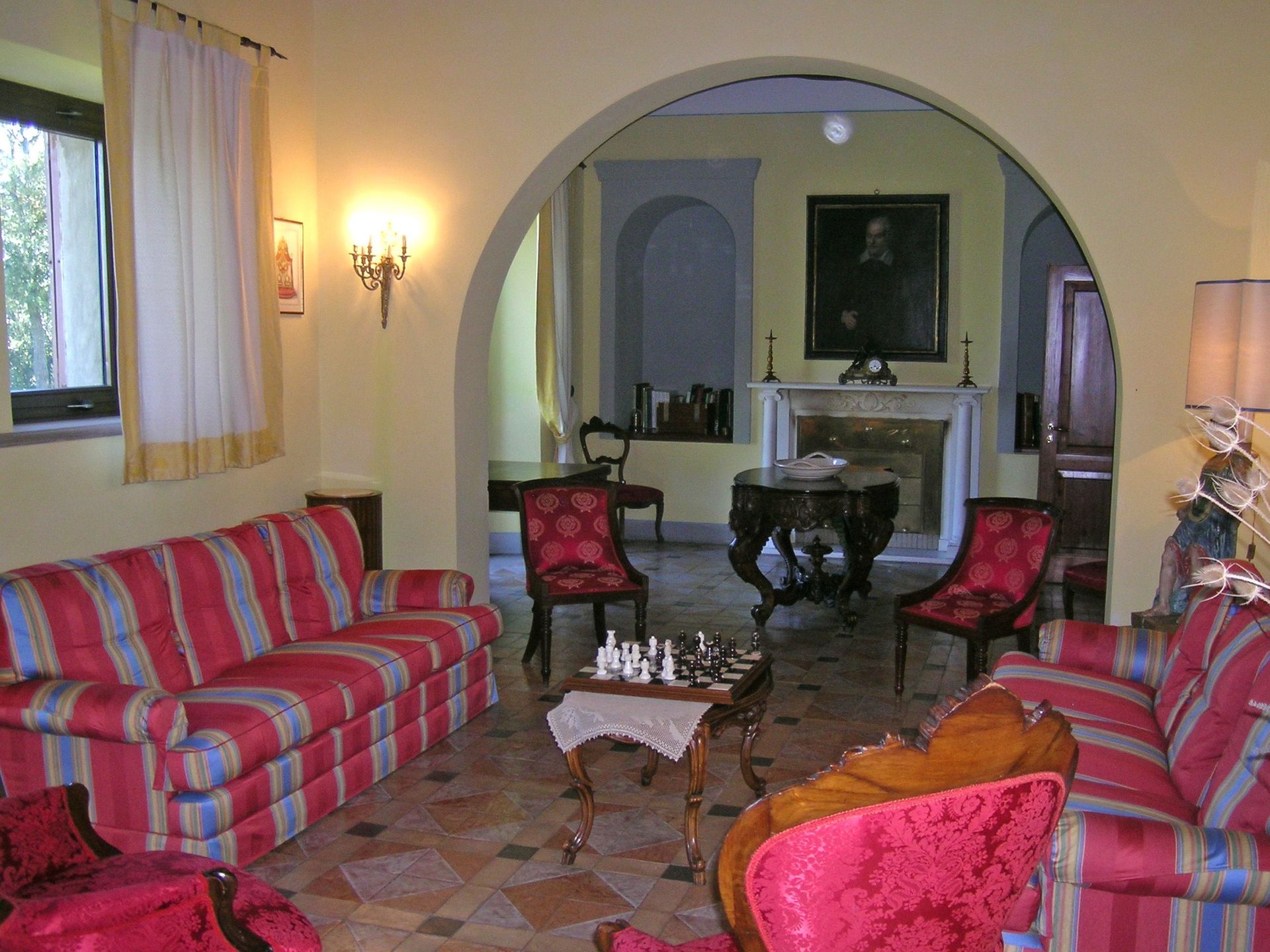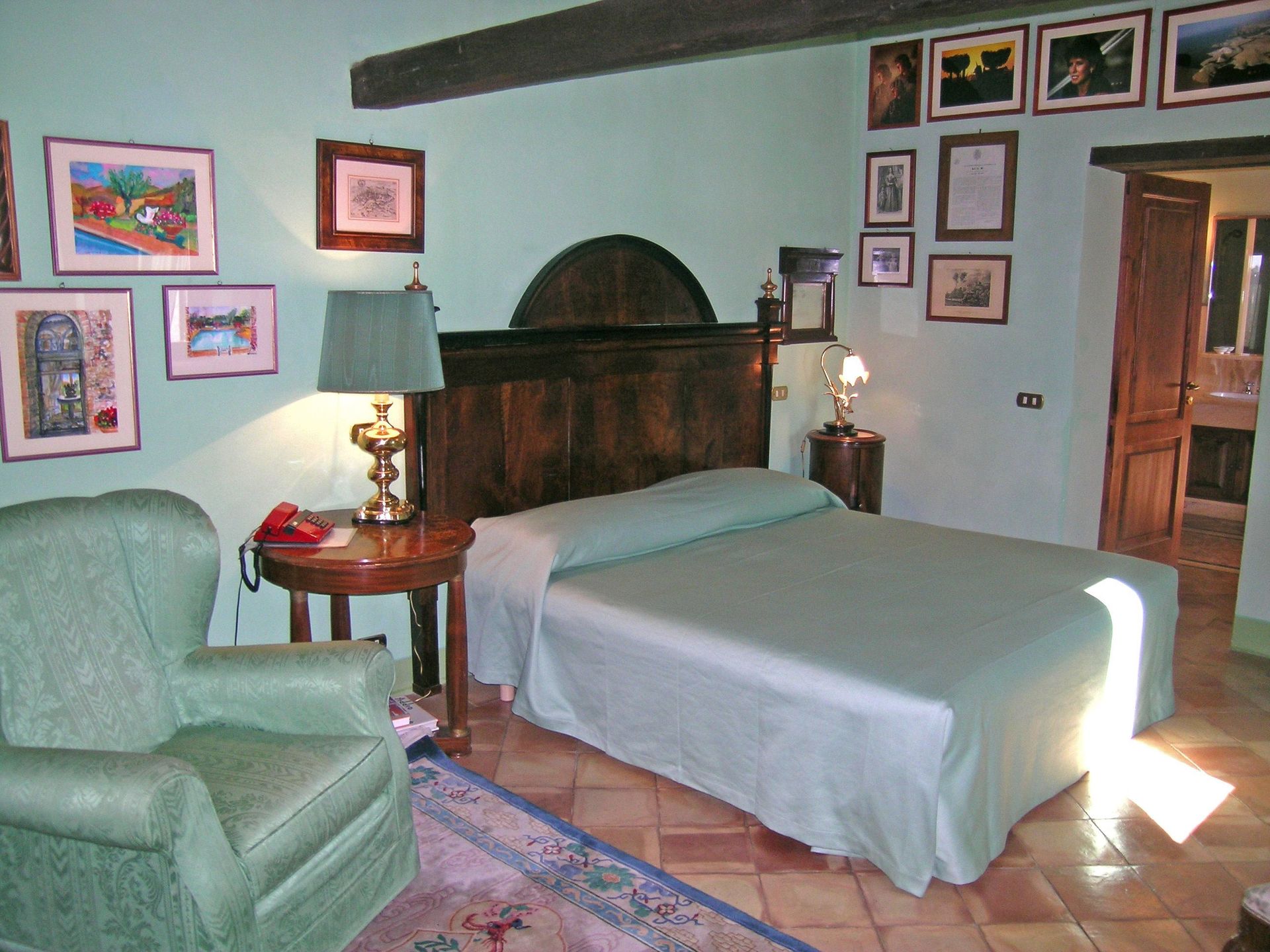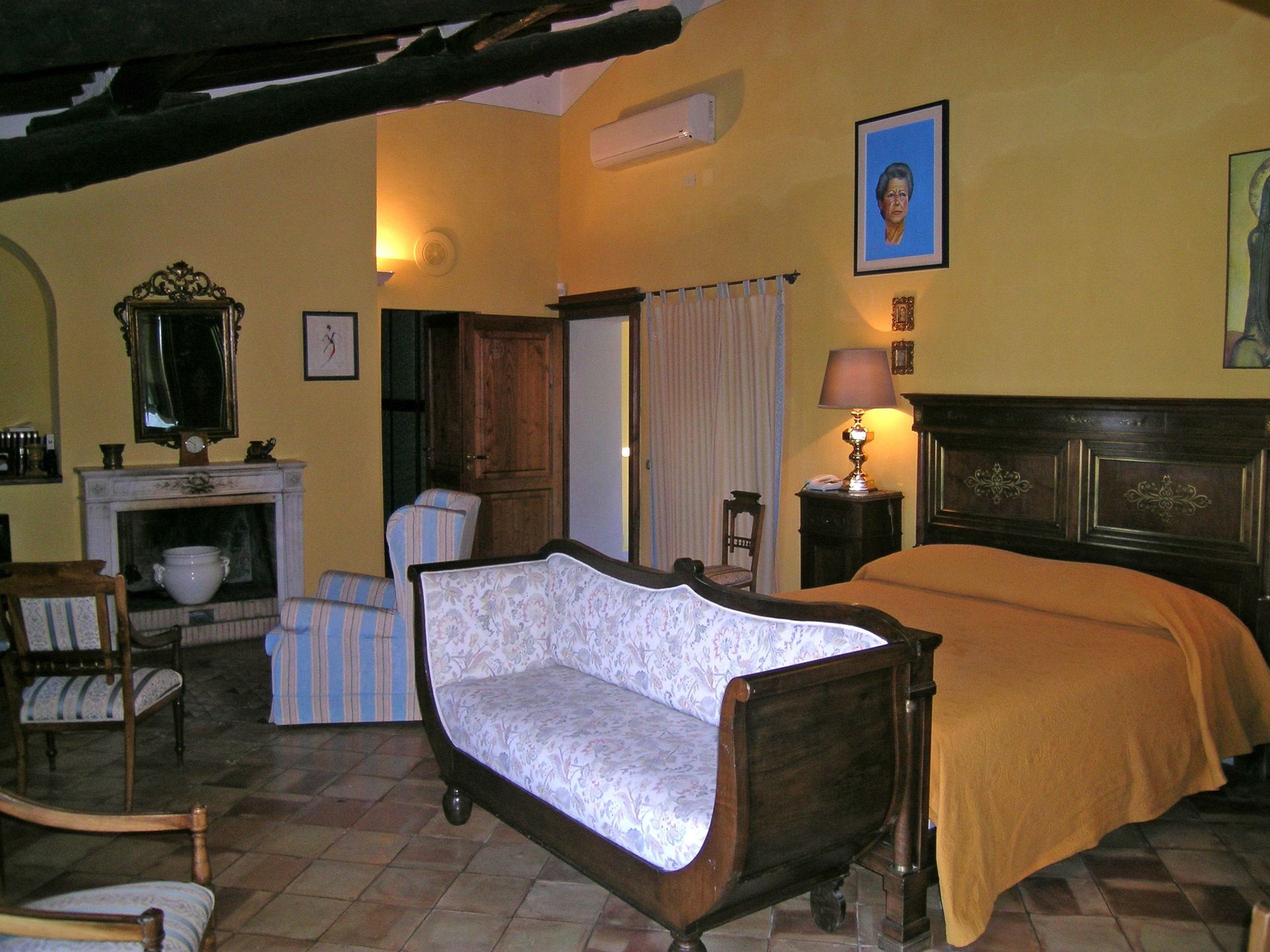 1° verdieping: grote en lichte woonkamer (sat-TV, computer met internetverbinding en fax), grote suite met tweepersoonsbed met zithoek, open haard, sat-TV, toegang tot een kamer met piano, garderobe en grote eigen badkamer met hydromassage hoekbad, slaapkamer met tweepersoonsbed met open haard en eigen badkamer met bad, slaapkamer met tweepersoonsbed met eigen badkamer met hydromassage douche, 4 slaapkamers met tweepersoonsbed, 2 badkamers elk met bad (zonder raam).