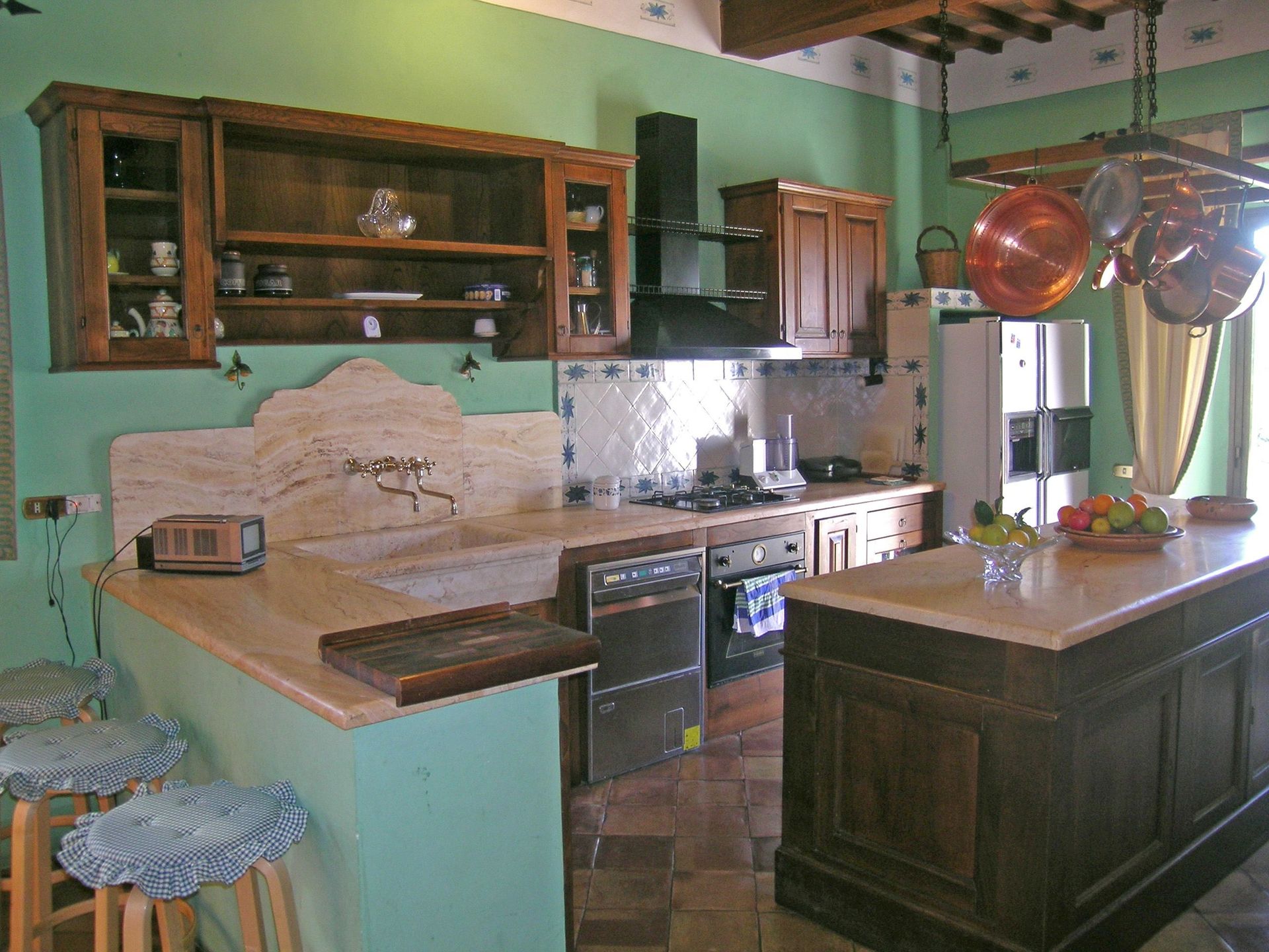 B.G.: ingang die doorloopt op de binnenplaats, ruime woonkamer met open haard, biljarttafel en toegang naar buiten en naar de binnenplaats, zitkamer met toegang naar buiten, eetkamer met toegang naar de binnenplaats, grote keuken (oven, diepvriezer, vaatwasser) met open haard, antieke oven voor het brood en toegang naar buiten, WC, wasruimte (2 wasmachines en wasdroger). Kleine kelder in het souterrain.