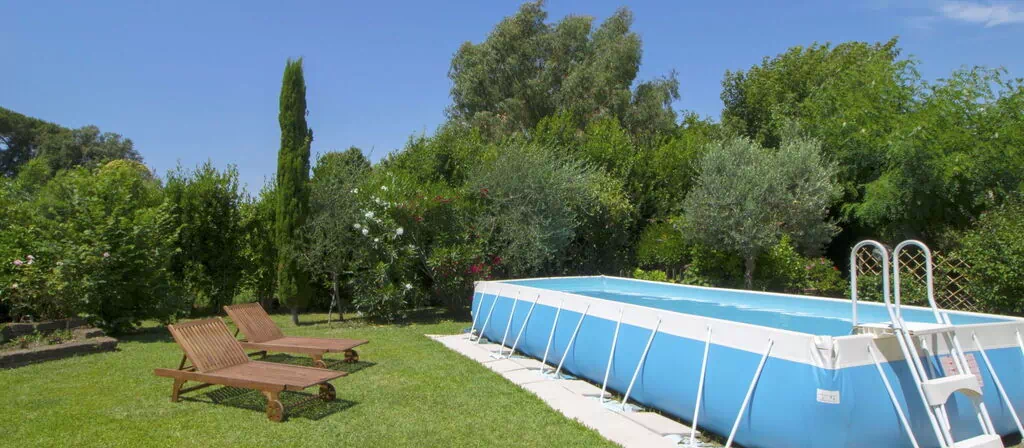De tuin van 900 m² is volledig omheind en voorzien van een nette gazon en een natuurlijke wildtuinzone. Het privézwembad is een bovengronds zwembad van 5 x 2 meter met een diepte van 122 cm, beschikbaar van 1 mei tot 30 september. Een terras met tuinmeubilair biedt een comfortabele plek voor ontspanning en gezelligheid; een barbecueplaats is eveneens aanwezig.