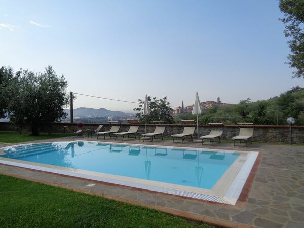 The beautiful swimming pool in a natural terrace. In front of the house, on a natural terrace overlooking the valley and the Medieval town of Castiglion Fiorentino, there is a garden where a pool with hydro massage corner, (size 4 x 8 m, depth 1,20-1,80 m), a play area for children and table tennis are available for the exclusive use of the guests.