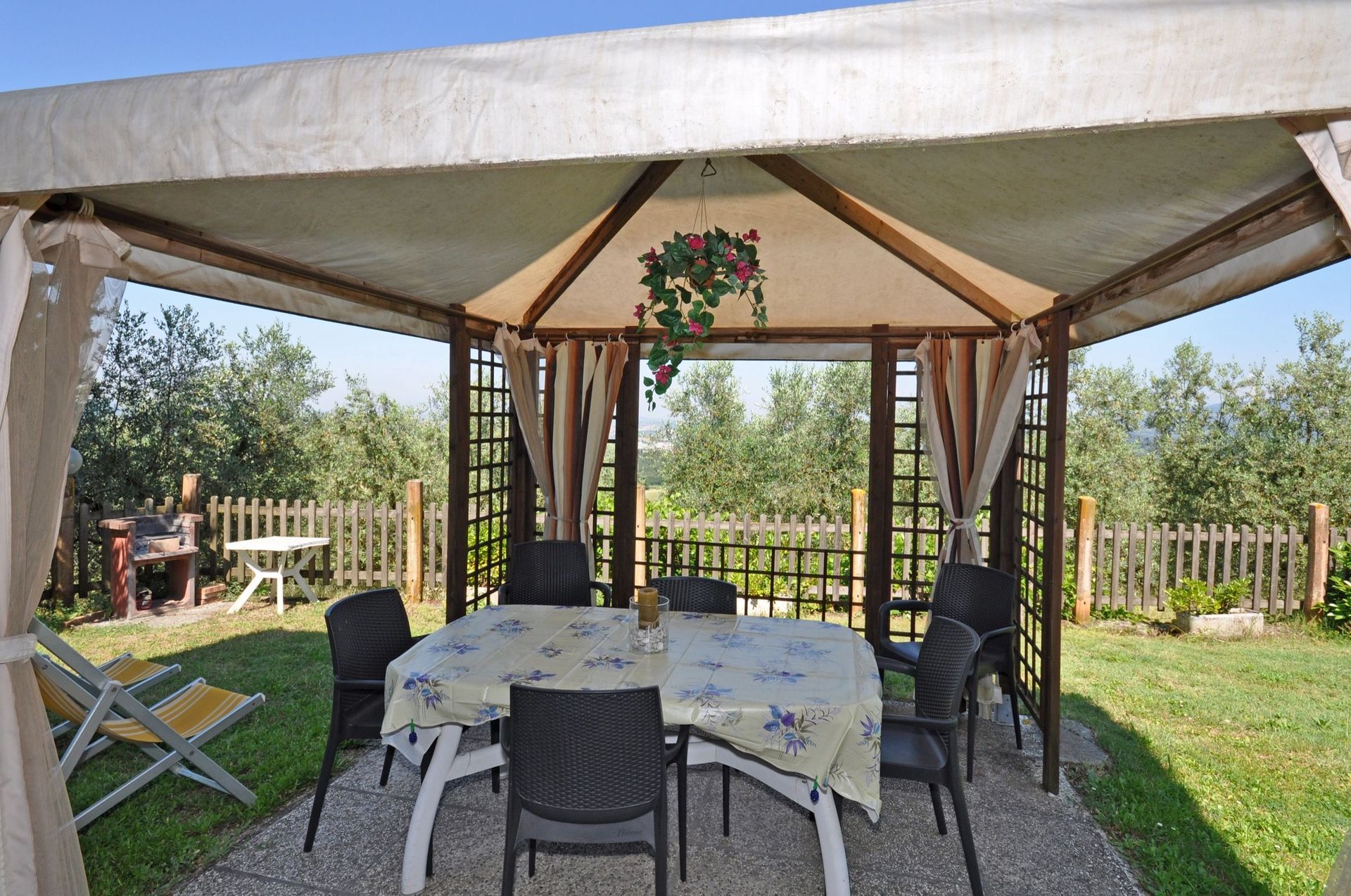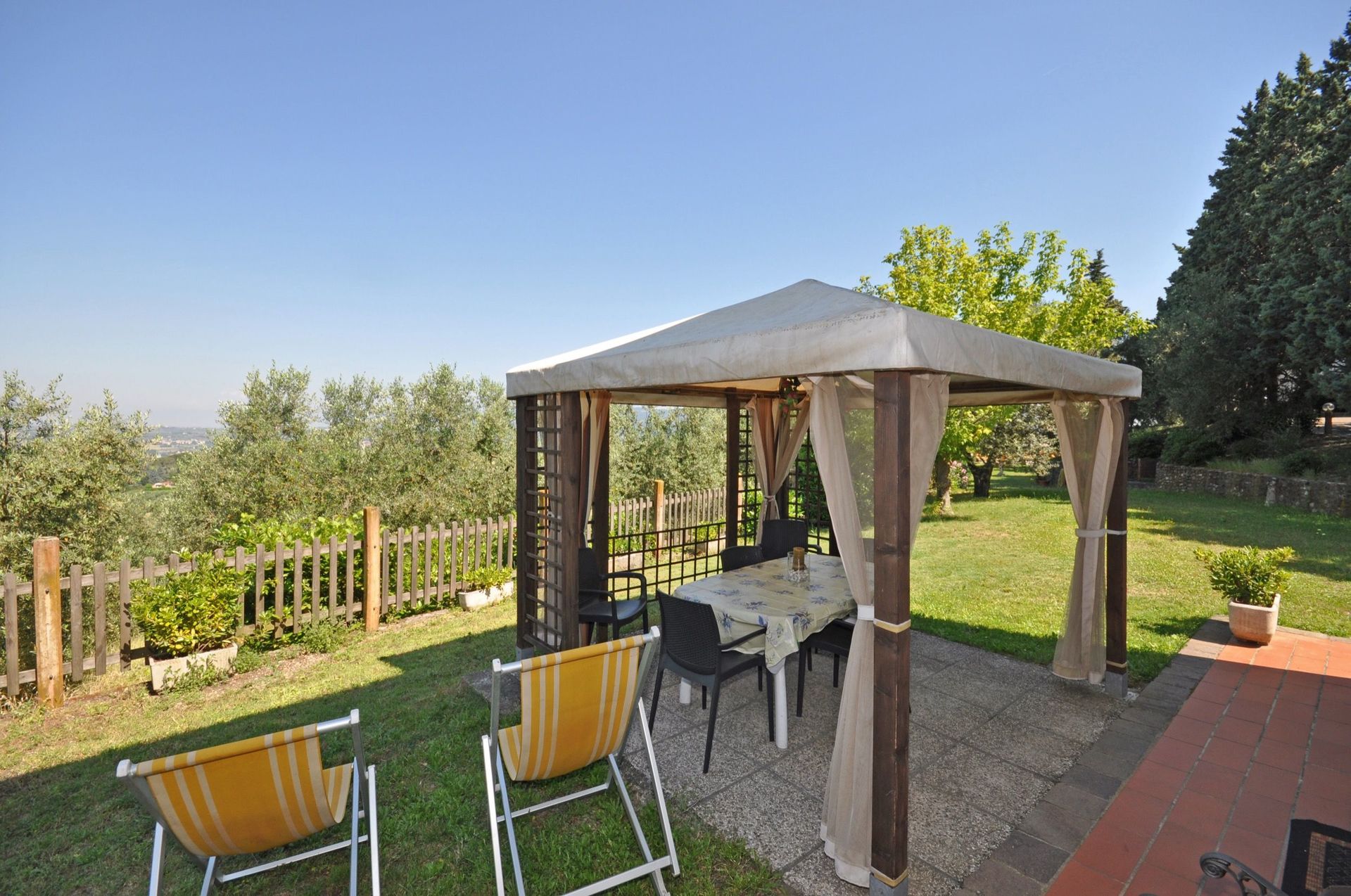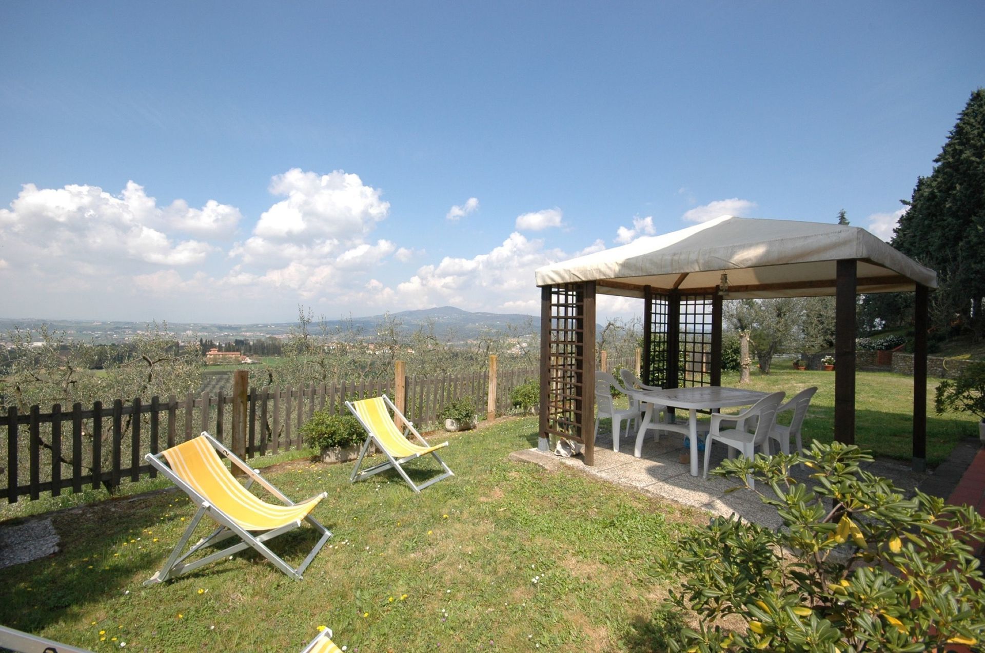 Eigen zitruimte buiten (gras) met prieel, barbecue en mooi uitzicht over de Arno vallei.