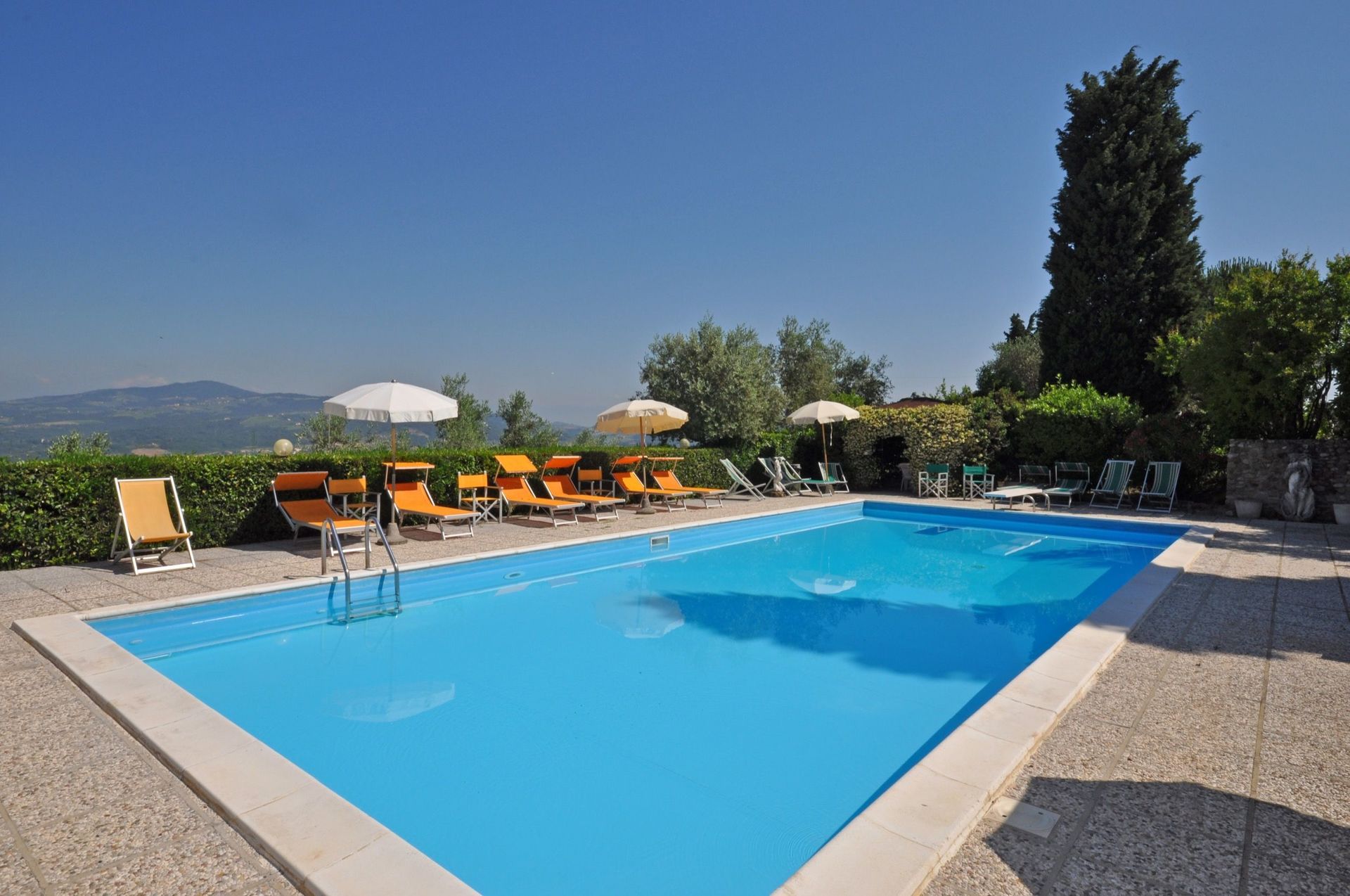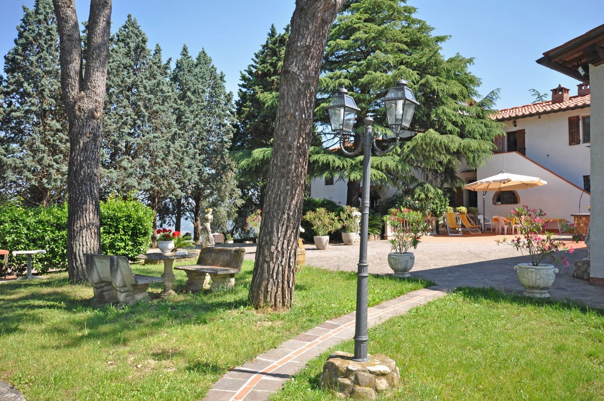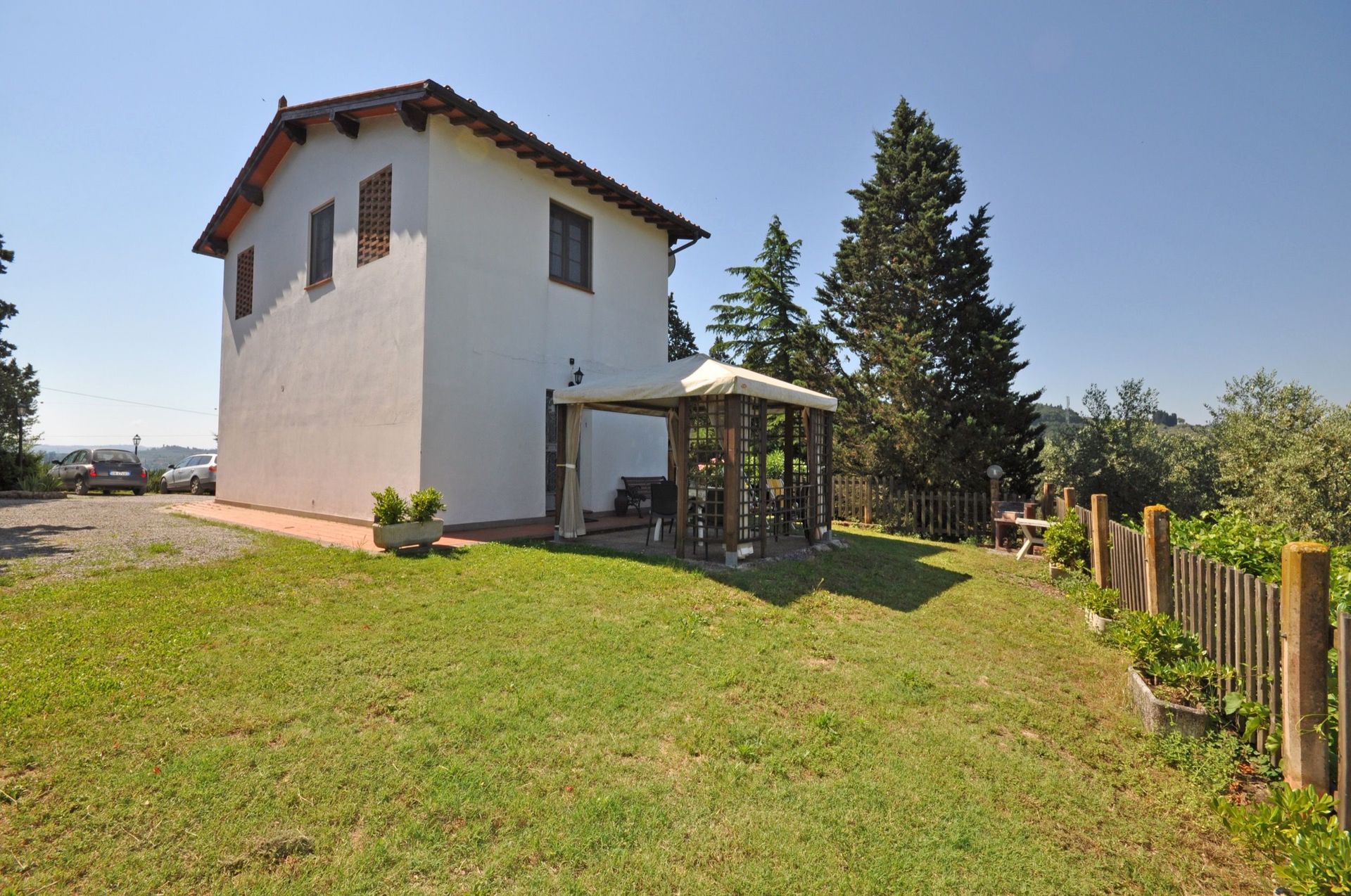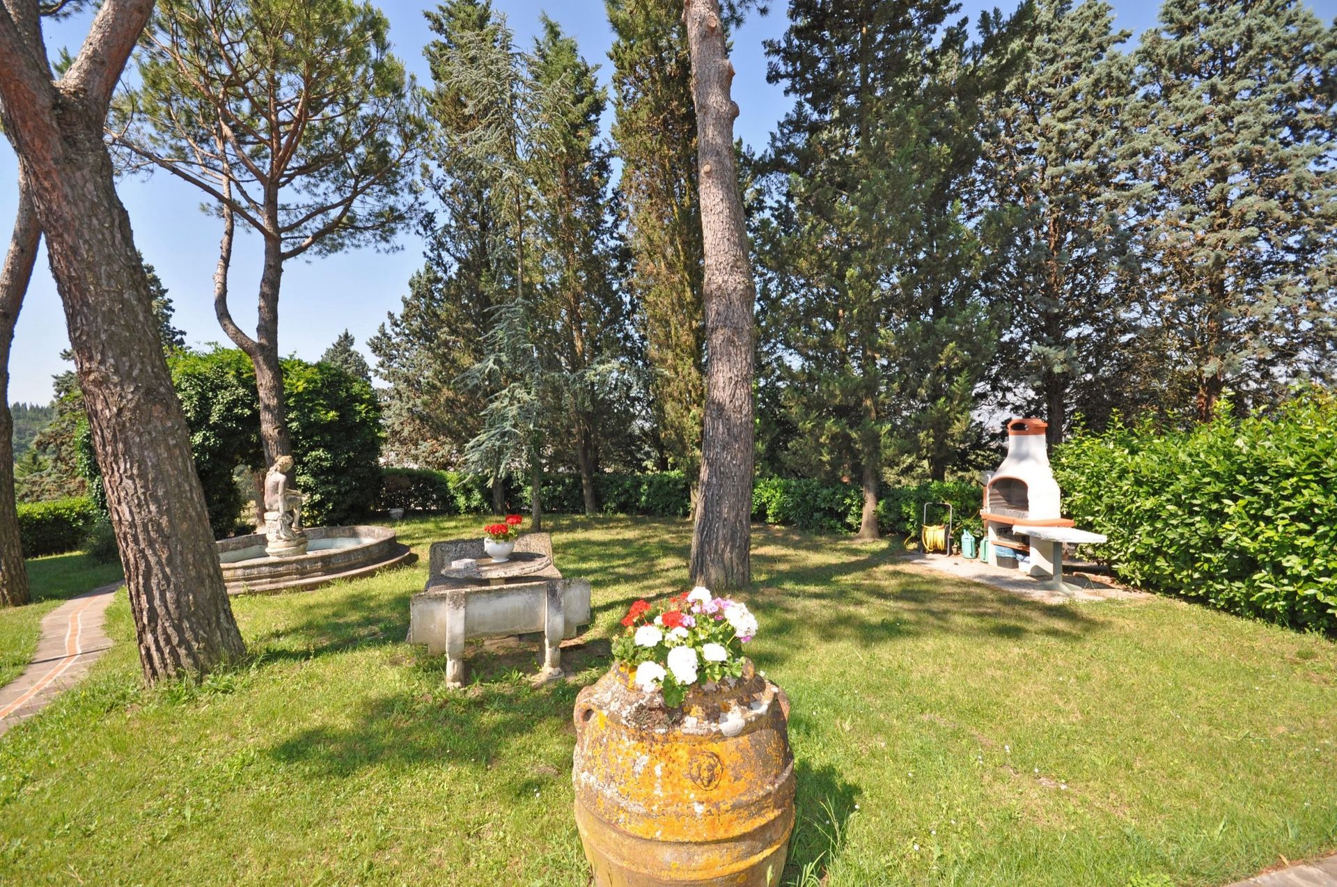 Eigen zitruimte buiten (gras) met prieel, barbecue en mooi uitzicht over de Arno vallei.