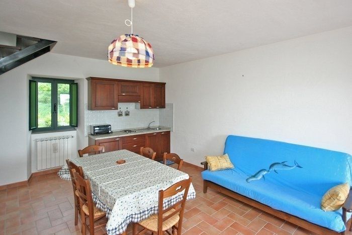 1e verdieping: woonkamer (TV) met een tweepersoons sofa-bed, eetgedeelte en keukenhoek.