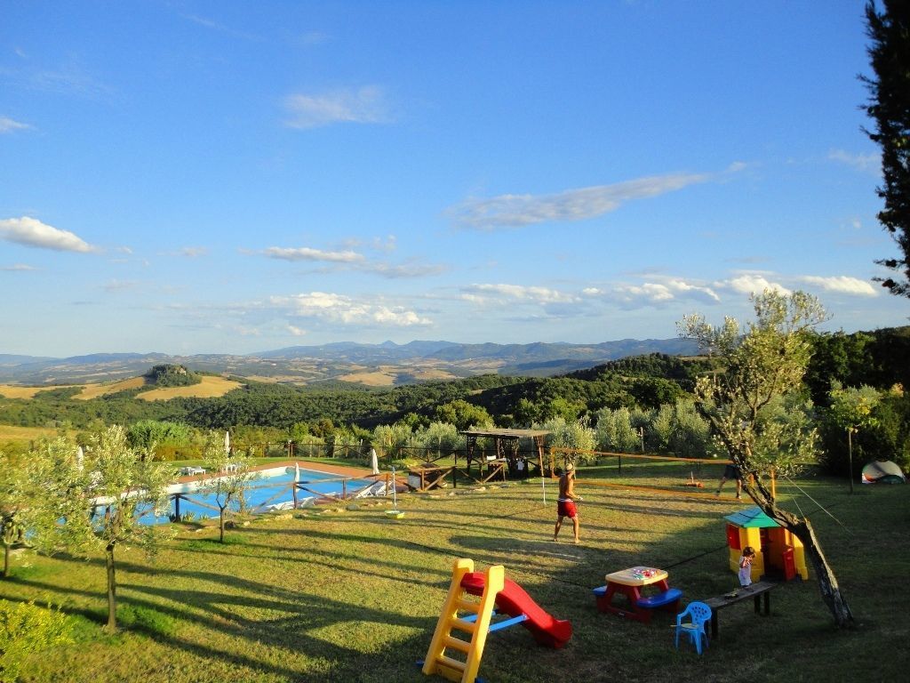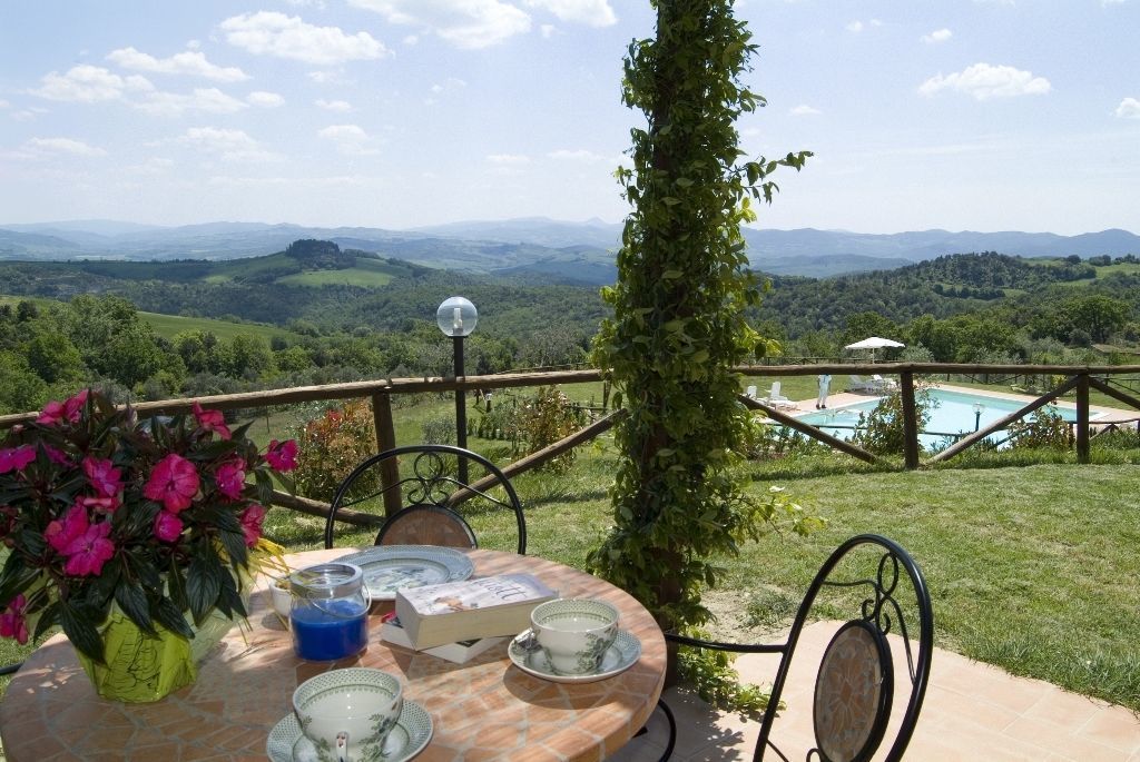 Private terrace with pergola enjoying a marvellous panorama and furnished with table and chairs.