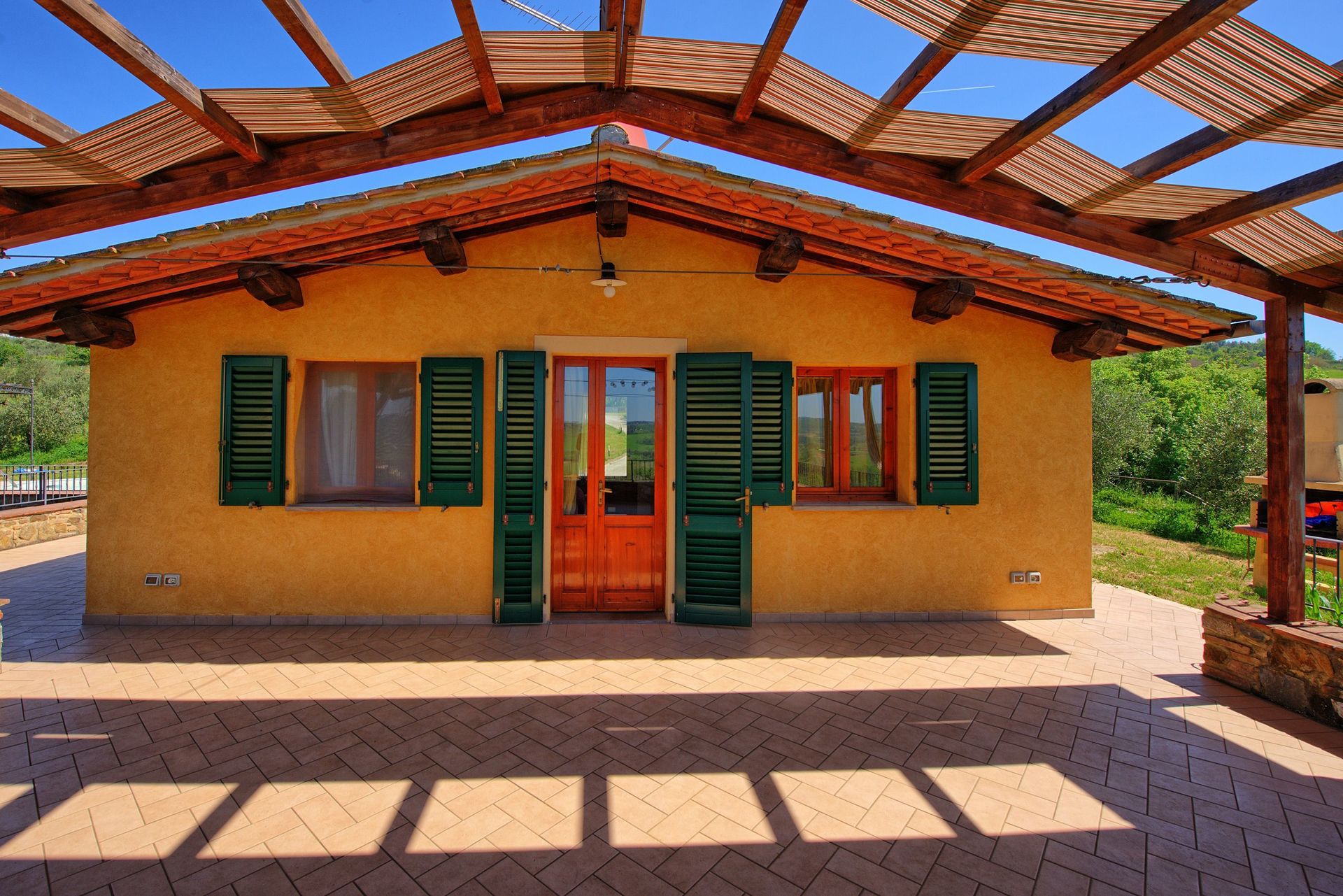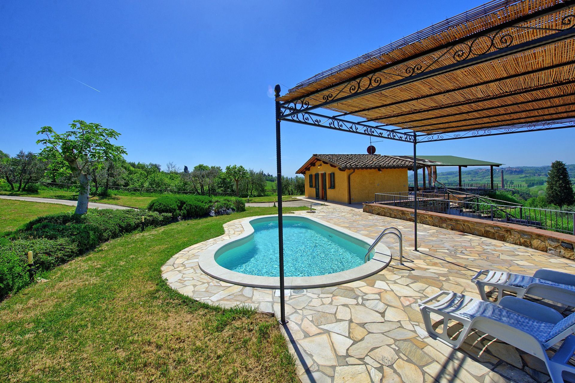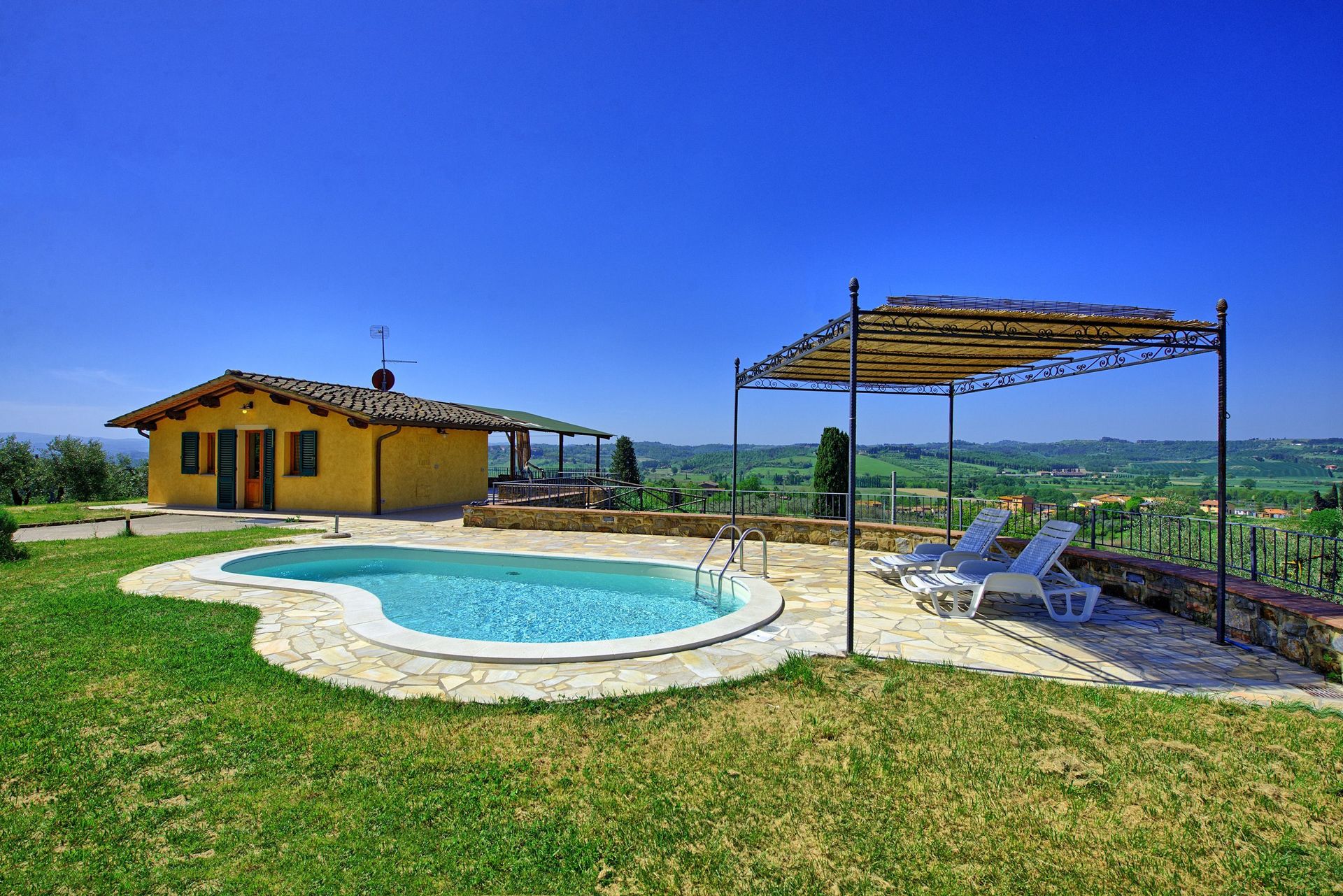 Ter beschikking van de gasten: gemeubileerde tuin met een privé zwembad (in de vorm van een boon 7 x 3 m – diepte 1,2 m – geopend van 01/04 tot 30/10, barbecue, groot gemeubileerd terras met een gazebo, tafel en stoelen om buiten te kunnen eten en een mooi panoramisch uitzicht dat uitkijkt van Monte Serra tot de torens van San Gimignano.