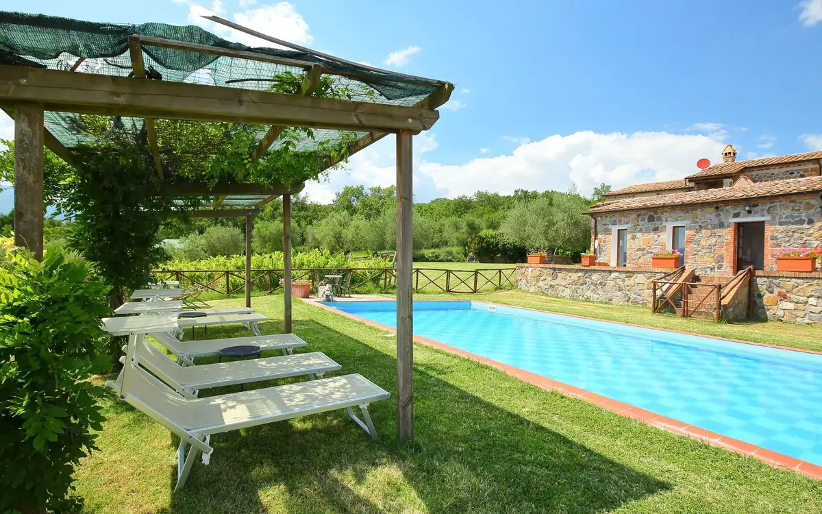 Landhuis "Val d'Orcia", 580 m boven zeeniveau, vrijstaand, omgeven door velden en wijngaarden. Beneden Radicofani, zonnige ligging op een heuvel, te midden van groen. Voor alleengebruik: terrein 1 ha (omheind), tuin op verschillende niveaus, 300 m2 met bloemen, openluchtzwembad geen inkijk (6 x 12 m, 120 - 150 cm diepte, seizoensgebonden beschikbaarheid: 01.Mei. - 15.Okt.). Douche/WC bij het zwembad, tafeltennis, patio, prieel (40 m2), tuinmeubelen, barbecue (glijbaan, schommel). In het huis: internetaansluiting, hot tub, ontspanningsruimte, air-conditioning, alarmsysteem, wasmachine, fietsverhuur. (extra). Kok op verzoek (extra). Parkeerplaats op het terrein. Levensmiddelenwinkel 3 km, restaurant 3 km, bushalte 100 m, thermaalbad "Bagni di San Filippo" 12 km. Attracties in de buurt: San Casciano Dei Bagni 20 km, Vivo D'orcia 20 km, Bagno Vignogni 28 km, Castiglion D'orcia 30 km, San Quirico D'orcia 31 km, Pienza 35 km. Auto noodzakelijk. Geschikt voor families, baby uitrusting op aanvraag. De eigenaar accepteert geen jeugdgroepen. Gesloten residentie met een elektrische deur. De eigenaar biedt gasten een gratis wijnproeverij aan in zijn wijnkelder. Het is ook mogelijk om paardrijtochten of wandelingen te reserveren, op voorafgaand verzoek en afhankelijk van beschikbaarheid (betaling ter plaatse).