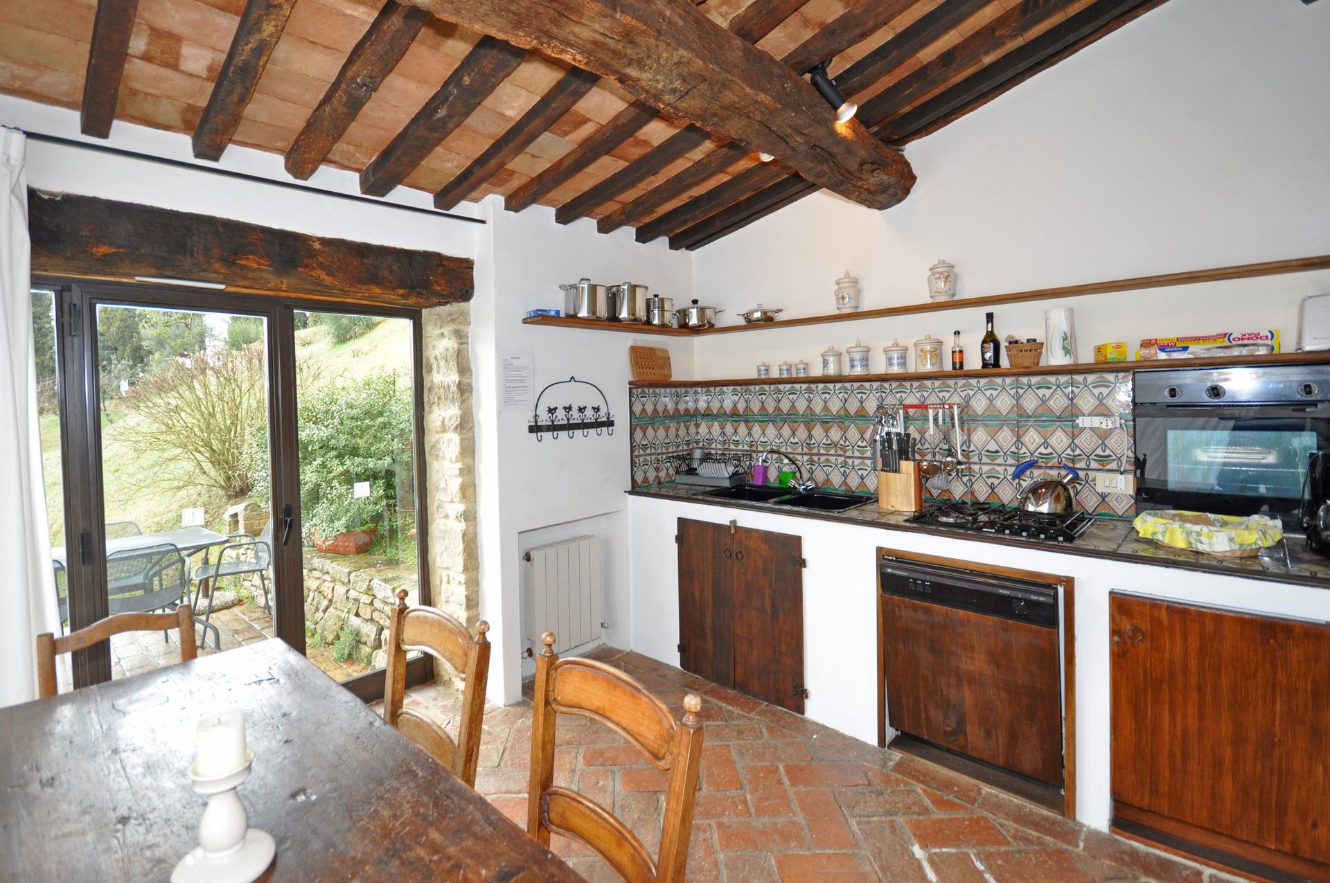 B.G.: woon/eetkamer met open haard en keukenhoek (oven, vaatwasser, magnetron, broodrooster, koffiezetapparaat, moka-koffiepotje) en toegang tot een eigen gemeubileerde buitenruimte, slaapkamer met tweepersoonsbed met eigen badkamer met douche.