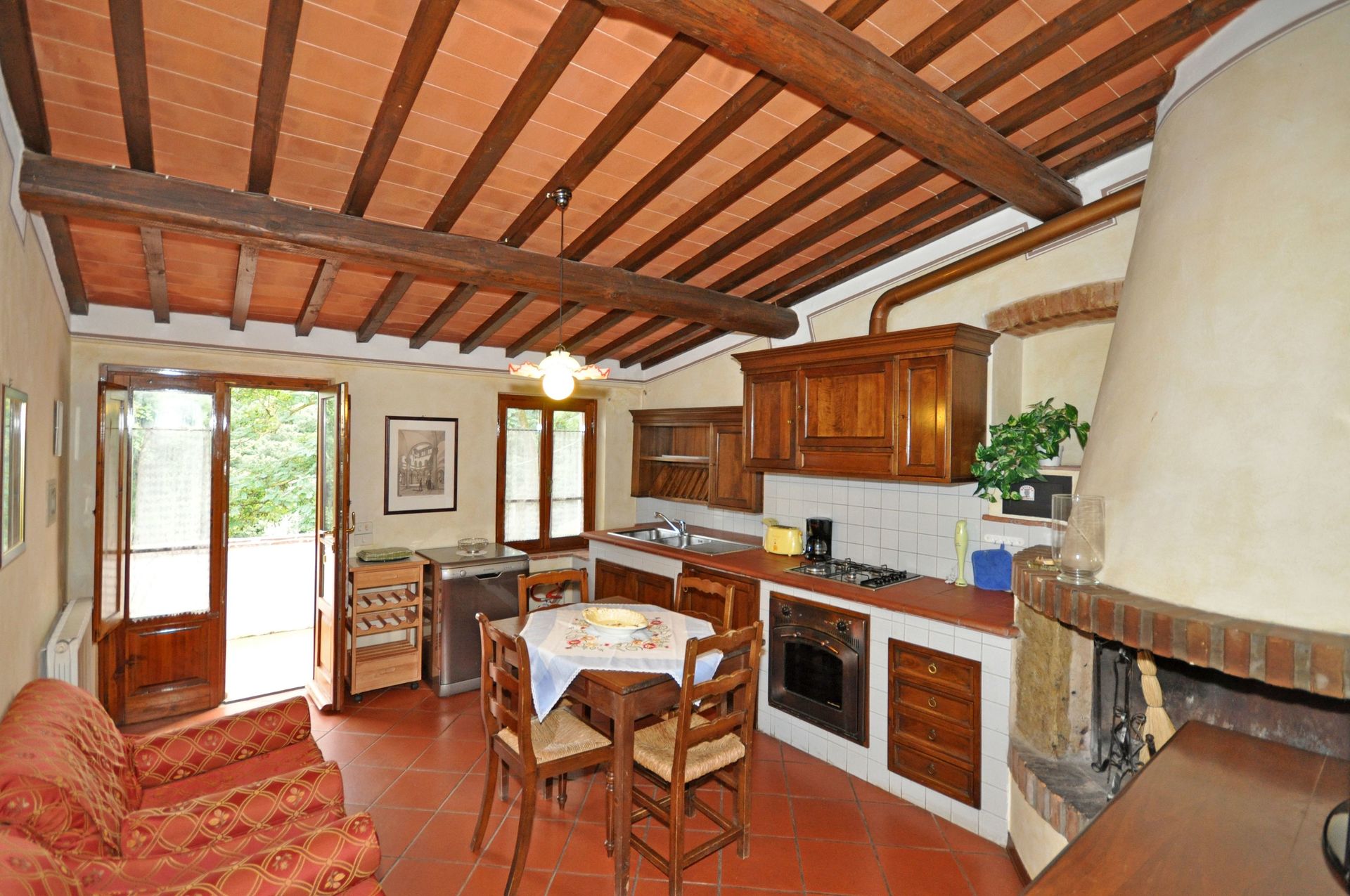 1° verdieping: woon/eetkamer met open haard en keukenhoek (oven, kleine vriezer, vaatwasser), badkamer met douche, slaapkamer met tweepersoonsbed met eigen badkamer met douche, slaapkamer met 2 eenpersoonsbedden.