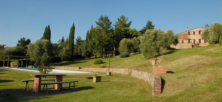La Capanna has an expansive terrace, suitably furnished for al fresco dining. The large swimming pool is set on a lower grass terrace, surrounded by olive groves where there are splendid views over undulating countryside towards Siena. .