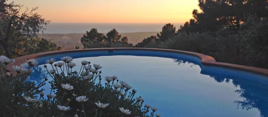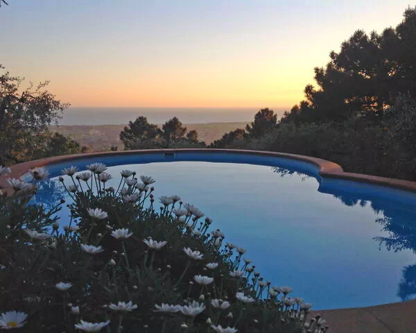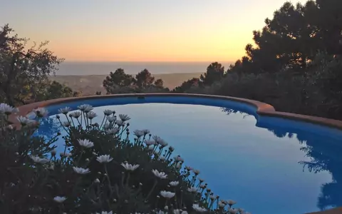 De tuin is rijk begroeid met bloeiende planten en volwassen bomen en omgeeft het pand aan alle zijden. Het terras is voorzien van comfortabel tuinmeubilair en biedt een ideale plek voor koffie 's ochtends, ontspannen lunches of avondbijeenkomsten onder de open hemel. Een barbecuehuis voegt een gezellige dimensie toe aan het buitendinen en biedt gasten een beschutte en goed uitgeruste ruimte voor het bereiden en nuttigen van maaltijden in de frisse lucht. Het zwembad meet 5 x 8 meter en vormt het middelpunt van de buitenruimte; het nodigt uit tot afkoeling en ontspanning terwijl gasten genieten van het uitzicht op de heuvels.